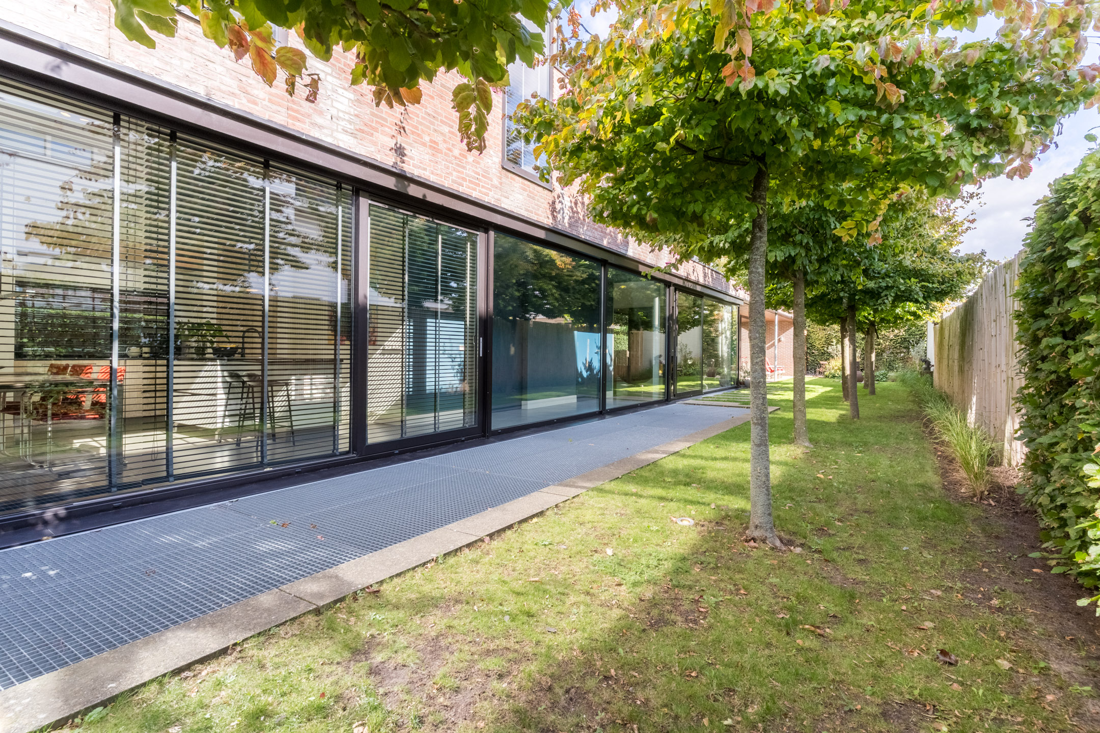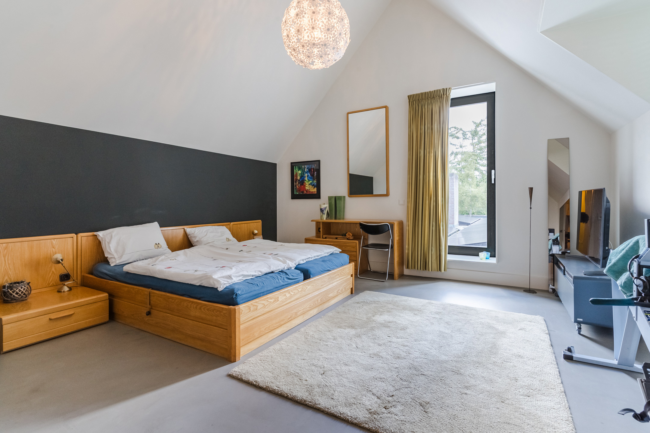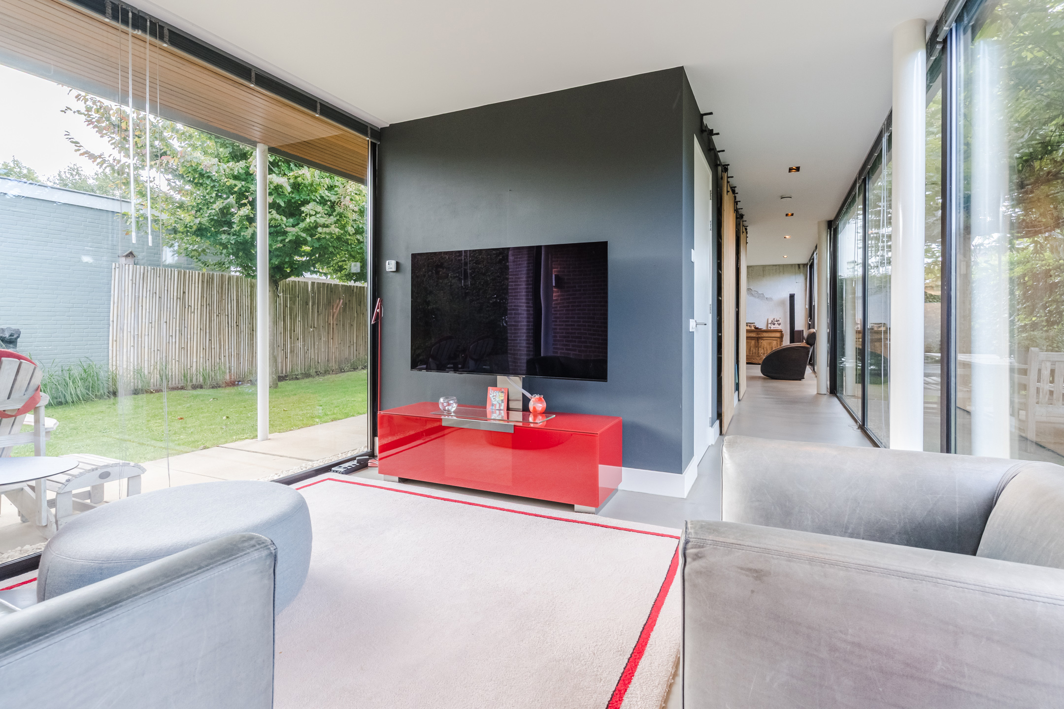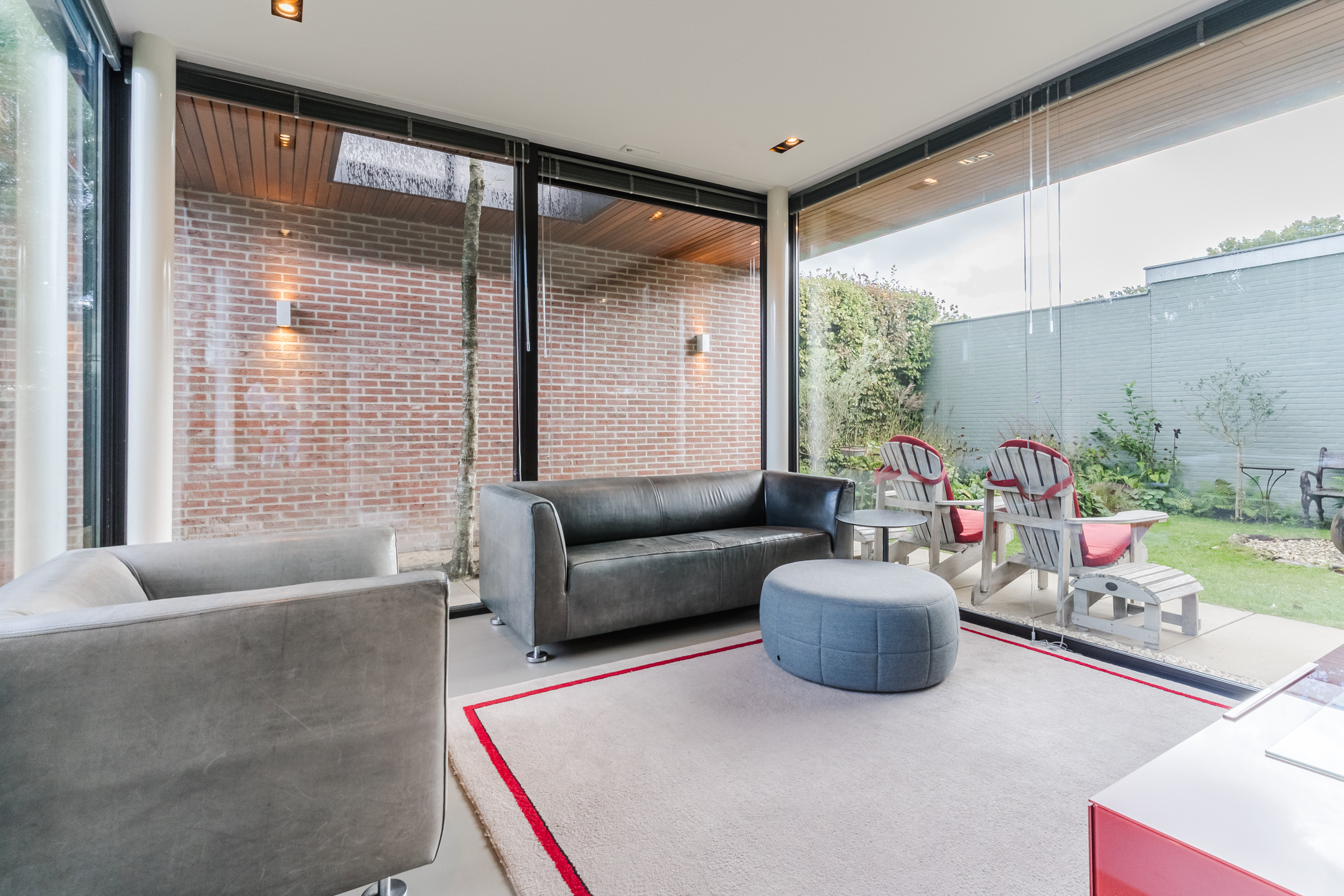 The home is modern, bold, and architect-designed (by JMW Architects). The layout creates a loft-like feel, with open flowing spaces and seamless indoor-outdoor connections thanks to the extensive glass facades throughout. Comfort is also maximized — this home offers a pleasant indoor climate year-round, thanks to a ground-source heat pump and electric sunshades. The pump provides cooling via underfloor systems in summer and heating in winter.