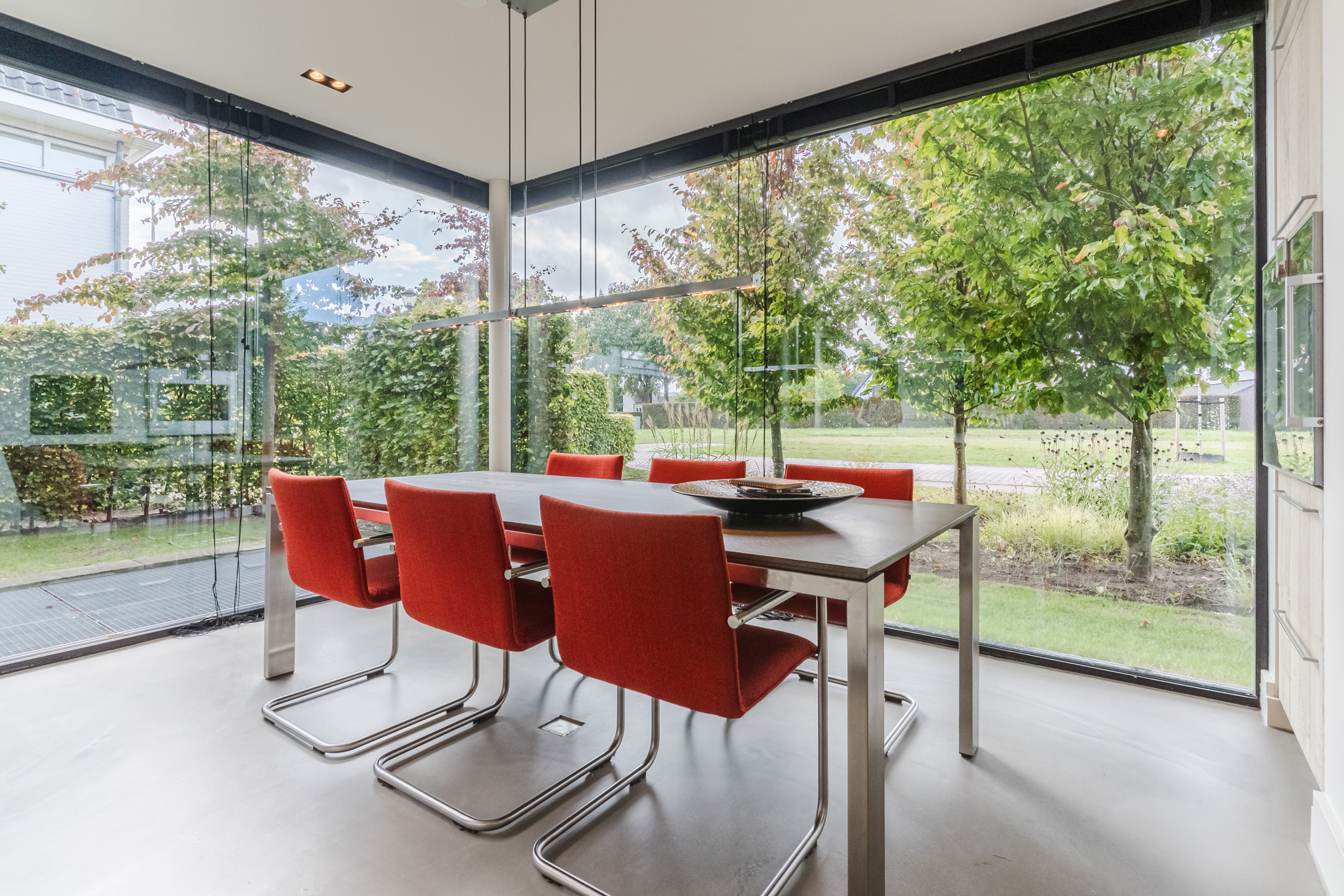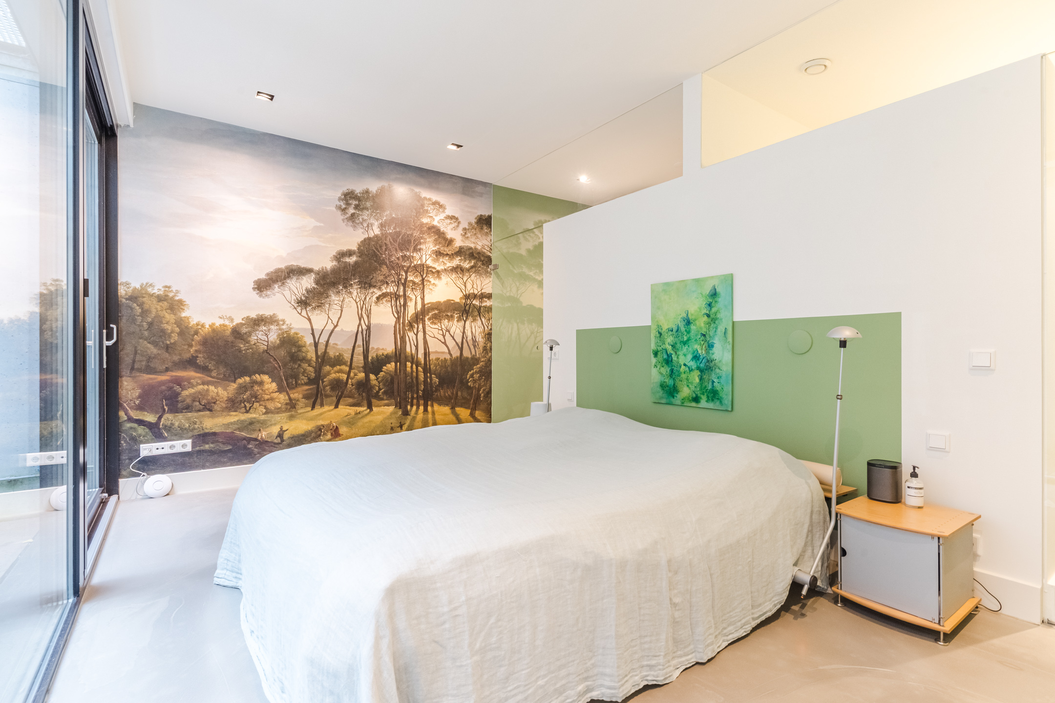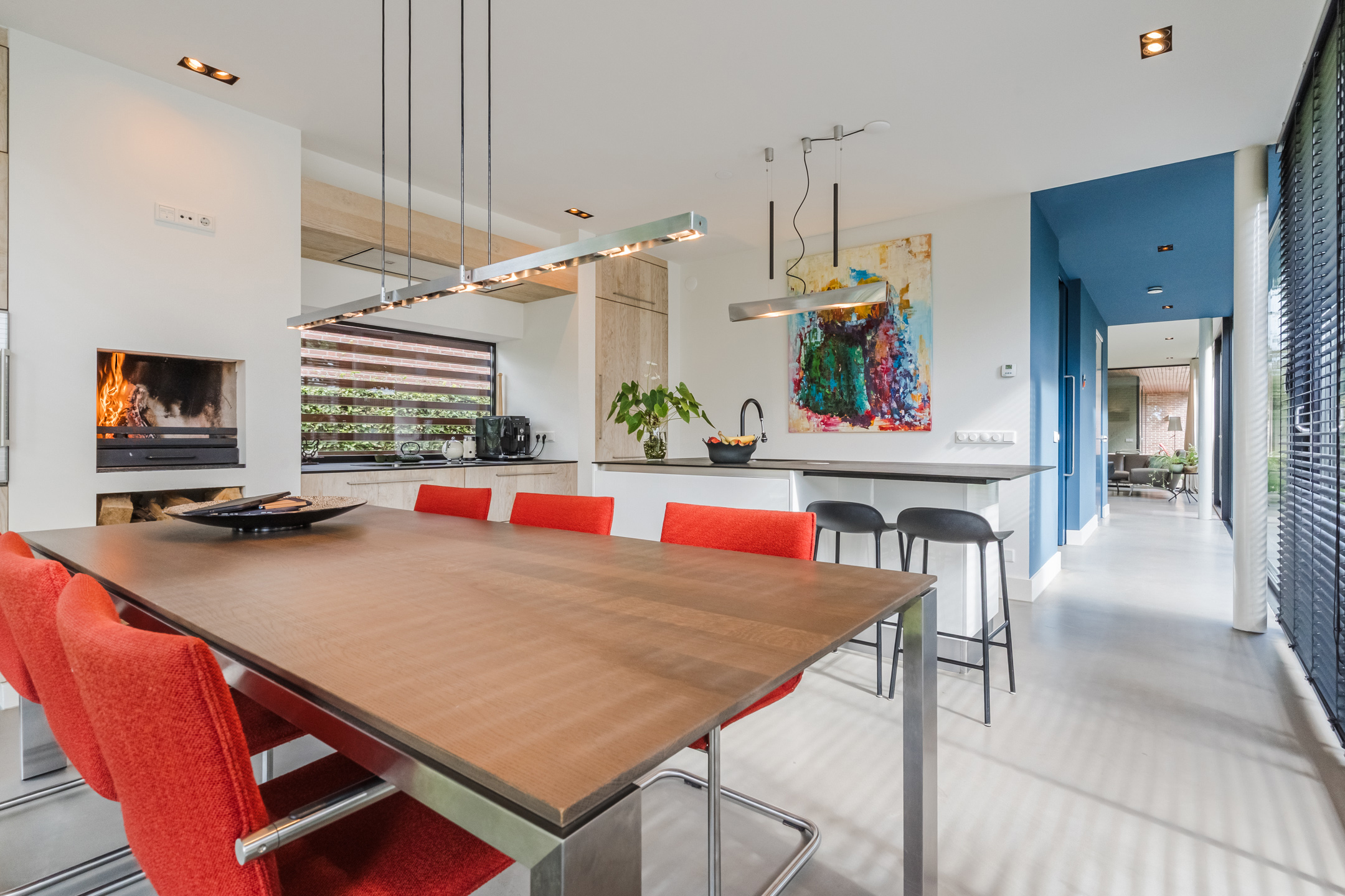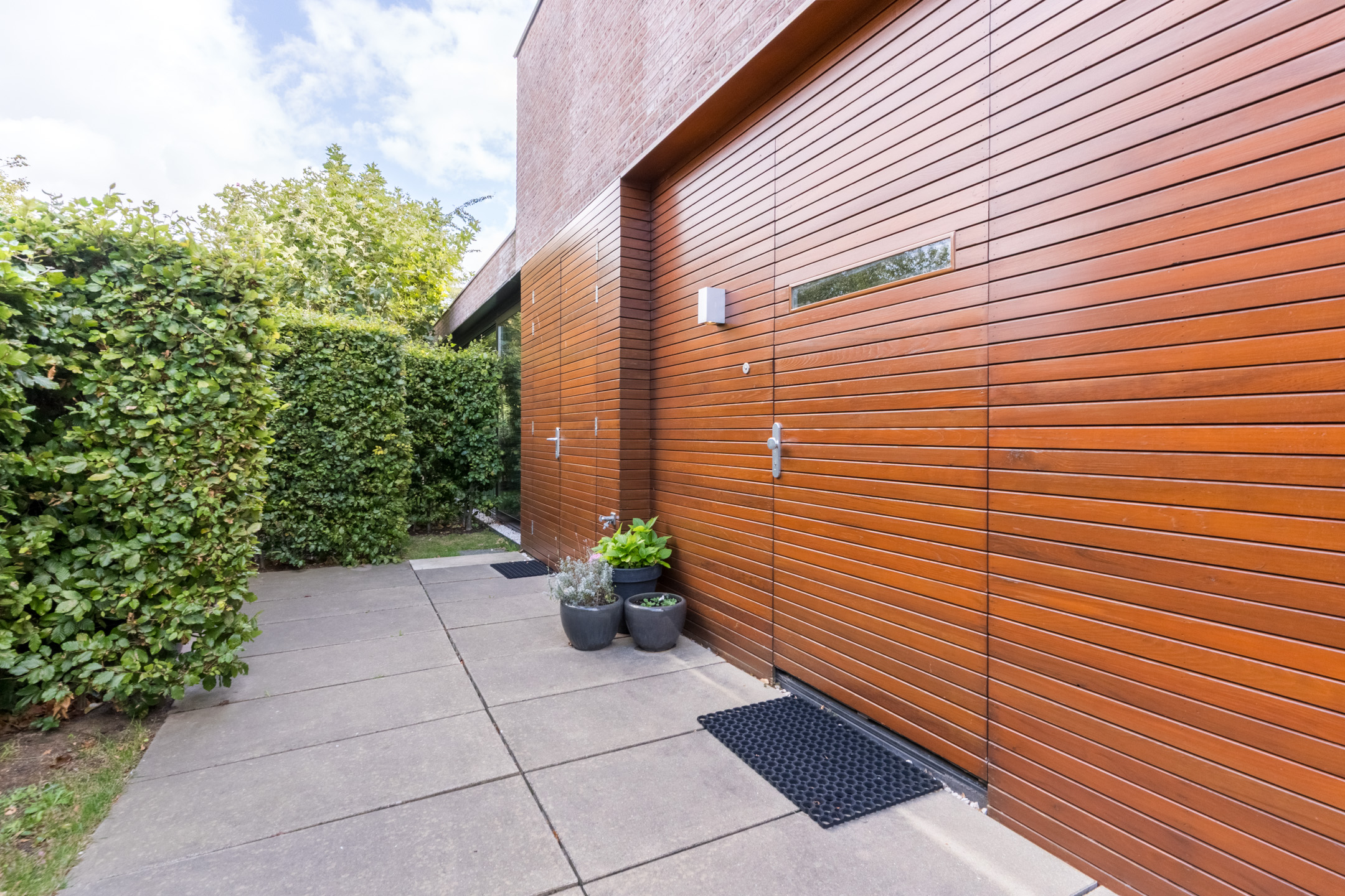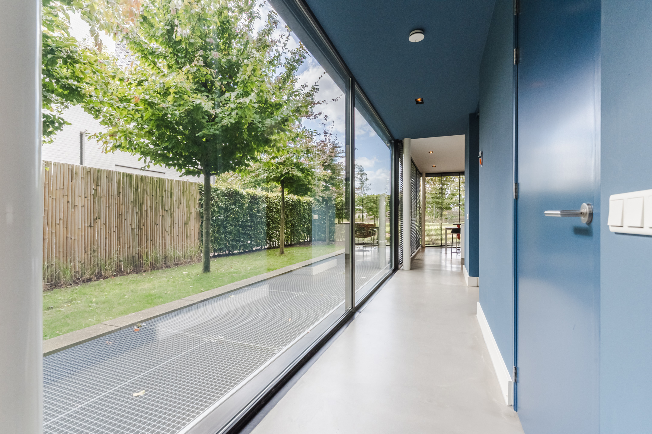 The home is modern, bold, and architect-designed (by JMW Architects). The layout creates a loft-like feel, with open flowing spaces and seamless indoor-outdoor connections thanks to the extensive glass facades throughout. Comfort is also maximized — this home offers a pleasant indoor climate year-round, thanks to a ground-source heat pump and electric sunshades. The pump provides cooling via underfloor systems in summer and heating in winter.