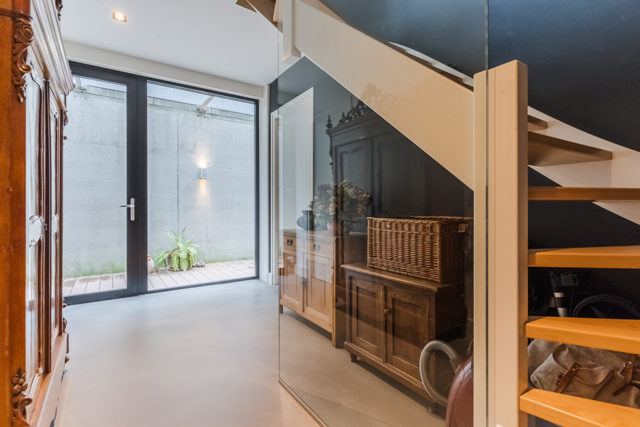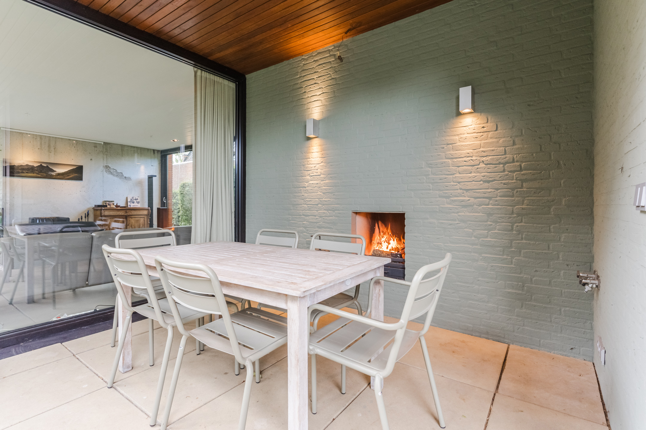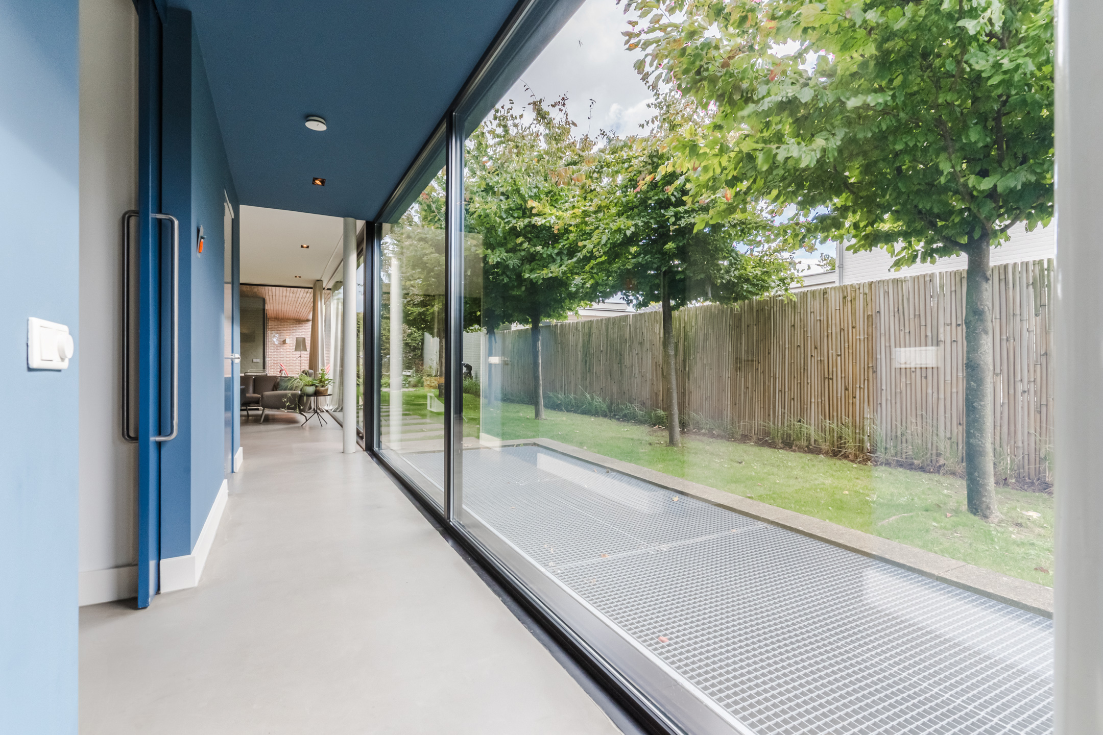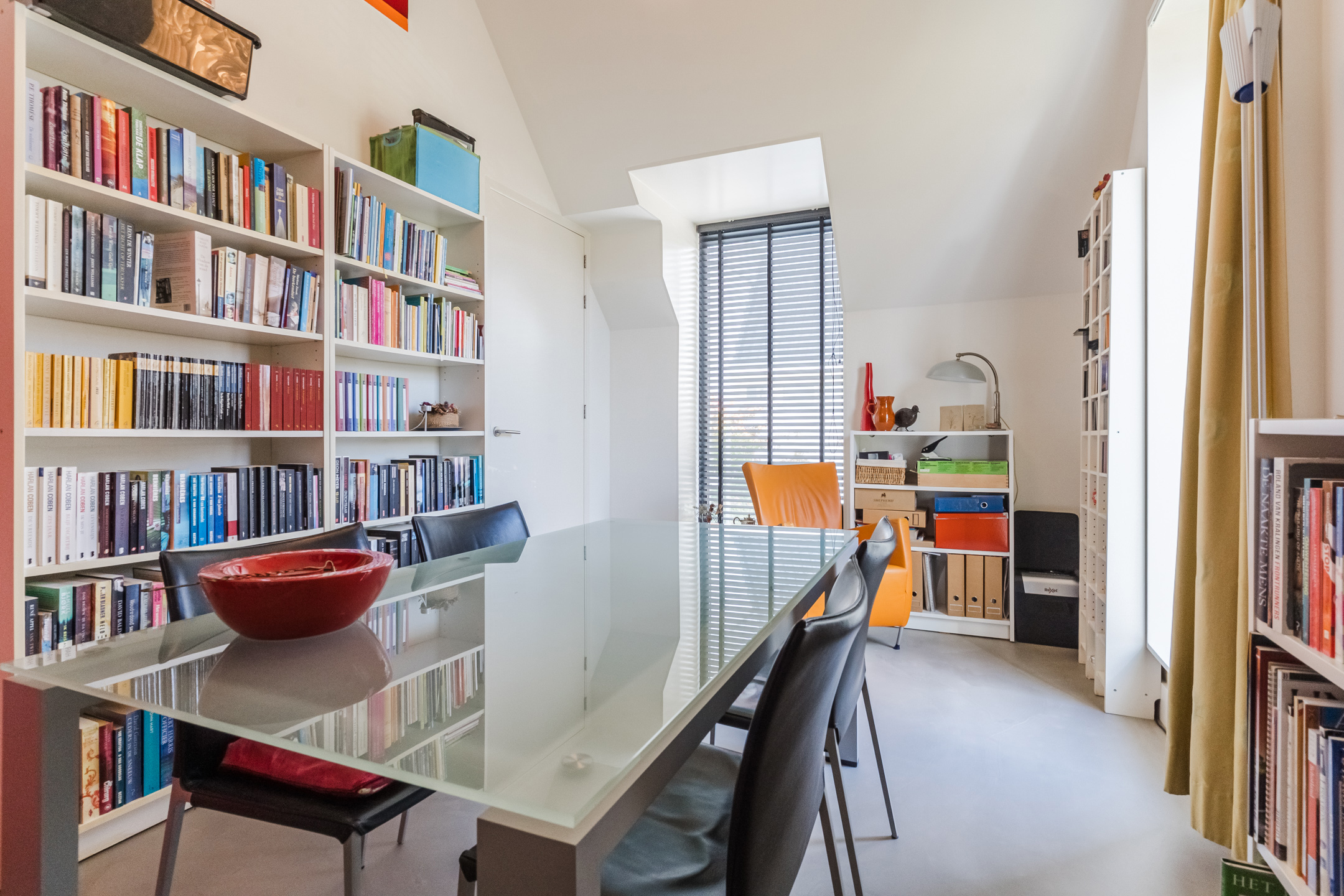 The home is modern, bold, and architect-designed (by JMW Architects). The layout creates a loft-like feel, with open flowing spaces and seamless indoor-outdoor connections thanks to the extensive glass facades throughout. Comfort is also maximized — this home offers a pleasant indoor climate year-round, thanks to a ground-source heat pump and electric sunshades. The pump provides cooling via underfloor systems in summer and heating in winter.