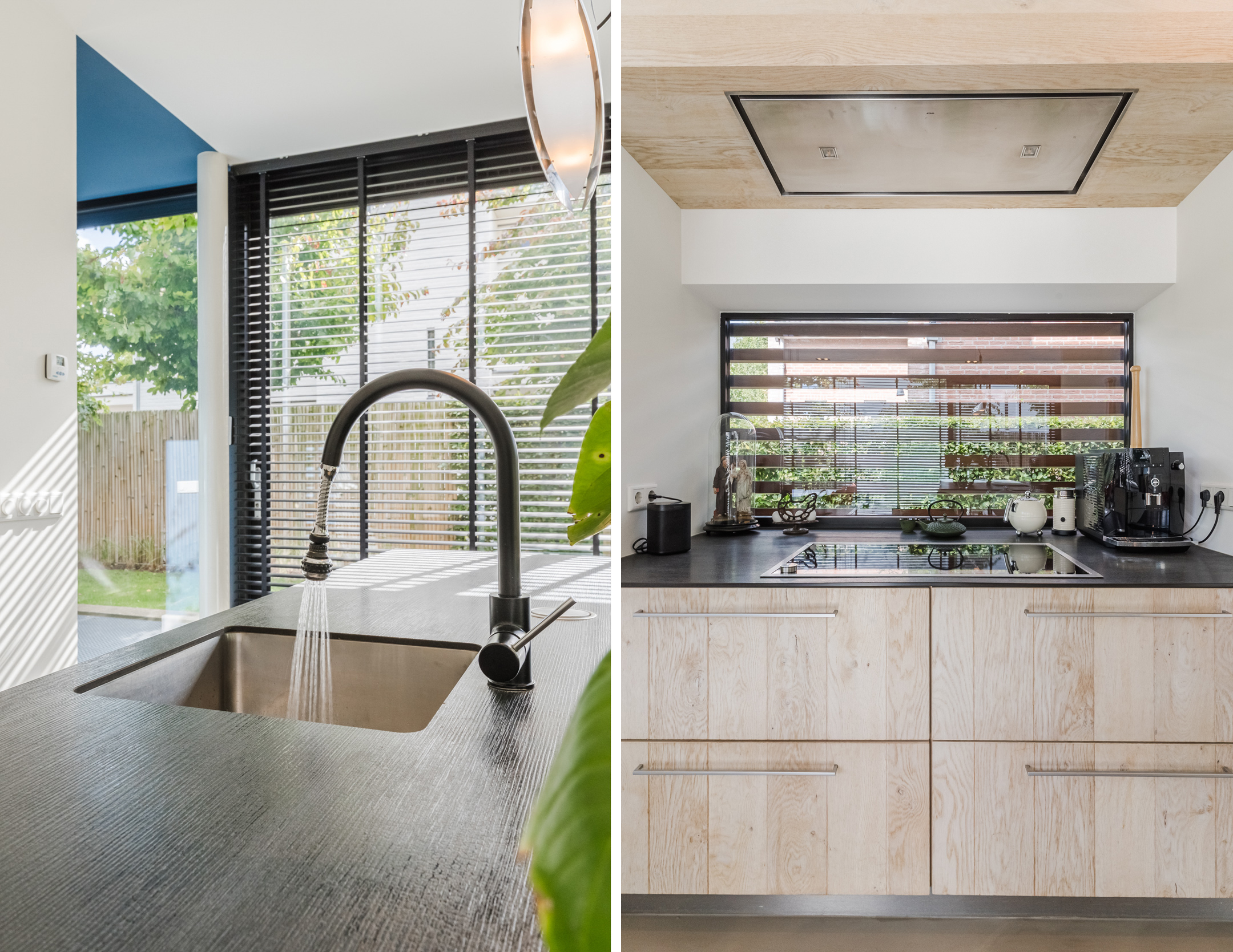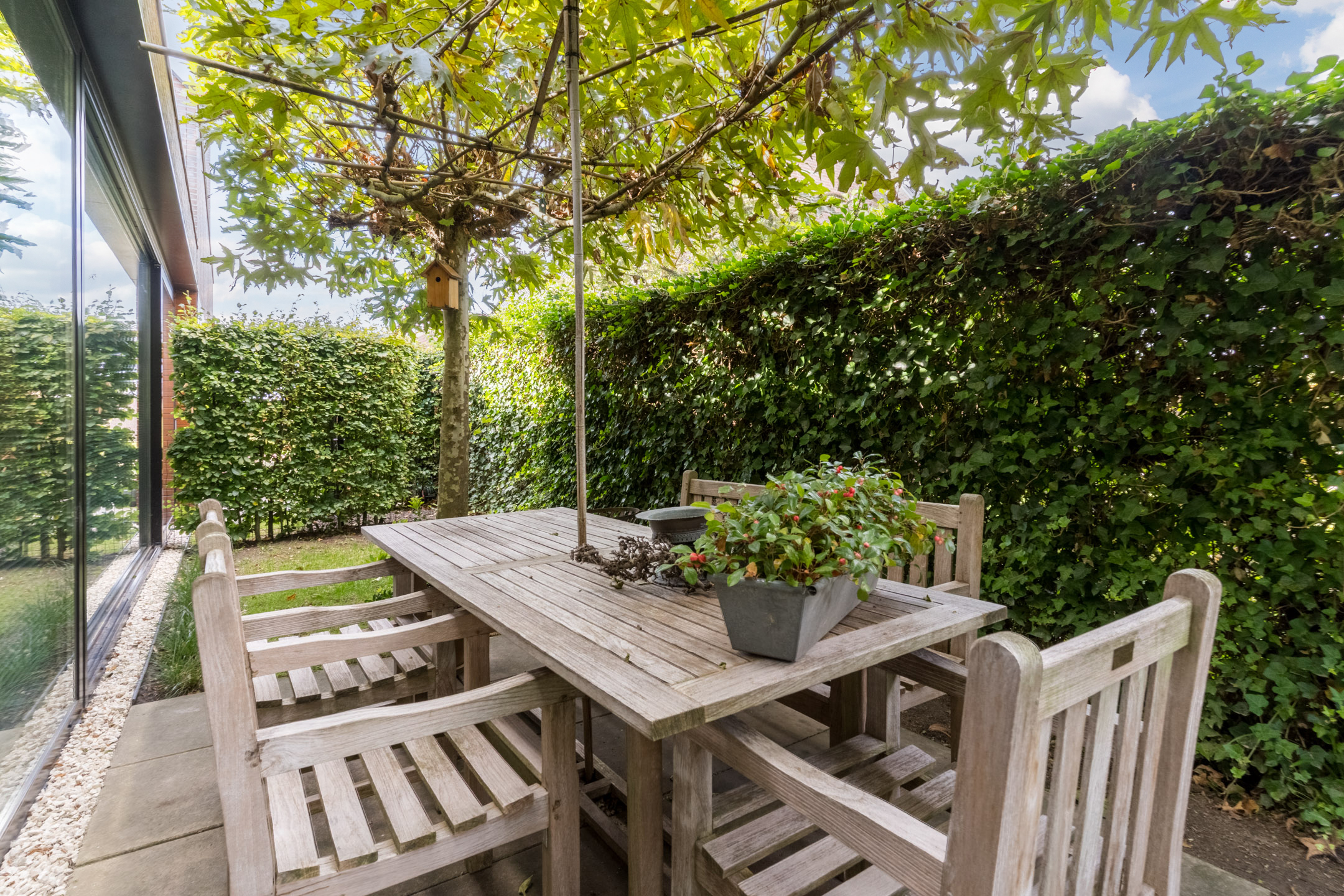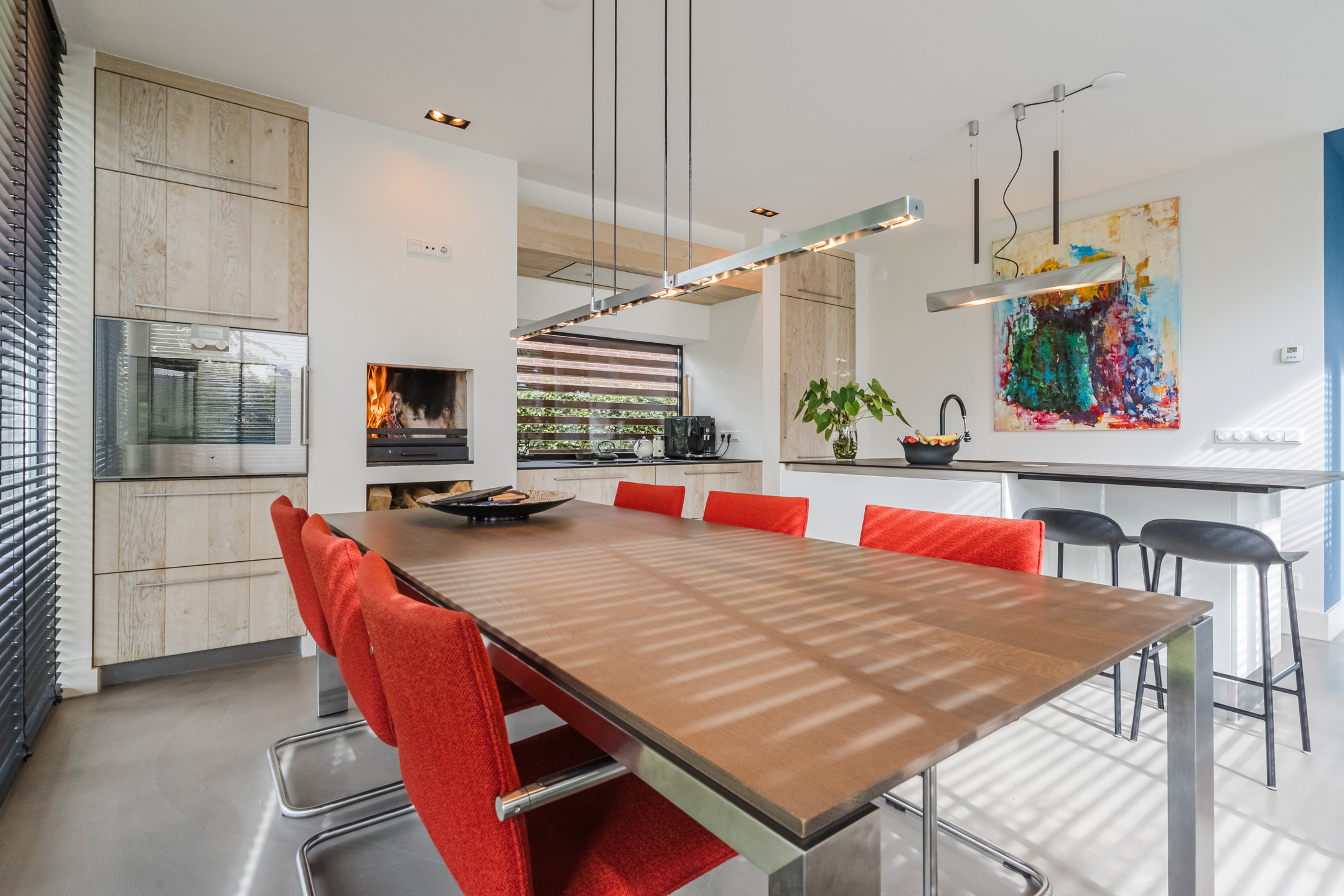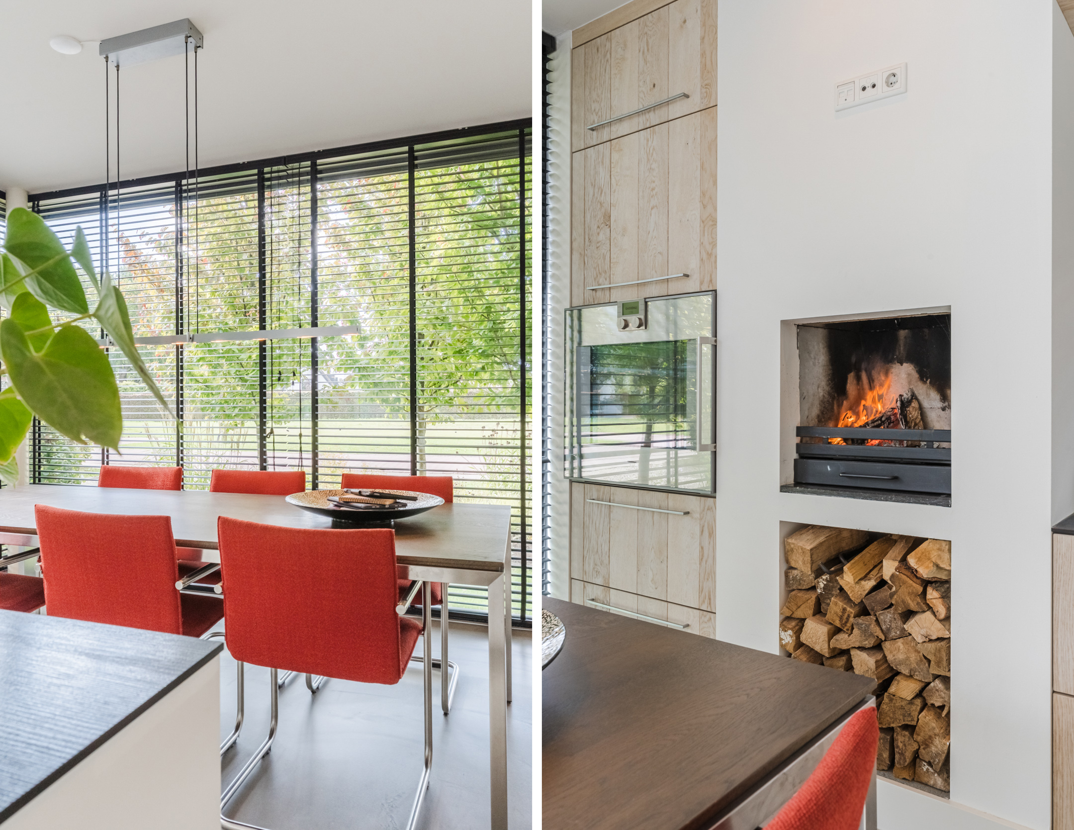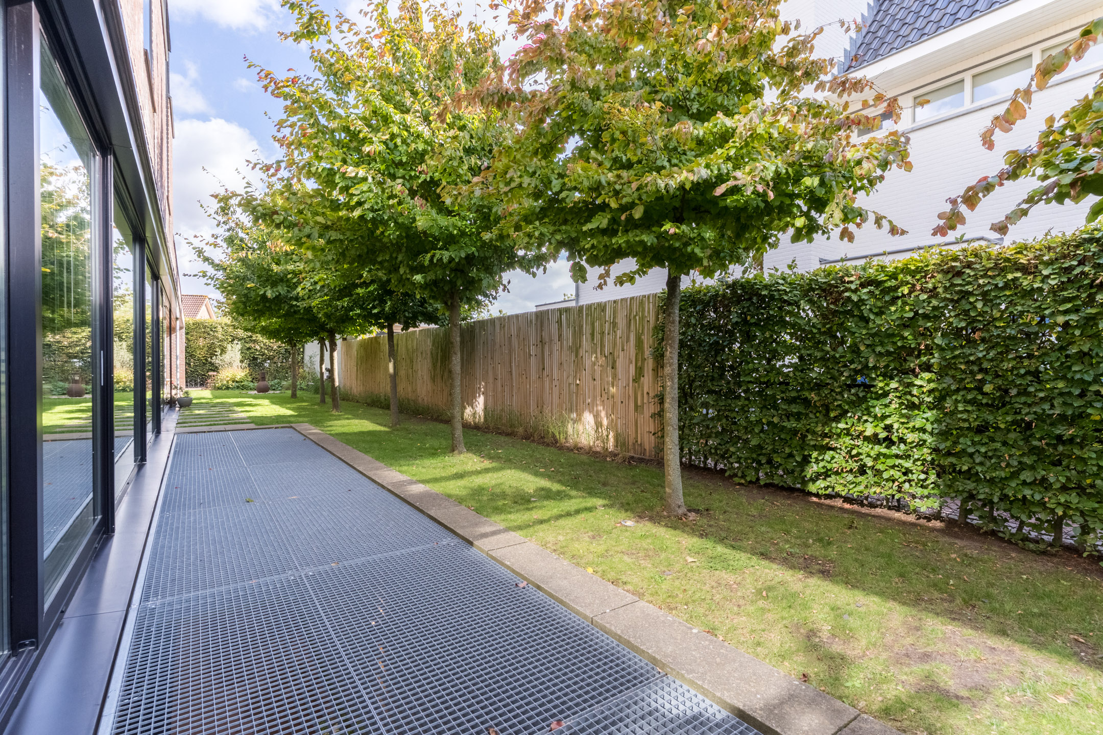 The home is modern, bold, and architect-designed (by JMW Architects). The layout creates a loft-like feel, with open flowing spaces and seamless indoor-outdoor connections thanks to the extensive glass facades throughout. Comfort is also maximized — this home offers a pleasant indoor climate year-round, thanks to a ground-source heat pump and electric sunshades. The pump provides cooling via underfloor systems in summer and heating in winter.