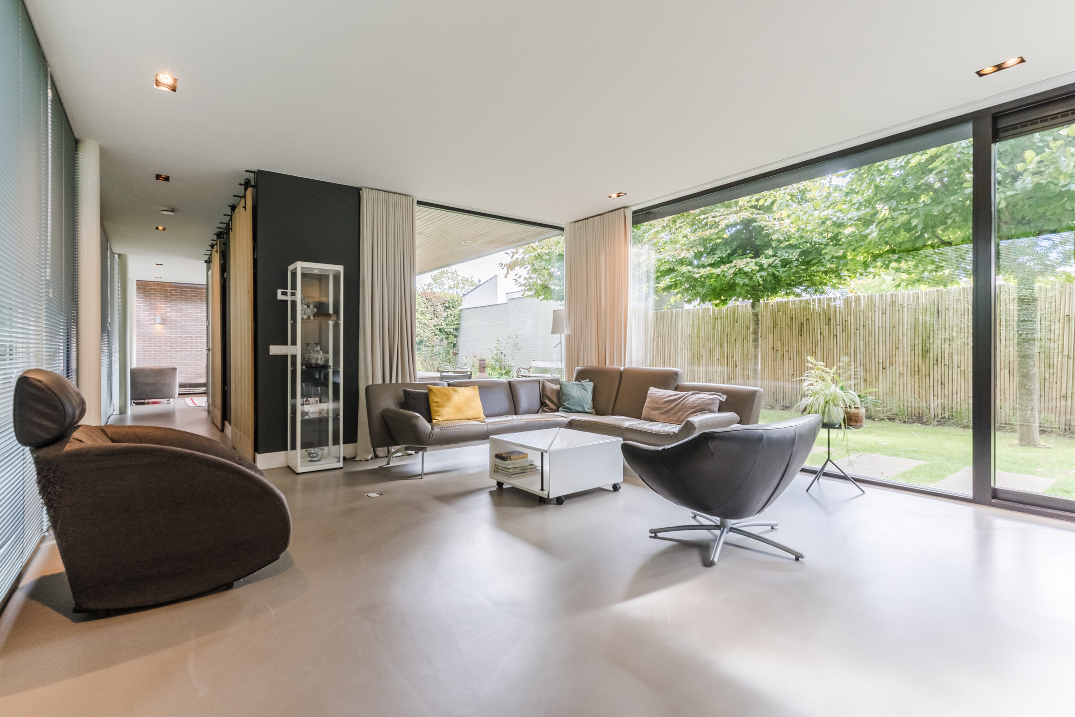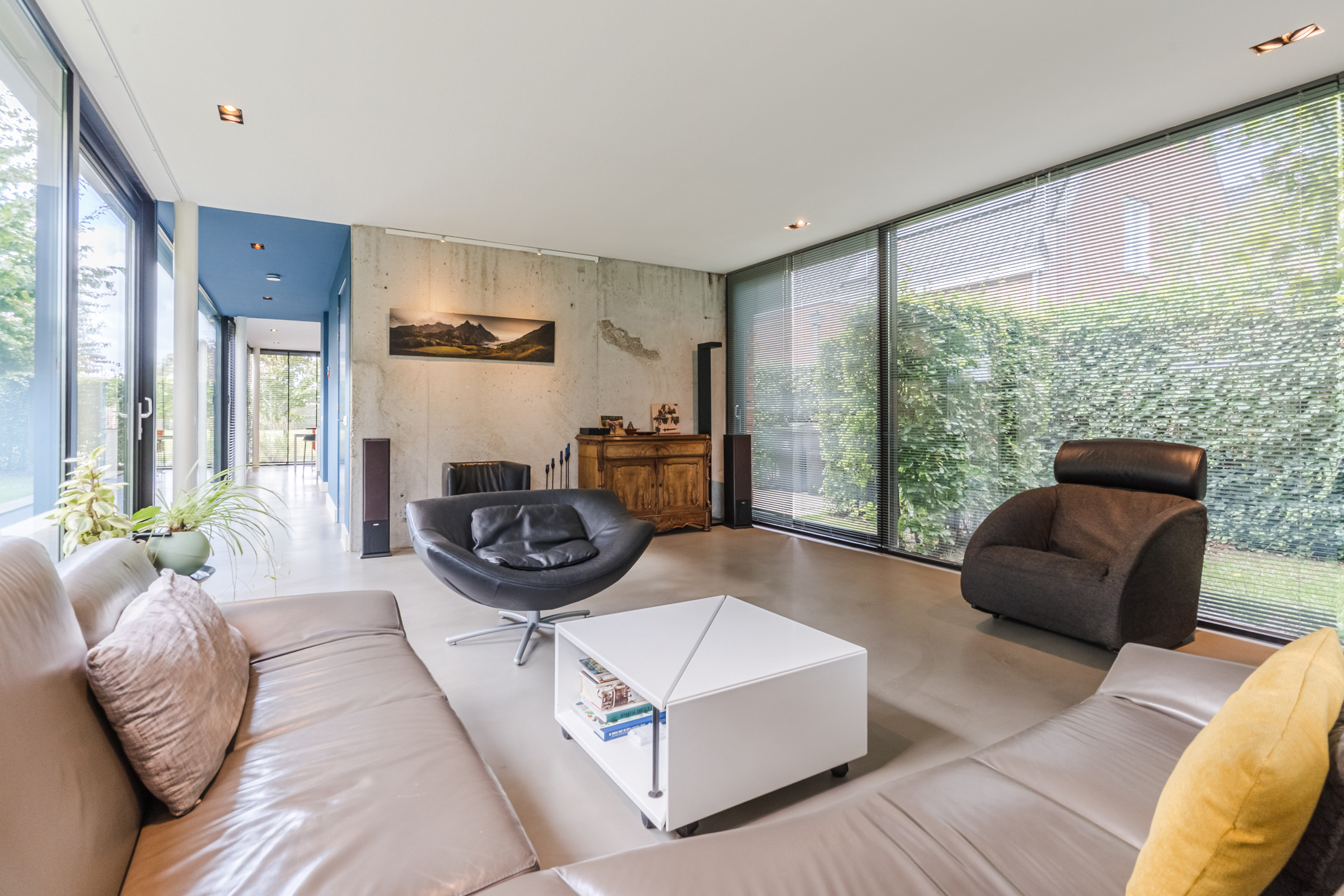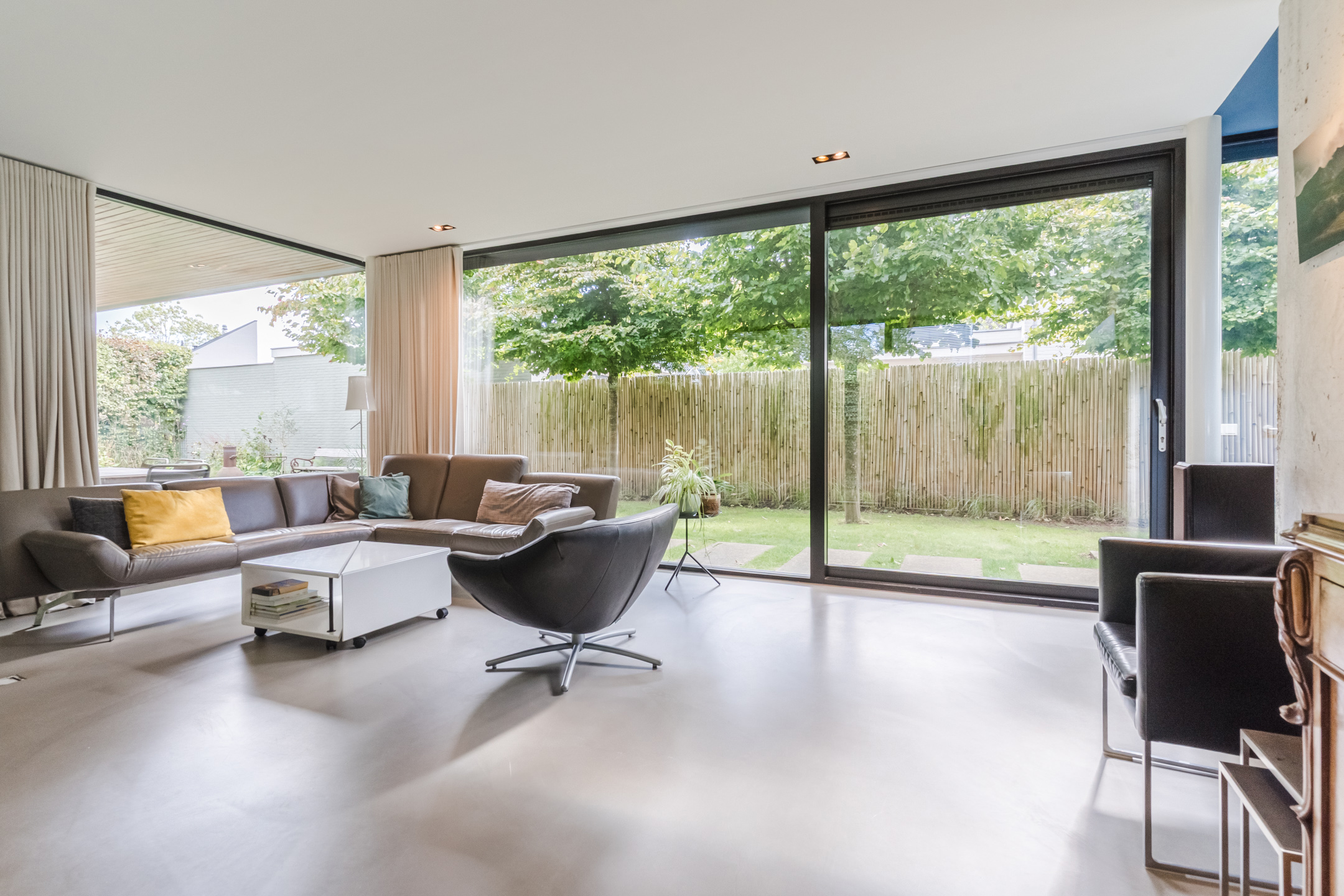 Approx. 30 m², with designer concrete floor, plastered and concrete walls, plastered ceiling with recessed lighting, two sliding doors to the front and side garden, and two full-width glass facades with electric sun screens on the southeast side.