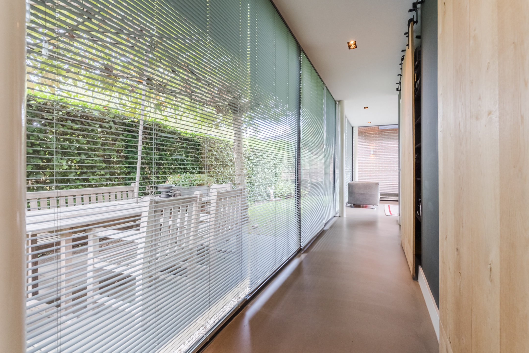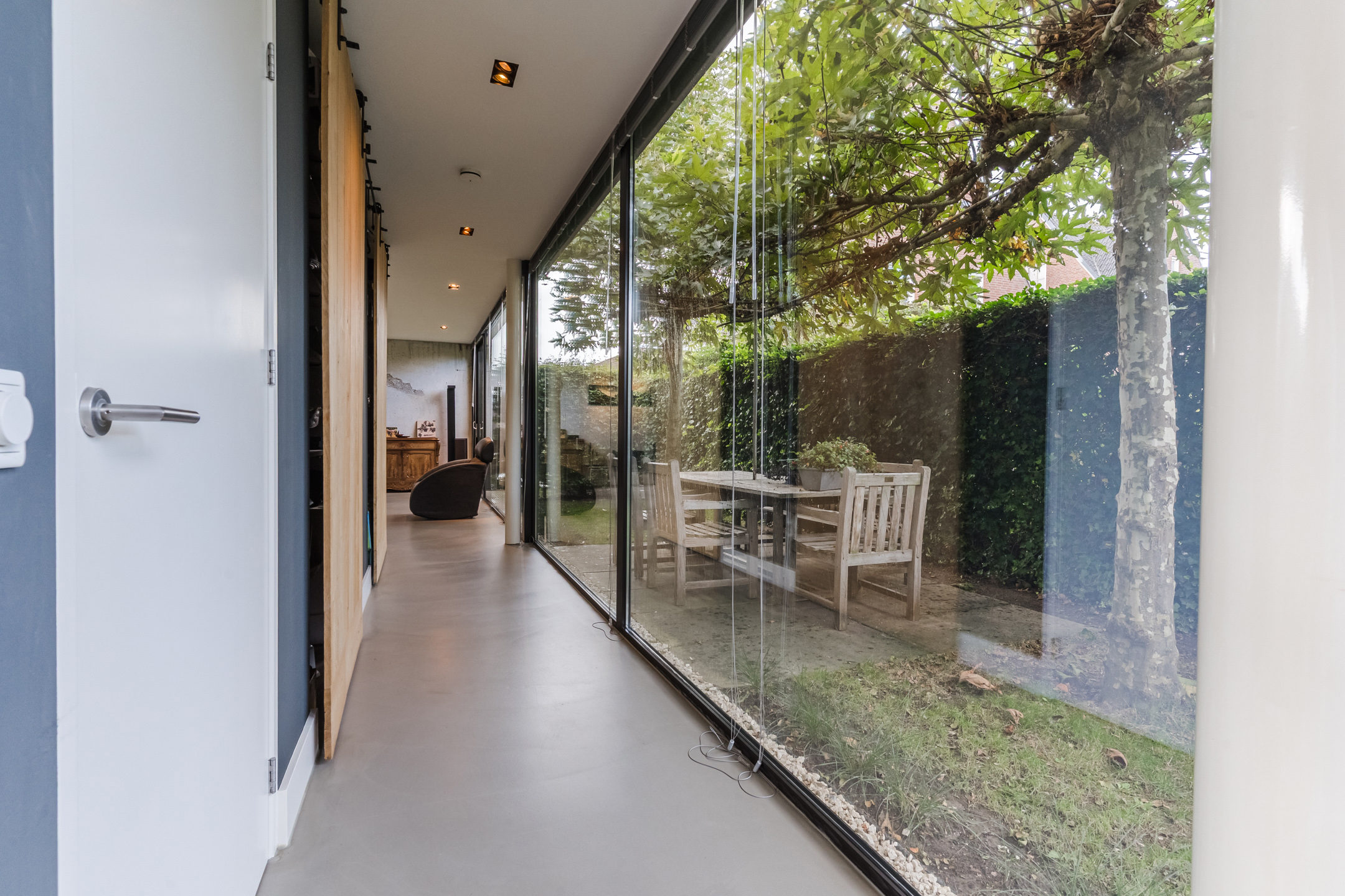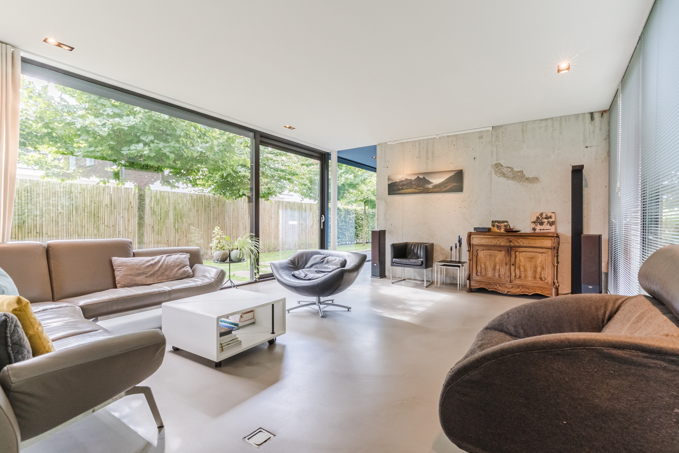 Approx. 30 m², with designer concrete floor, plastered and concrete walls, plastered ceiling with recessed lighting, two sliding doors to the front and side garden, and two full-width glass facades with electric sun screens on the southeast side.