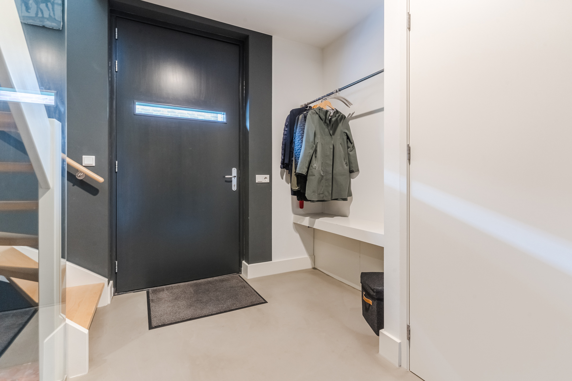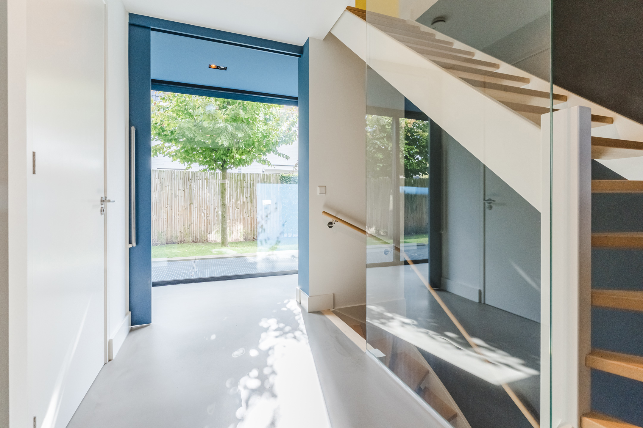 Approx. 11 m², with designer concrete flooring, plastered walls and ceiling. Provides access to guest toilet, coat area, basement, first floor, and open access to kitchen and living room.