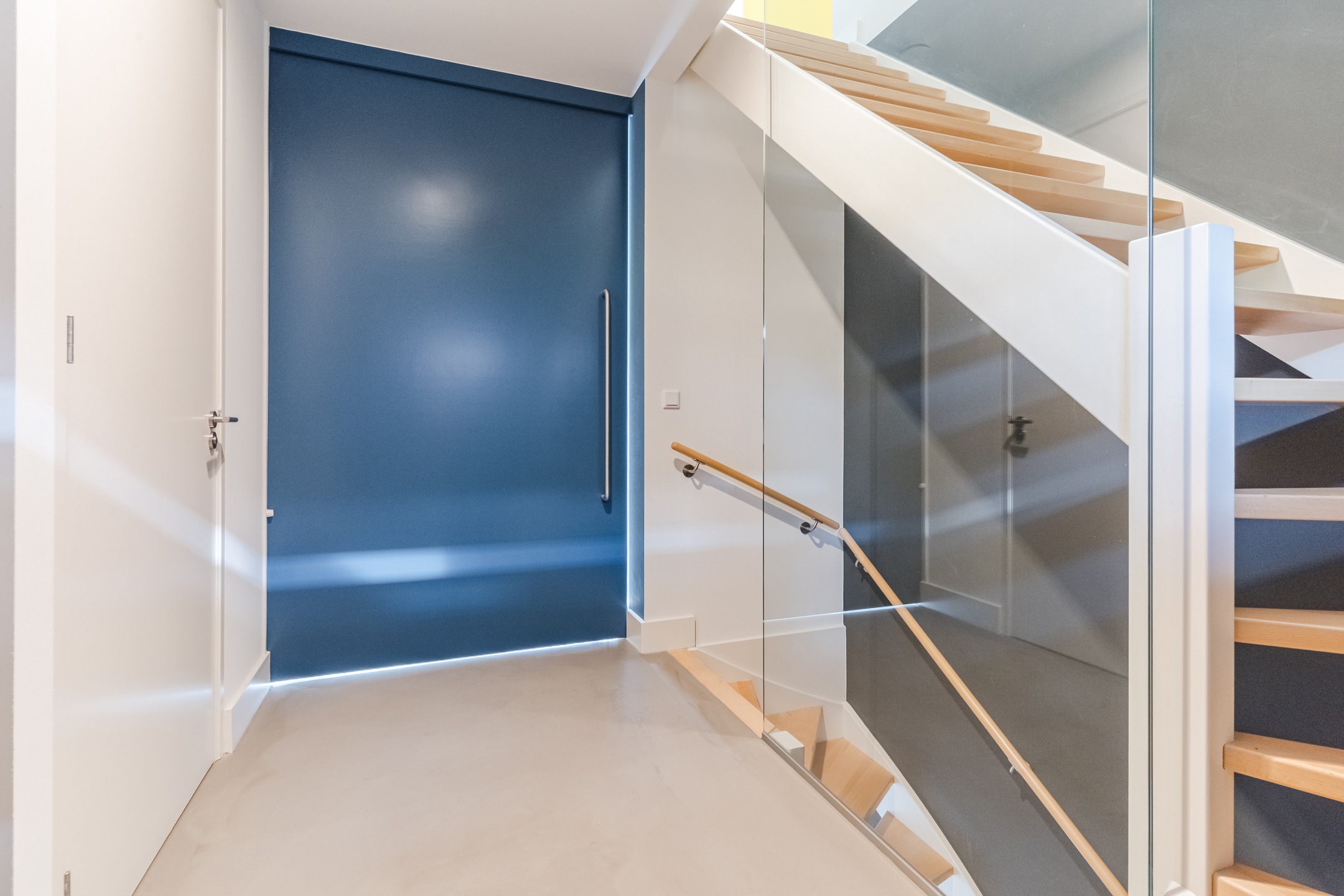 Approx. 4 m², with designer concrete floor, plastered walls and ceiling with recessed lighting, extra-wide pivot door (1.7 m), and preparations for a bathroom.