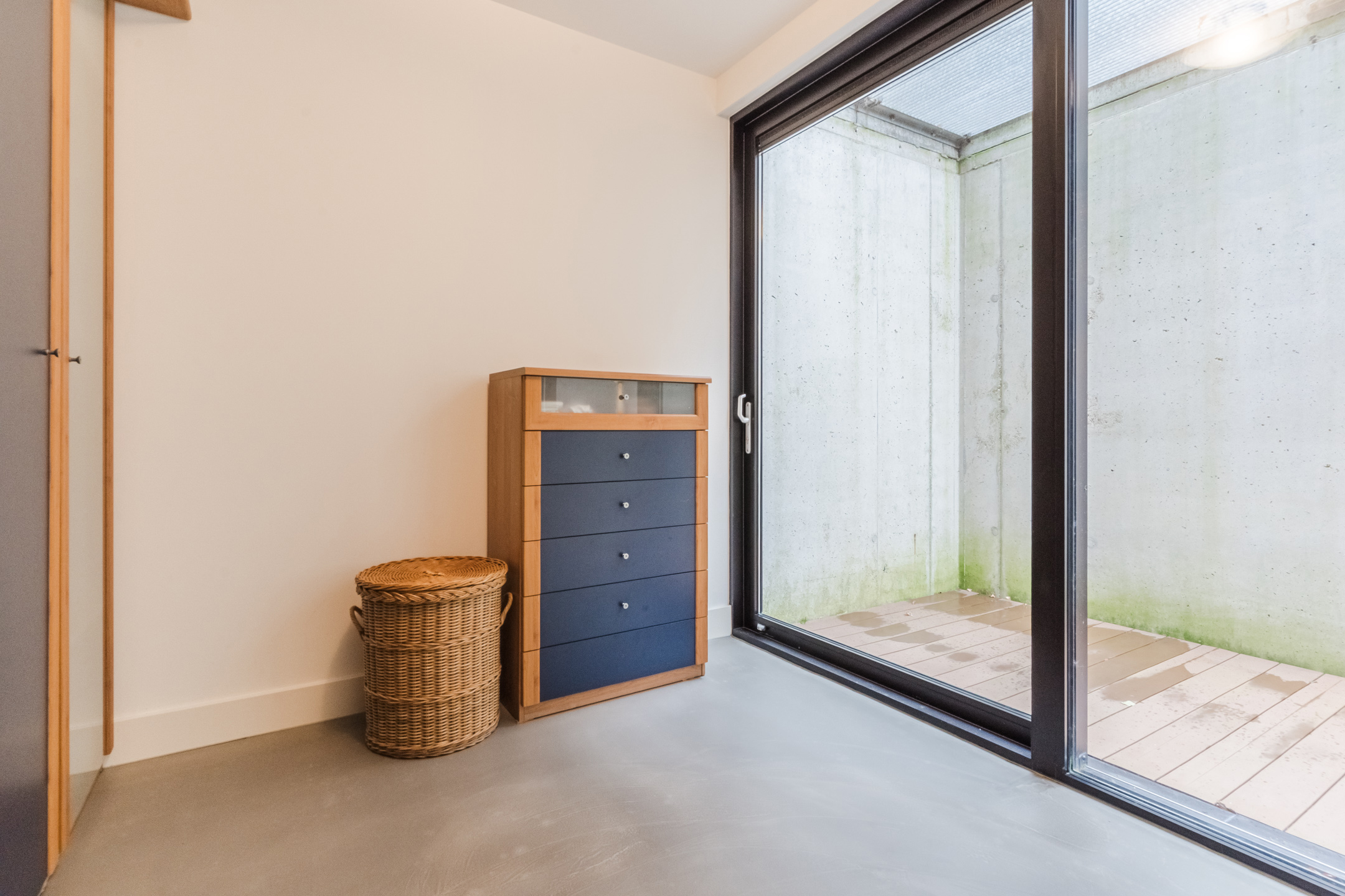 Approx. 9.5 m², with designer concrete floor, plastered walls and ceiling, and sliding door with access to the patio.