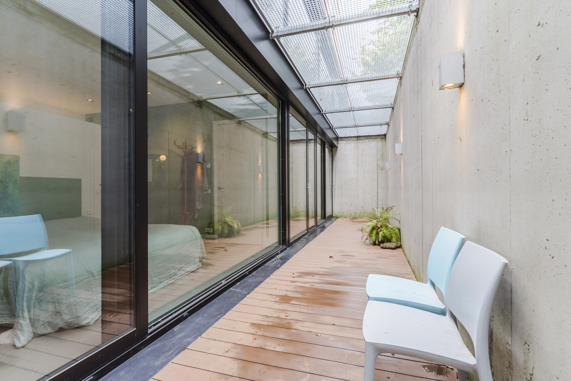 Approx. 7 m², with designer concrete floor, plastered walls and ceiling with recessed lighting, two built-in cabinets with solid hardwood sliding doors, and fully glazed wall with side garden view.