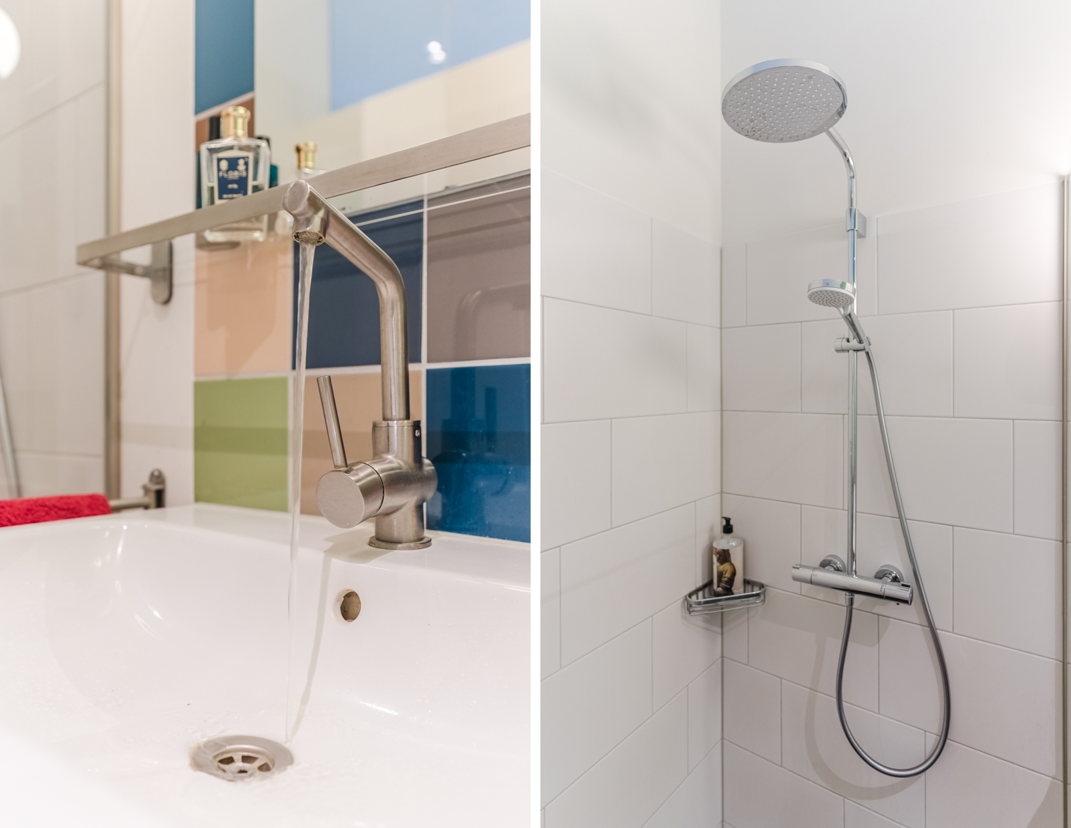 Approx. 3.5 m², with tiled floor, plastered and partially tiled walls, plastered ceiling, walk-in shower with thermostatic tap, and double washbasin.