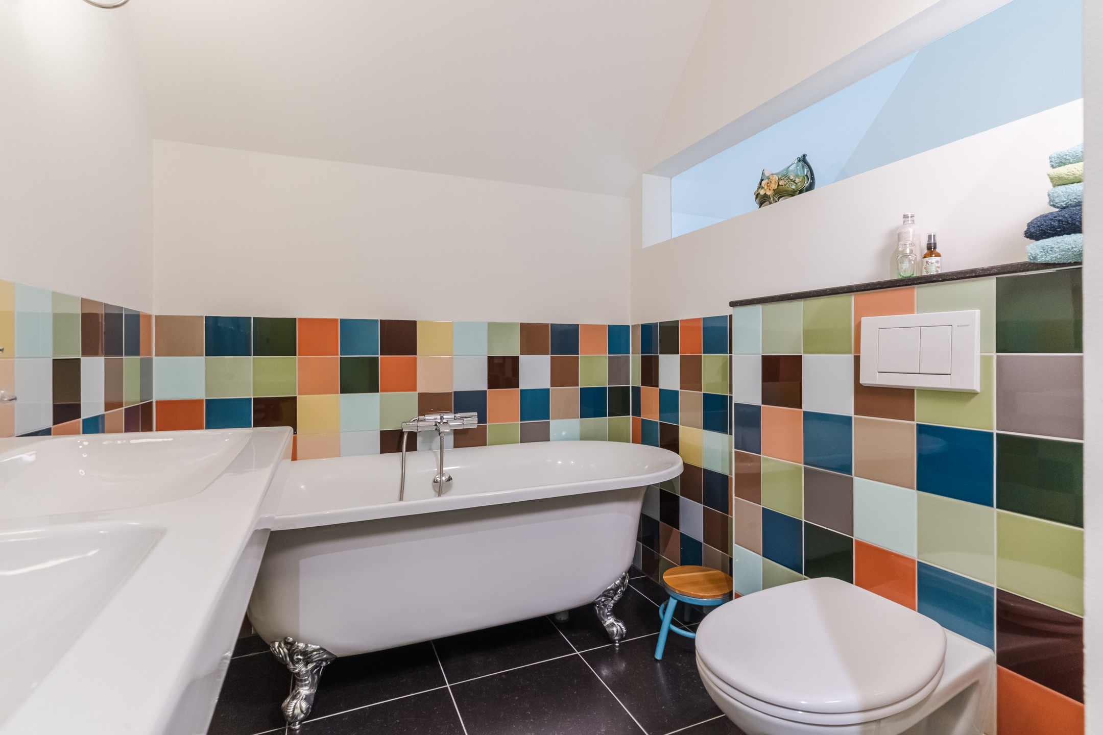 Approx. 6 m², with tiled floor, partially tiled and plastered walls and ceiling, walk-in shower with thermostatic tap, bathtub with thermostatic tap, double washbasin, and floating toilet.