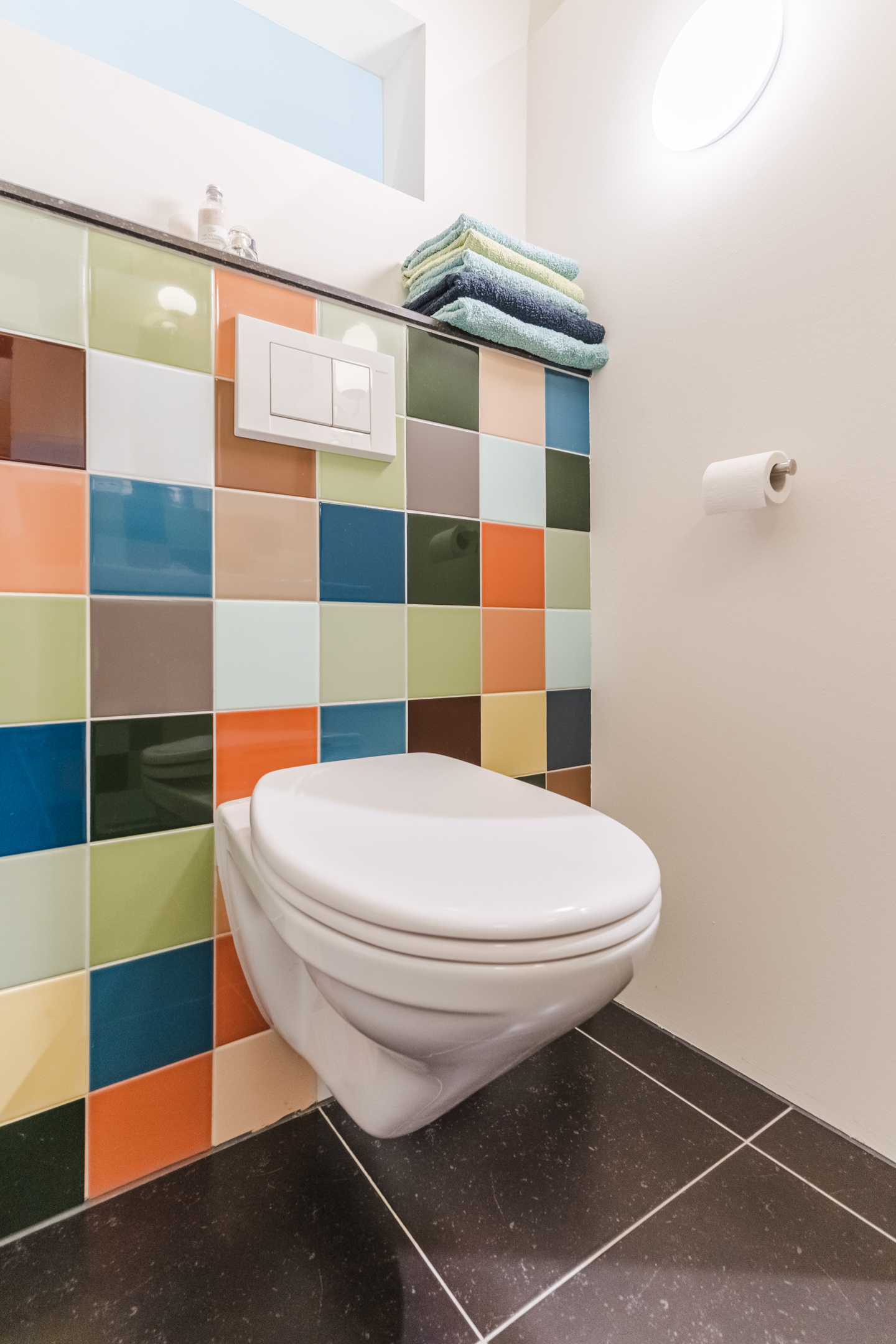 With plastered and partially tiled walls, plastered ceiling with recessed lighting, floating toilet and washbasin.