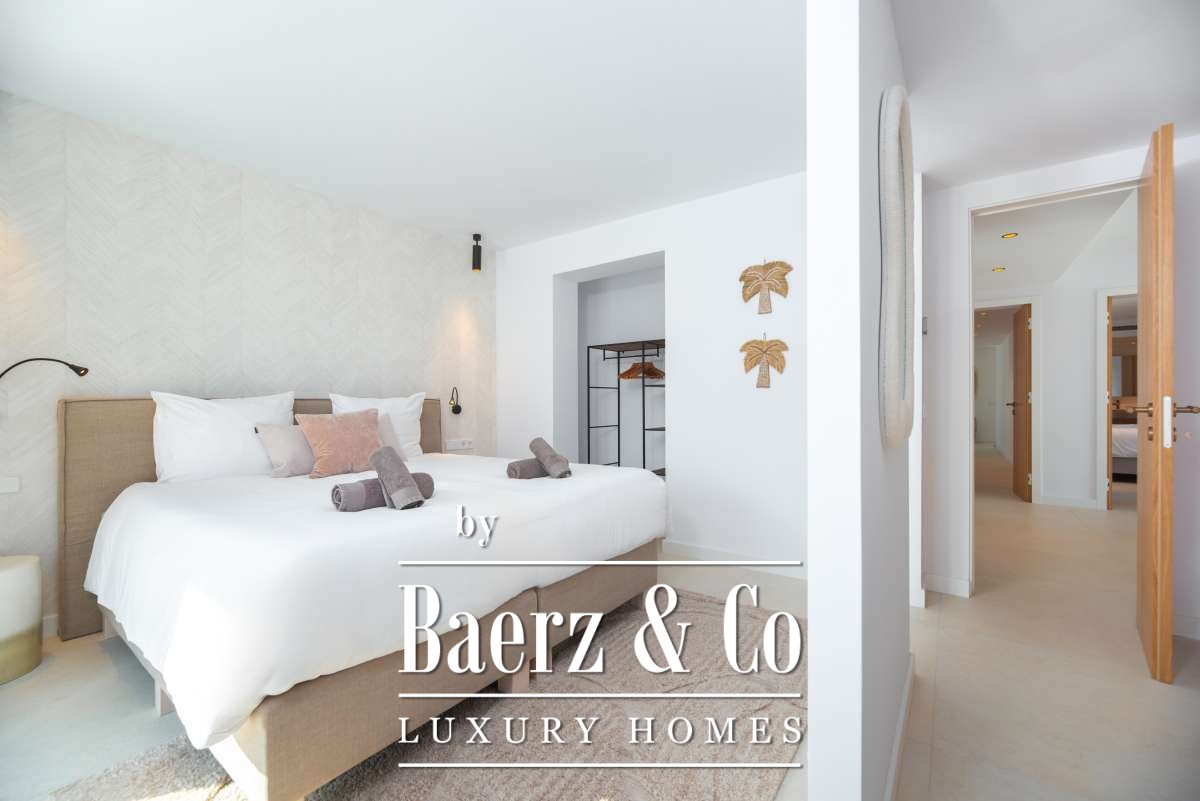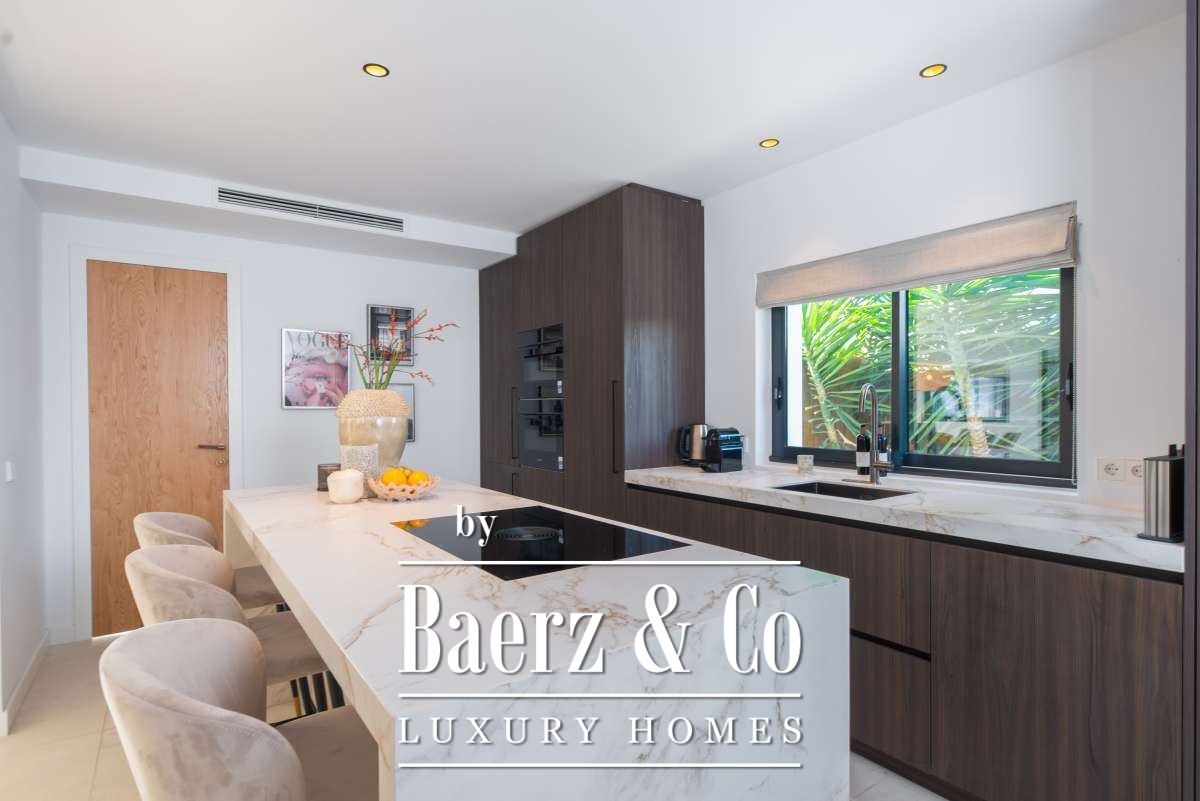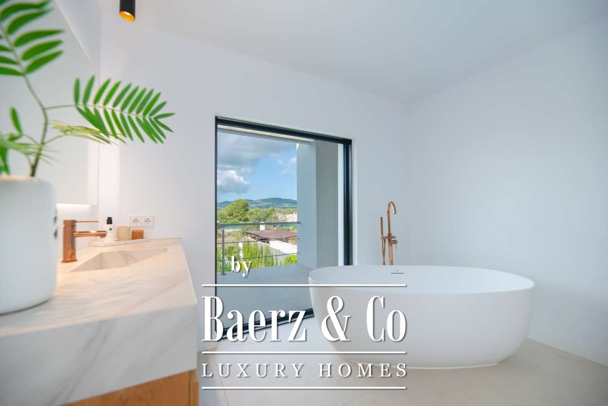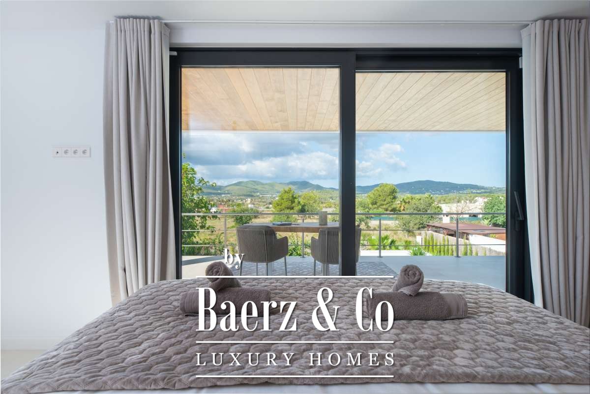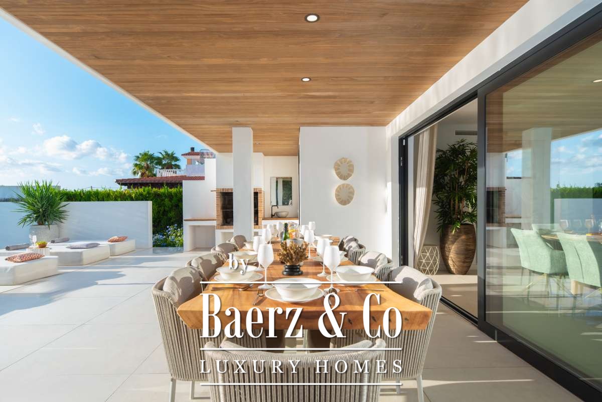 Outdoor living is celebrated with a private swimming pool, a covered patio for al fresco dining, a built-in barbecue, and multiple terraces. Landscaped gardens, a rooftop terrace, sun beds, and secure, fully fenced grounds ensure privacy and tranquility. Additional features include garage and outdoor parking, alarm system, and amenities such as internet, double glazing, and smart security. This villa in Can Ramón encapsulates refined Mediterranean living with convenient access to Ibiza’s beaches, marinas, and city life.