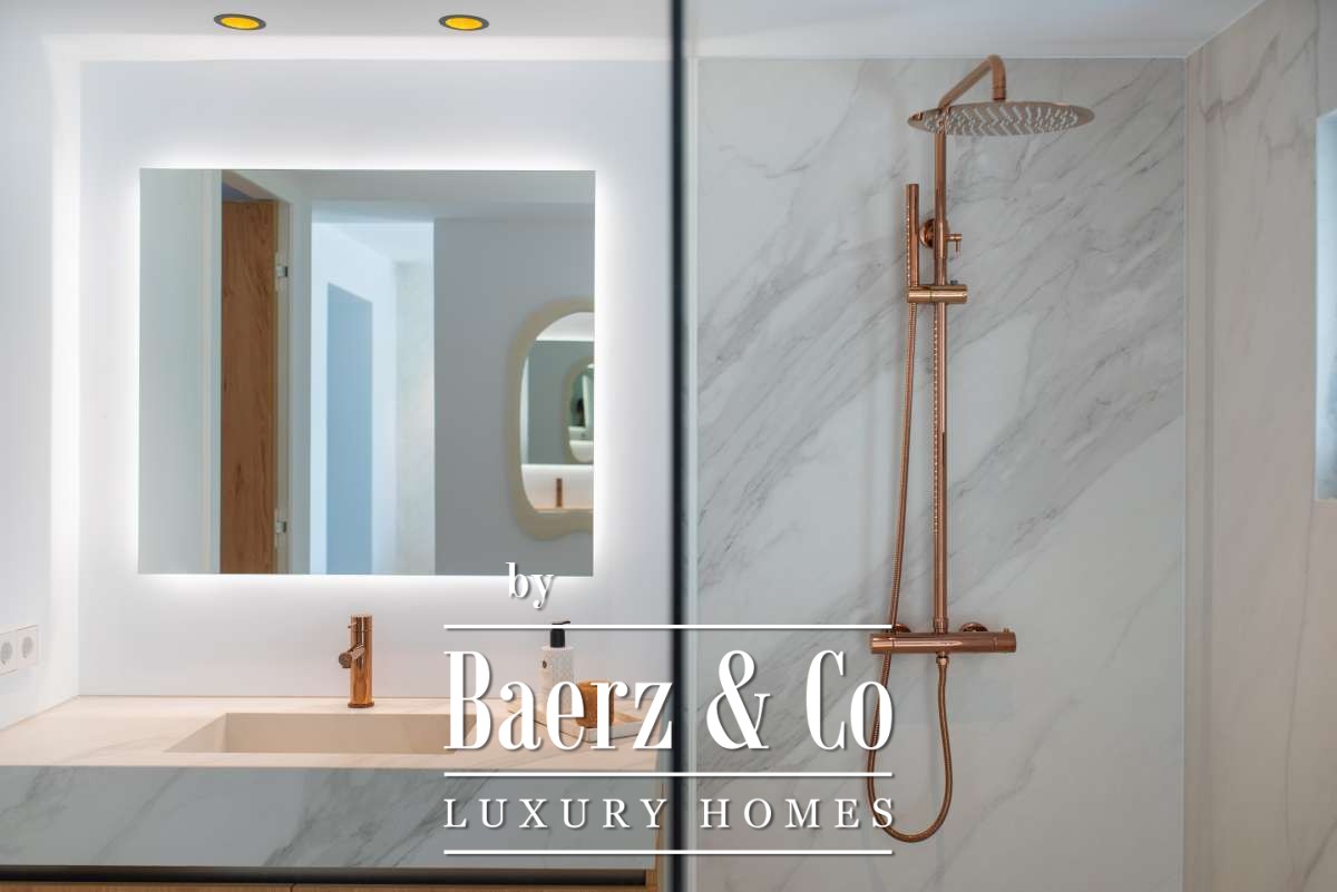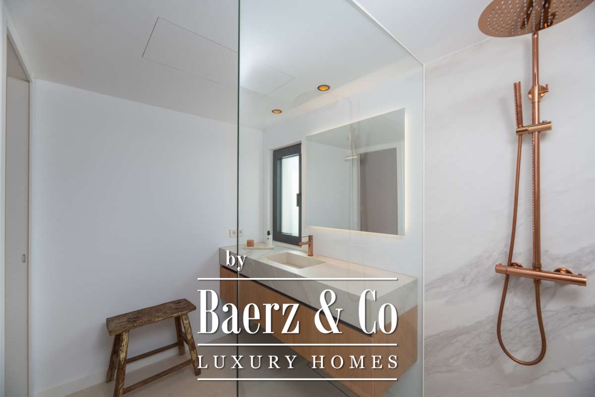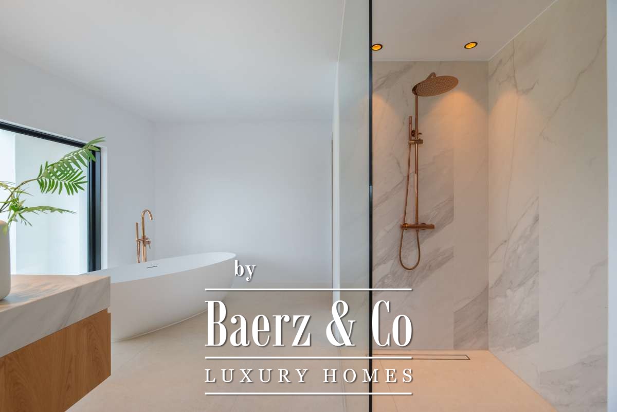 Each of the 5 spacious bedrooms includes an en suite bathroom, with marble finishes, gold fixtures, and walk-in showers. The master suite offers a freestanding bath and serene countryside views. Open living spaces are complemented by a modern fireplace, a sleek marble kitchen bar, underfloor heating, and air conditioning for year-round comfort.