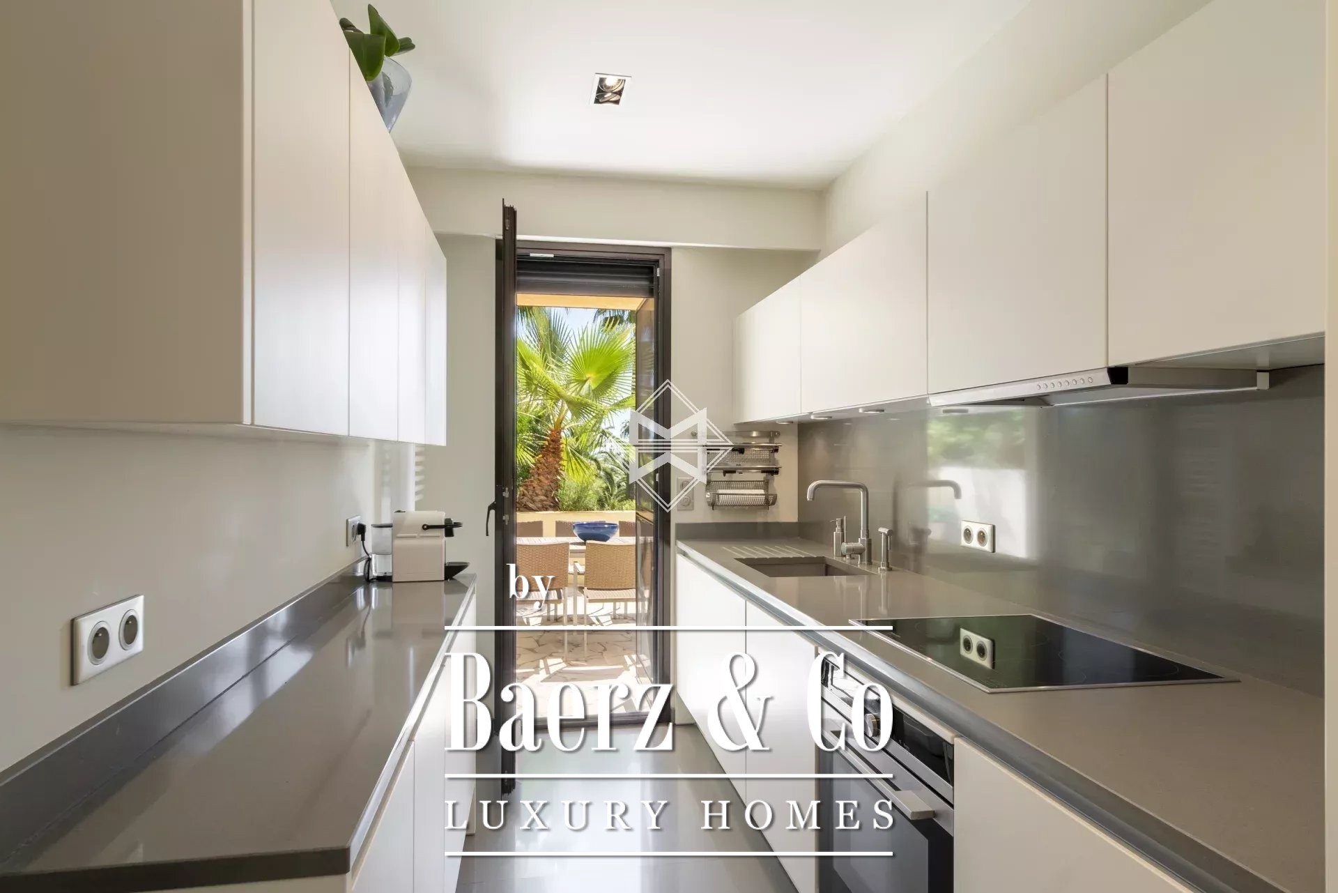Nestled in this lush and tranquil environment, a fully renovated 1-bedroom apartment of 67.51 m² is offered for sale. It features a spacious, light-filled living room opening onto a south-facing terrace of 16 m², as well as a 30 m² east-south facing garden terrace. The property enjoys spectacular, unobstructed views of the sea and surrounding nature.