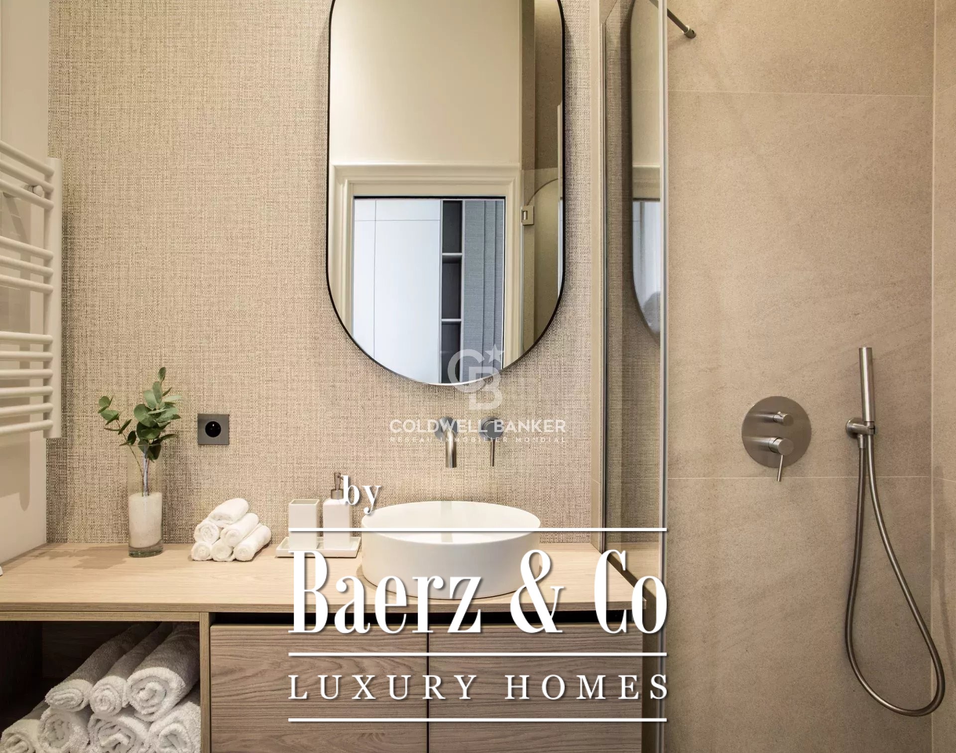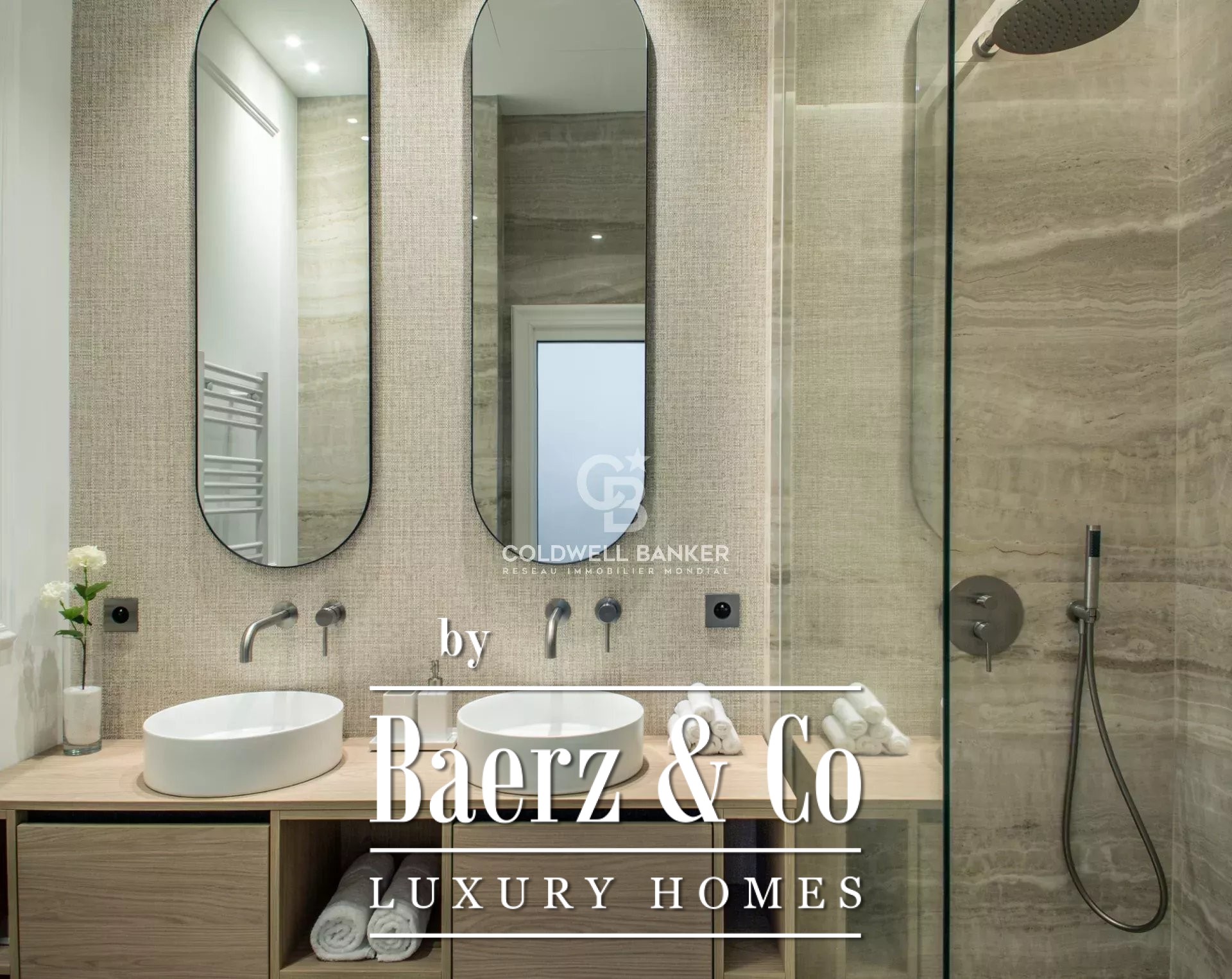 hall, a bright living/ dining room, a fully equipped kitchen, four spacious bedrooms en suite with dressing room and Italian showers, a laundry room, guest toilets and a terrace. Air conditioning and underfloor heating.