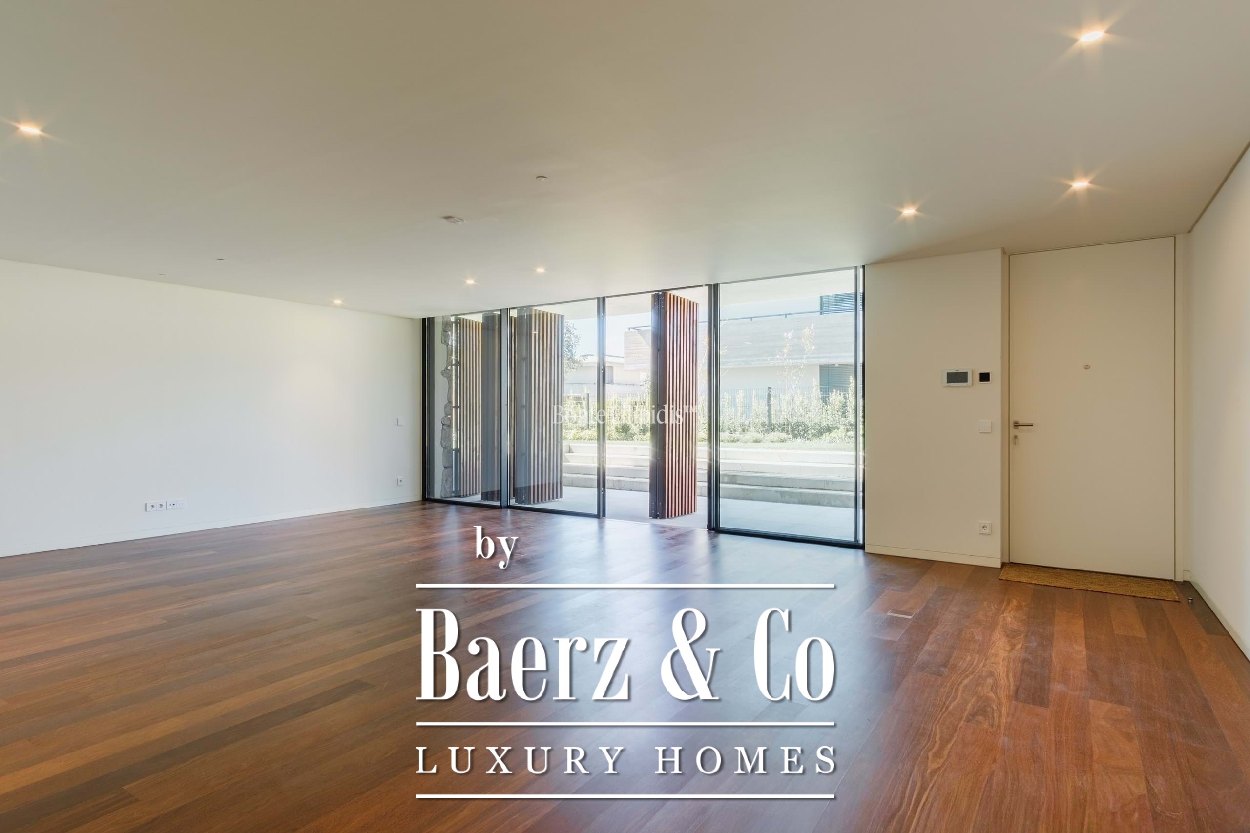 Finishes include succupira wood flooring, a home automation system controlling lighting, blinds, and climate, hydraulic underfloor heating for both heating and cooling, and a controlled mechanical ventilation system. The apartment also includes pre-installation for electric vehicle charging and two parking spaces.