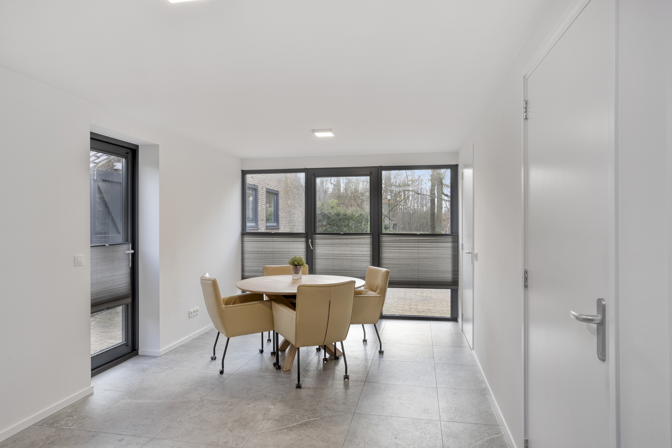Via de hal kom je in de eetkamer, een lichte en uitnodigende ruimte dankzij de grote schuifpui. De eetkamer is voorzien van een houtkachel. Hier bevindt zich ook de trapopgang naar de eerste verdieping. Vanuit de eetkamer loop je door naar de woonkamer en de keuken. De woonkamer is ook voorzien van een sfeervolle houtkachel. De dichte keuken heeft een speels effect dank zij de bar aan het keukenblad. De keuken is uitgerust met diverse inbouwapparatuur, waaronder een 4-pits inductiekookplaat met afzuigkap, oven, koelkast, vaatwasser, stoomoven, warmhoudlade en een keukenboiler.