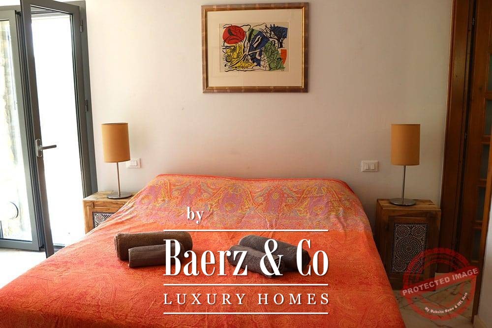 All bedrooms have French doors opening onto the lower terrace with stunning views of the vast mountain landscape. The master bedroom has a large bathroom with bath, a separate shower, two marble basins, toilet and bidet. The second bedroom has a bathroom with two designer sinks, wc, and shower. The third bedroom (the studio), with its own entrance via the lower terrace, has a bathroom with designer washbasin, shower and wc. All bedrooms have a fixed wardrobe. There is a large built-in linen cupboard in the downstairs corridor.
