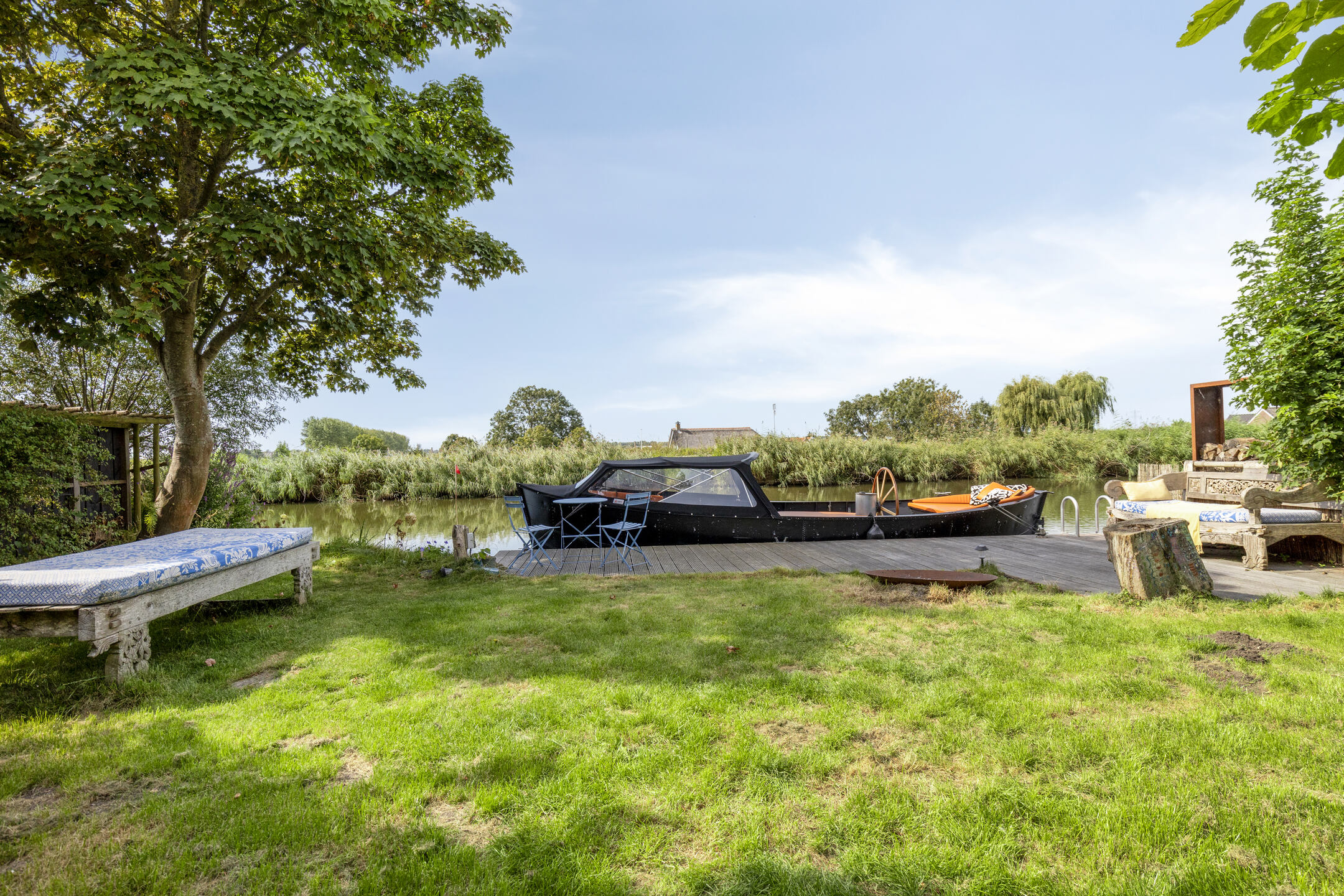 The waterfront garden is without doubt one of the highlights of this home. Located directly on open water, it offers complete privacy and uninterrupted views over the polder landscape. A covered outdoor seating area with a wood-burning stove – featuring original oven doors from the former bakery once located on this site – adds a unique and characterful touch.