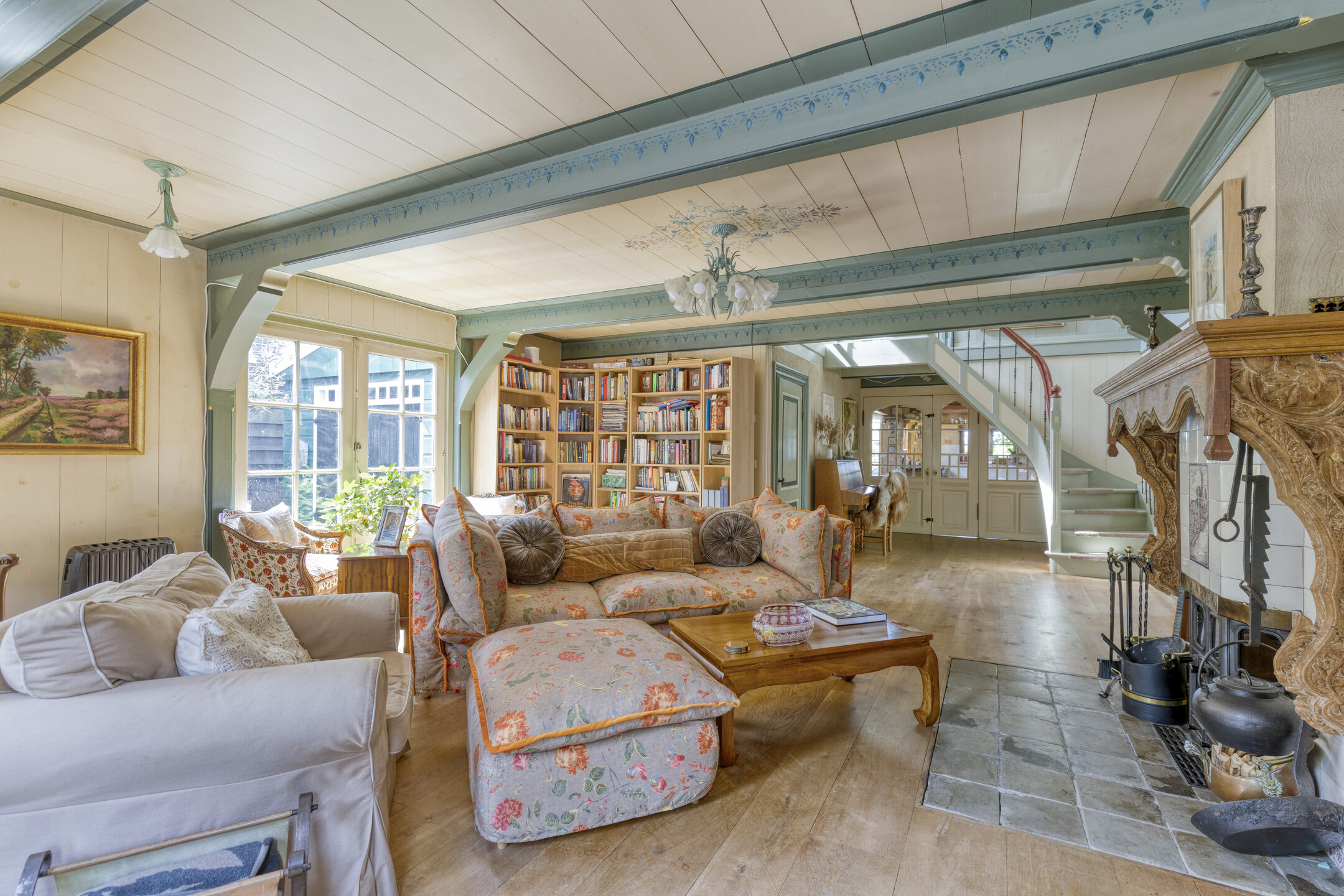 The entrance hall with guest toilet leads into the bright and spacious living room, where warmth and character are immediately apparent. Adjacent is the open-plan kitchen with underfloor heating and French doors to the garden. The kitchen is fully equipped with a 5-burner gas hob, extractor hood, dishwasher, multiple refrigerators and freezers, and a recently installed kitchen unit with two ovens – ideal for entertaining and long dinners.