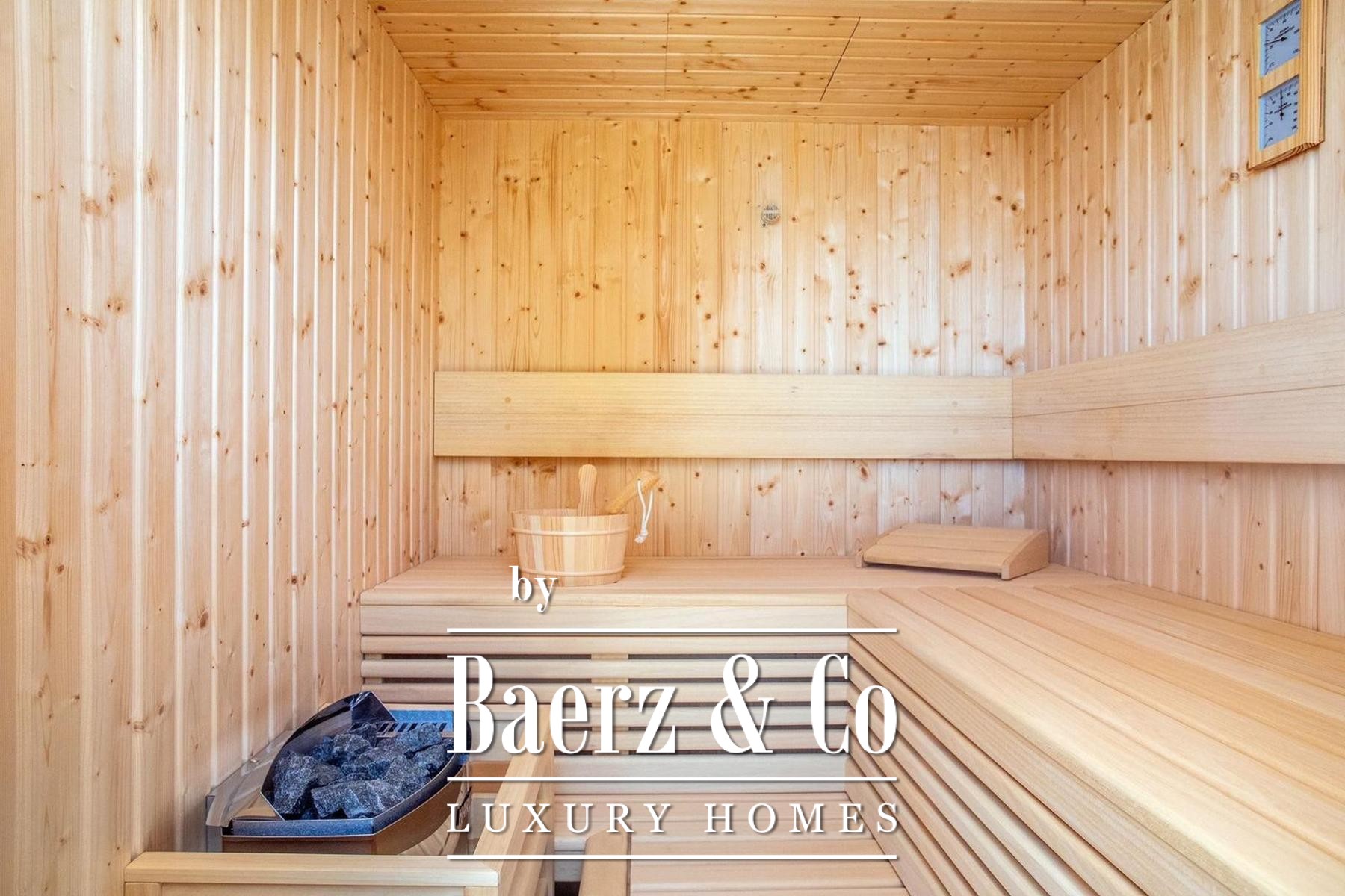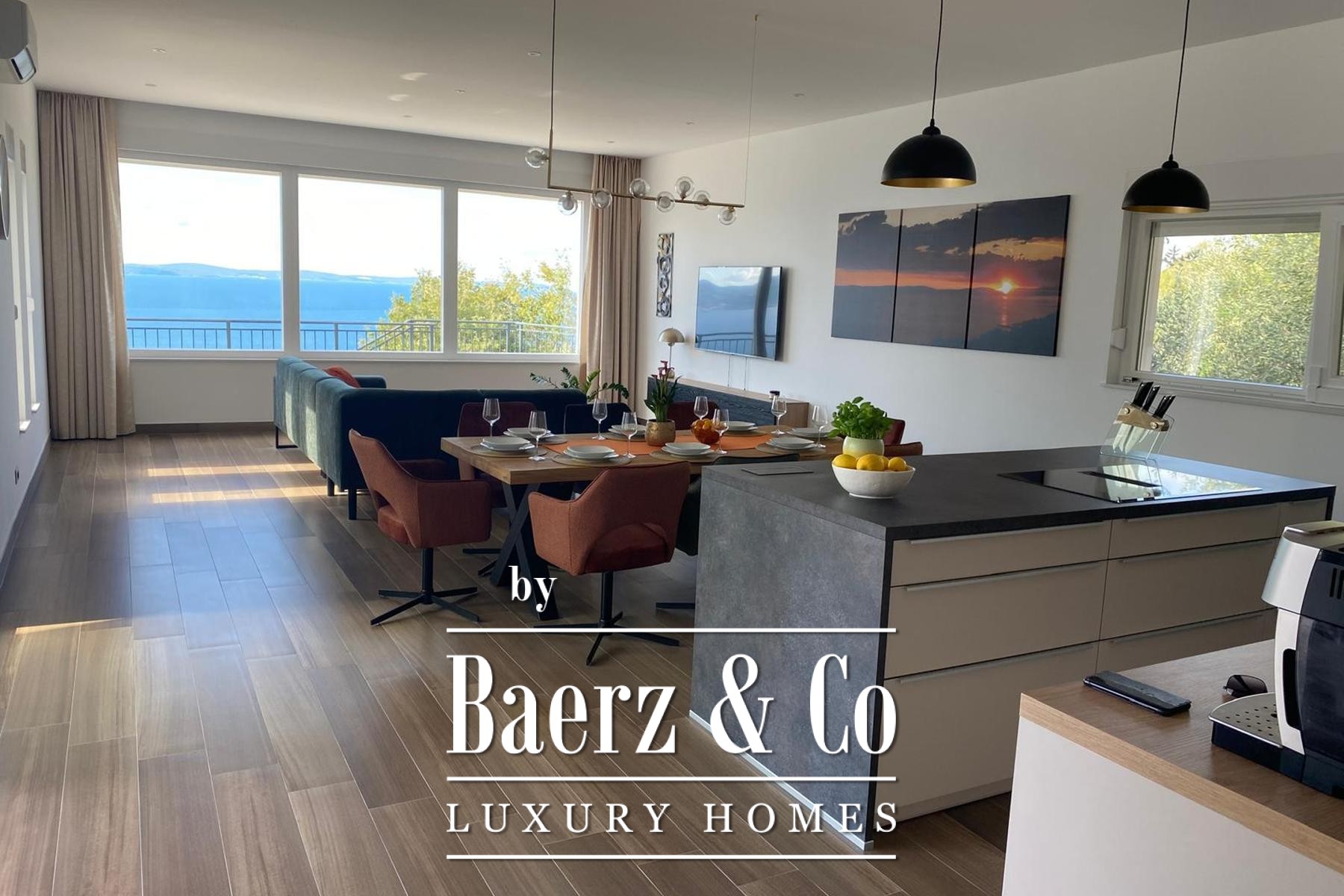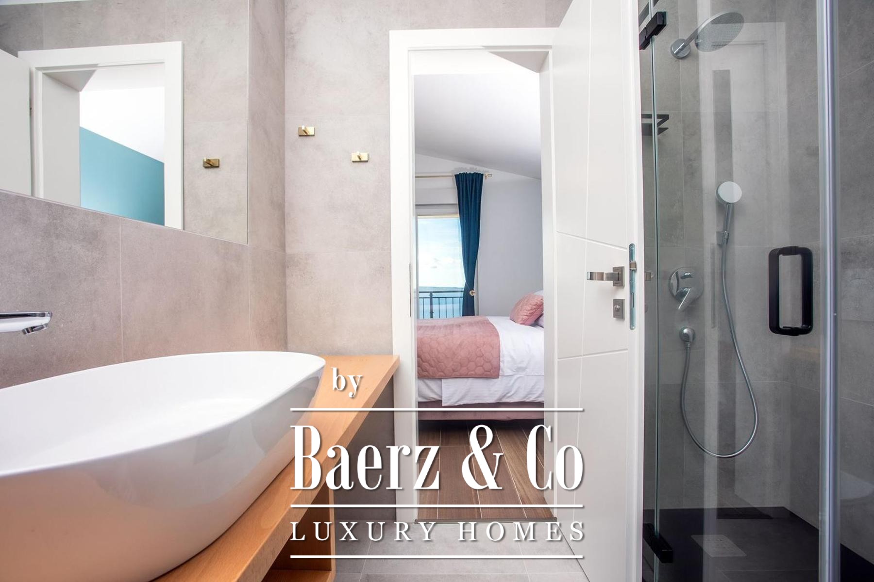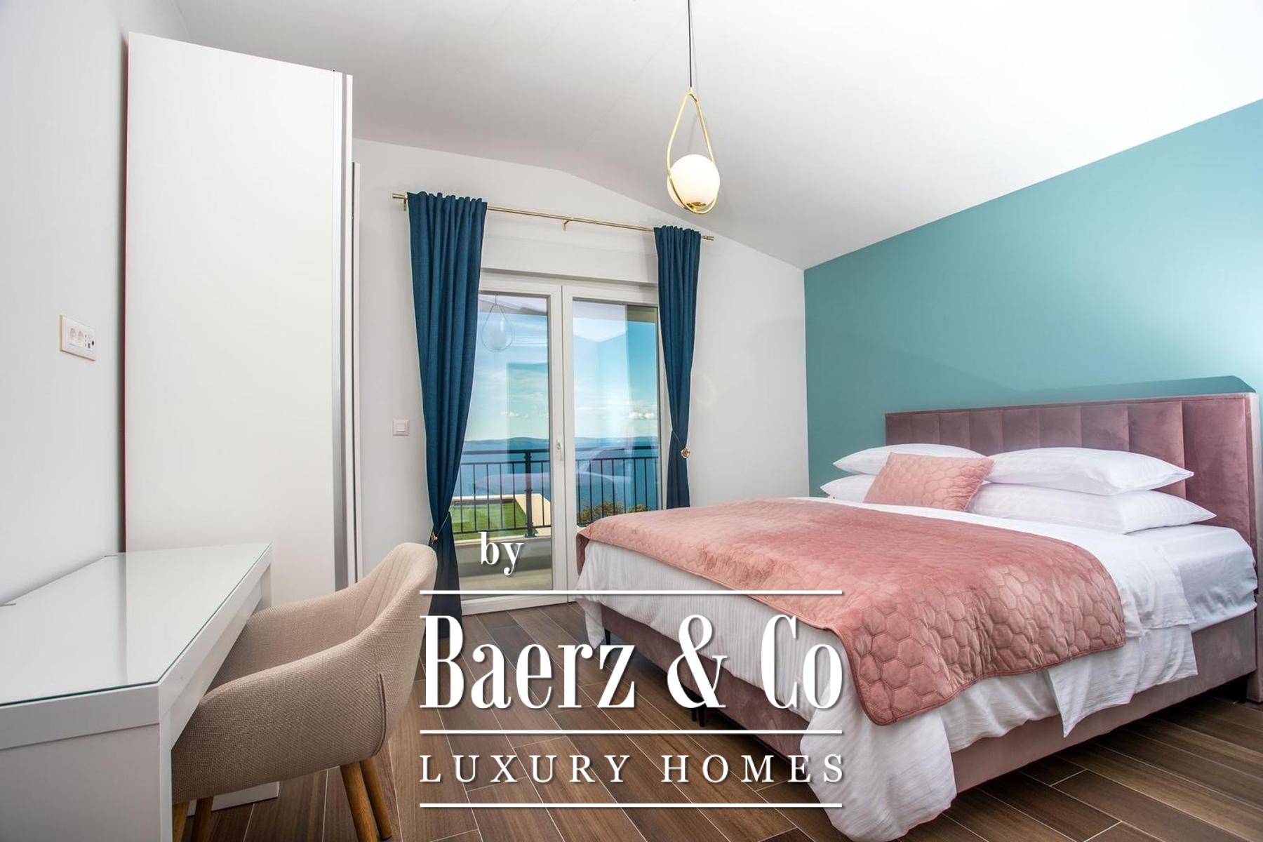 rooms. Every room enjoys a spectacular panoramic view of the sea and nearby islands, making this property truly exceptional.The exterior space is designed for relaxation and entertainment: a large 32 m² swimming pool with a 40 m² sunbathing area, a covered terrace, sauna, summer kitchen with fireplace, outdoor shower, storage room, and a beautifully landscaped garden with an automatic irrigation system.