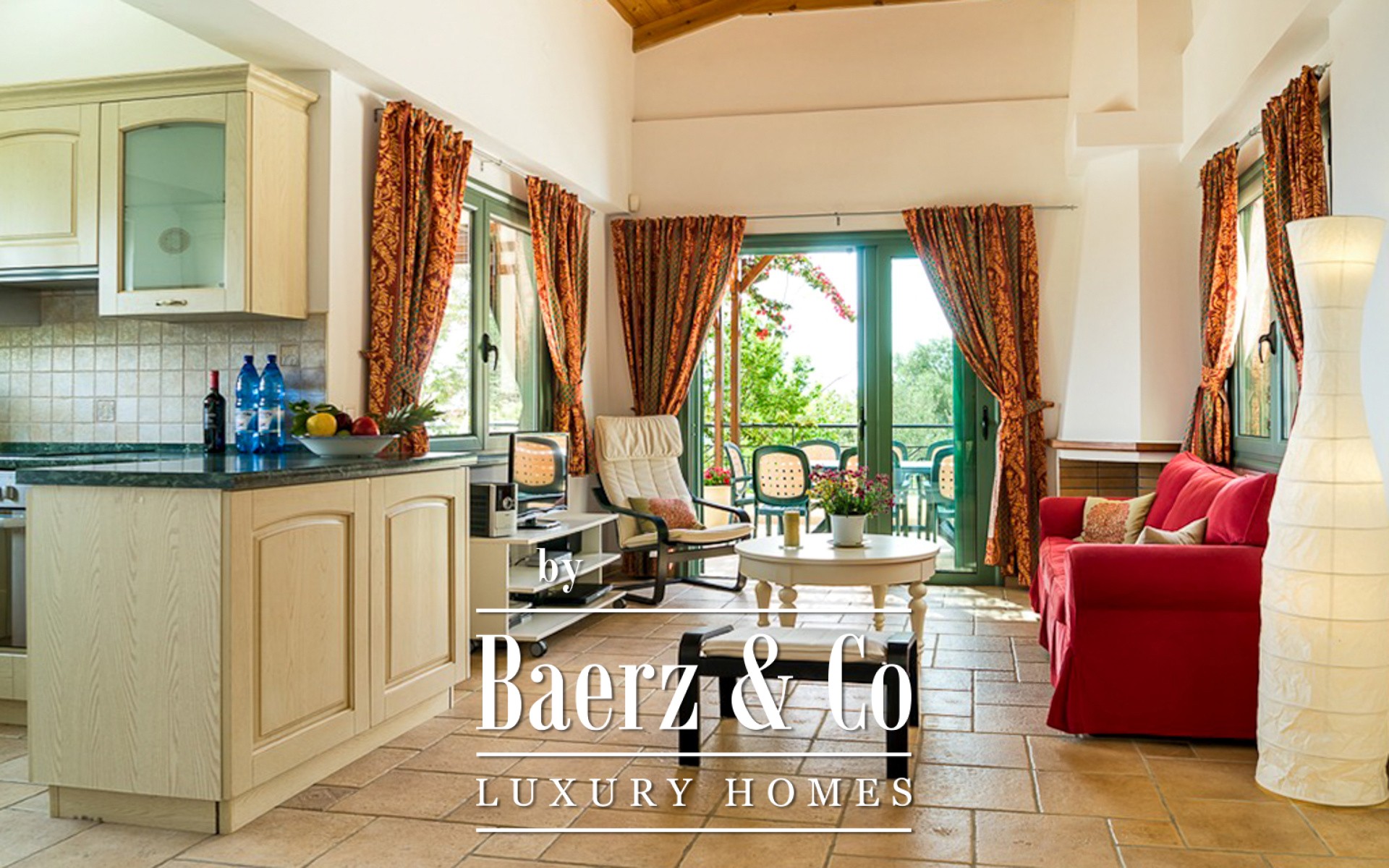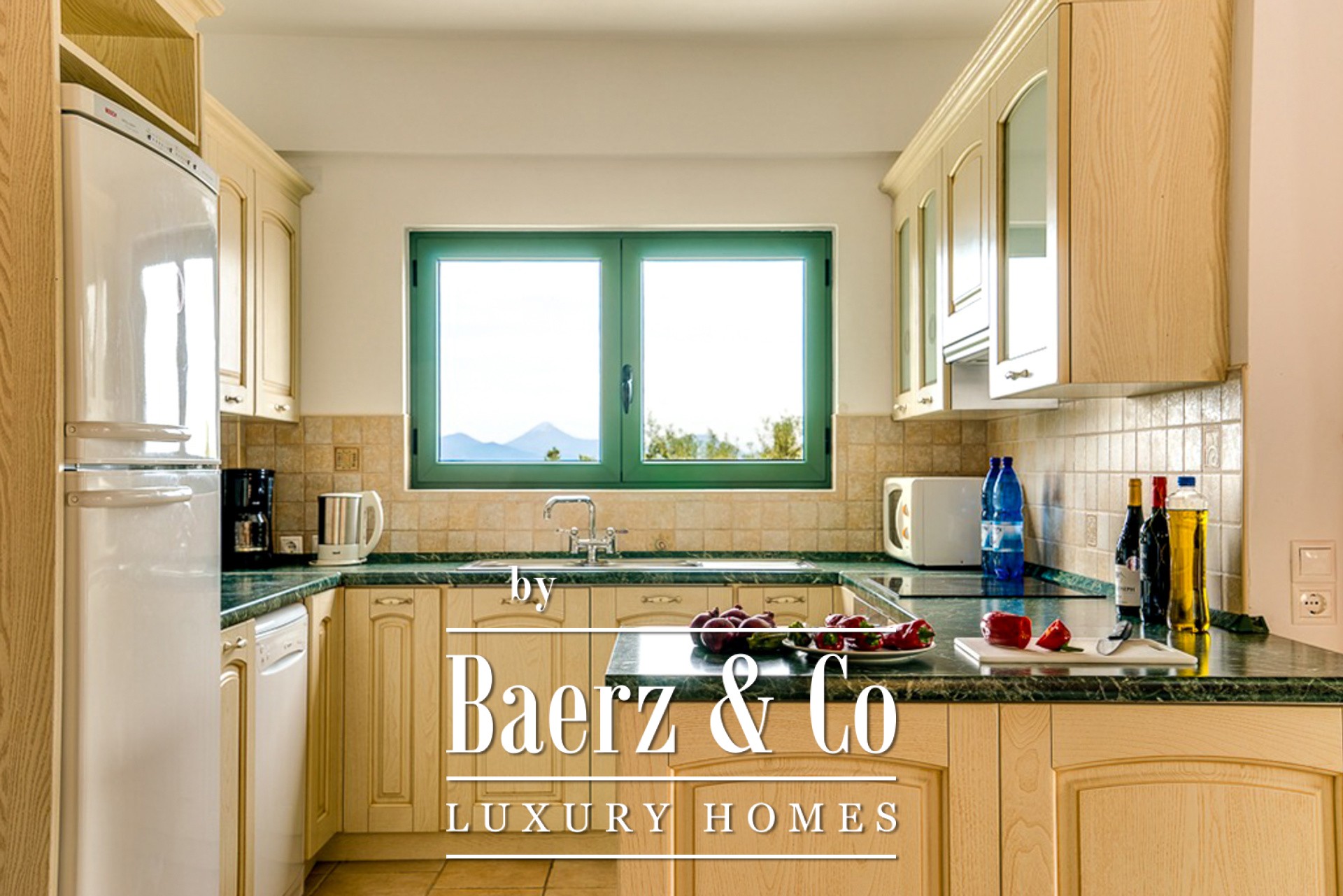 Distinctive features include underfloor heating in selected areas, air conditioning in all bedrooms and the guest apartment, a granite staircase, fireplace, and a fully equipped kitchen. Three private parking spaces and two shared spaces are provided within a legally defined co-ownership structure. The villa’s setting is peaceful yet accessible, with paved access and a landscape of mountain and nature views enhancing the sense of openness. Suitable for private residence or rental activity, Villa Ellomeno offers timeless quality and considered design on the Ionian coast.