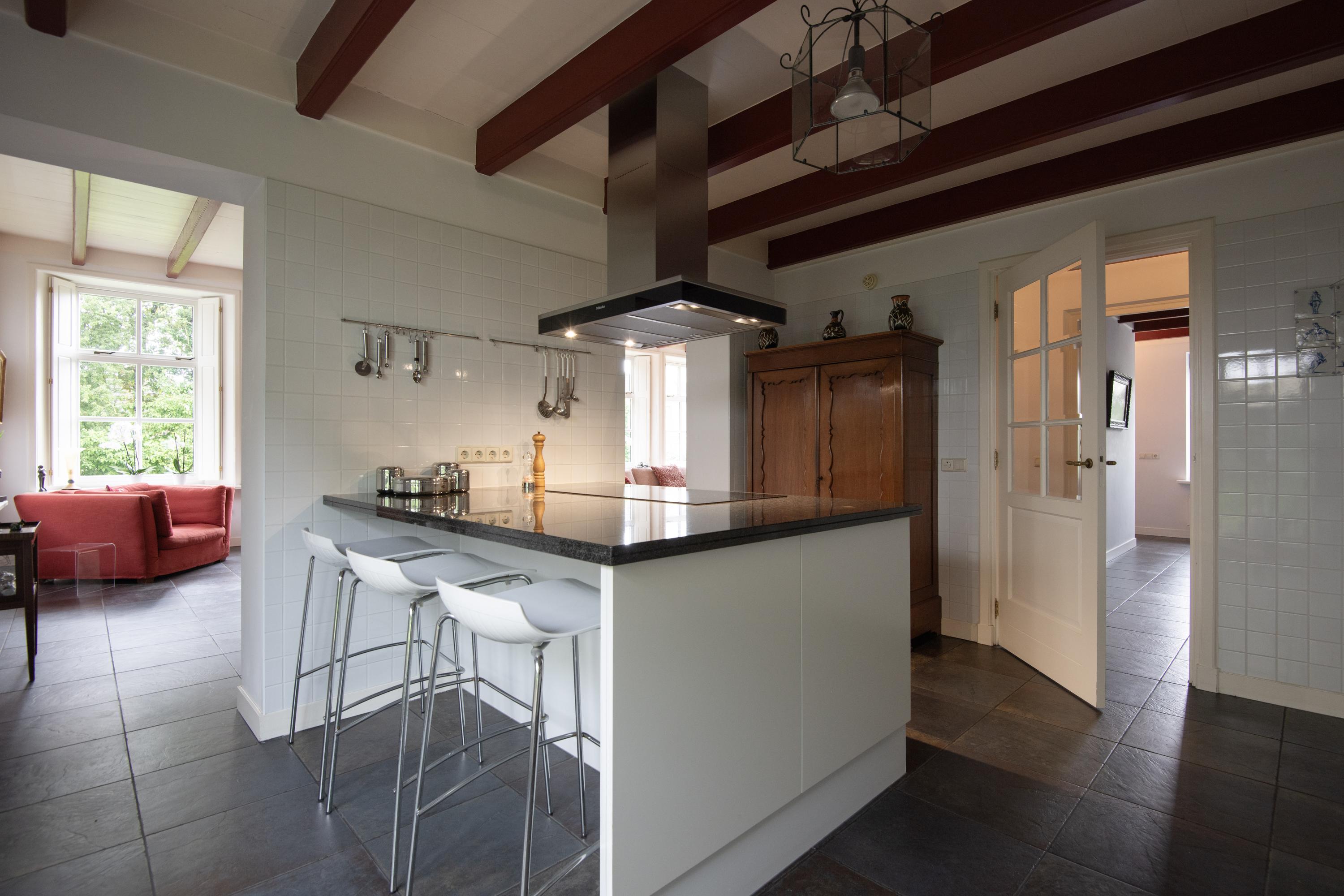 The original front door is located centrally in the front house but it is no longer used. The daily entrance is on the driveway side. The entrance is spacious and furnished with closets and a toilet. From the adjacent hallway is access to the living room. This sunny room with many skirted windows, flanked by interior shutters, breathes -with the almost three-meter high beamed ceiling- a pleasant atmosphere. In addition to the luxurious ceramic floor with underfloor heating, there is a natural stone fireplace with an open gas fire. In the living room are two passages that offer a view of the adjacent dining kitchen. This space offers access to the south-facing terrace through double French doors. Three mature Plane trees act as natural umbrellas there in the summer.