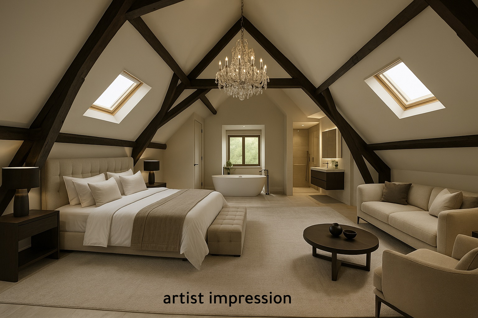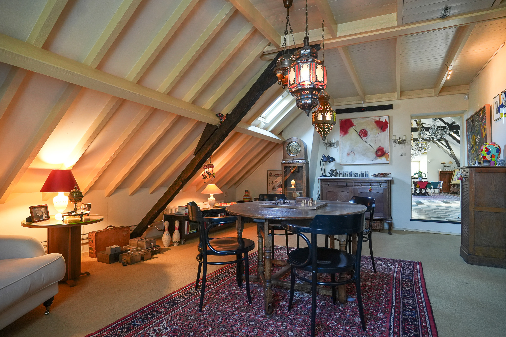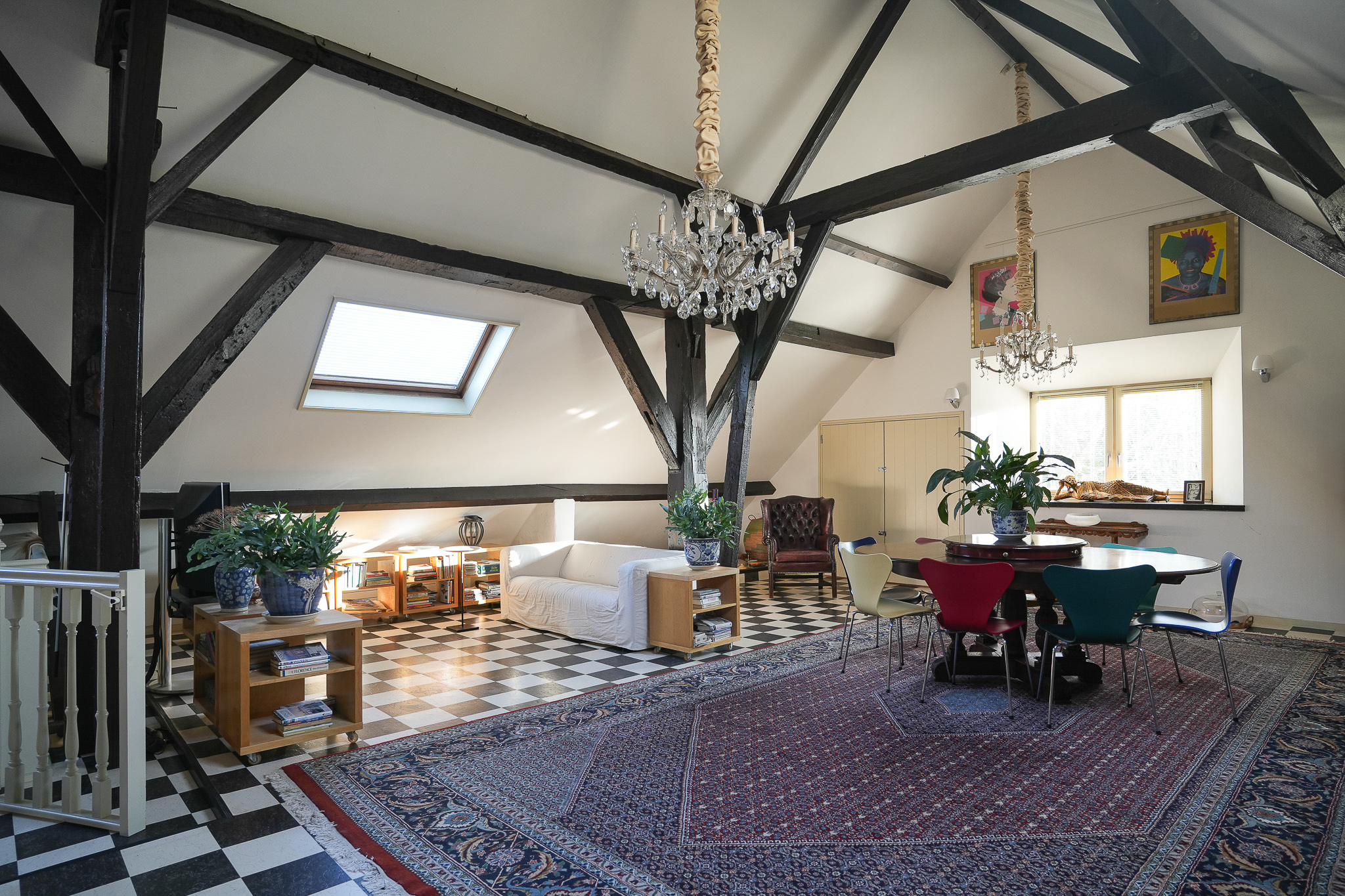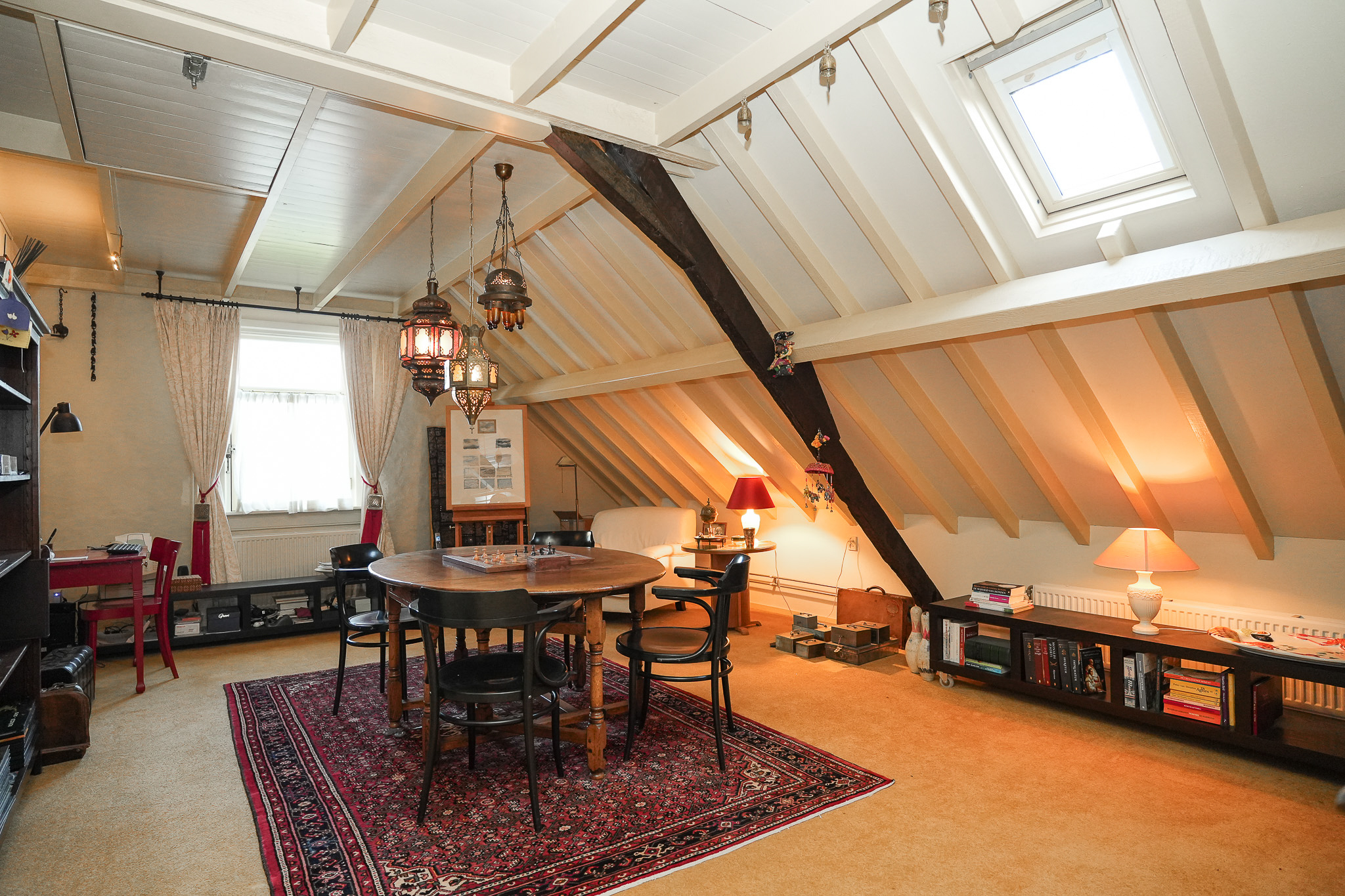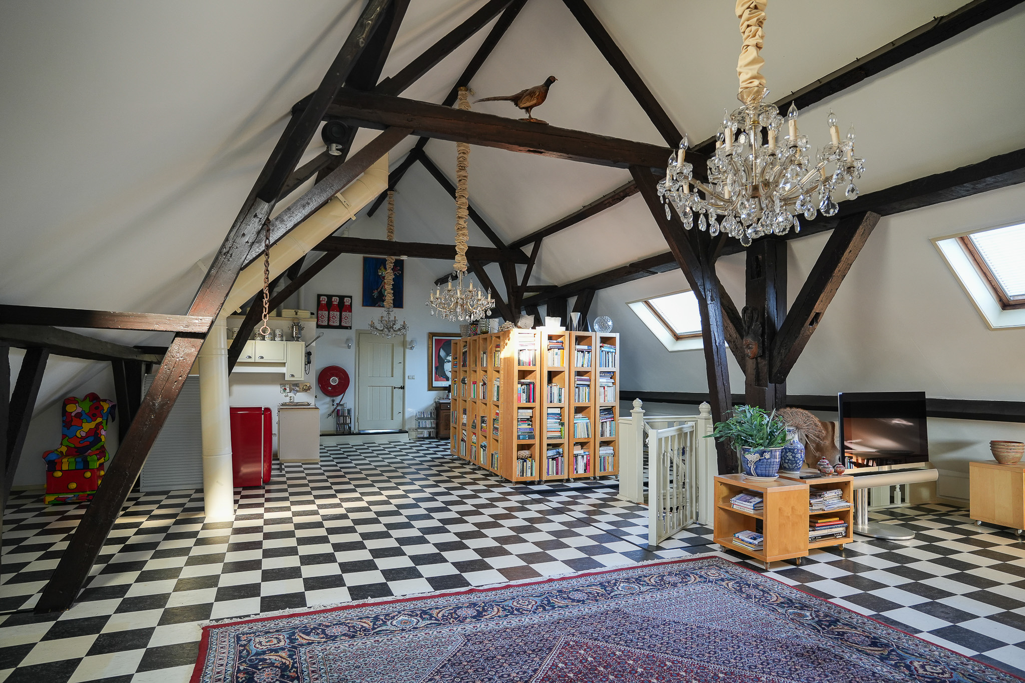 The upper floor above the rear wing surprises with its impressive 4.5-metre ridge height and the open character of the former hayloft. The current owners have used this area as a meeting room, with the pantry proving highly practical. This level can easily be reconfigured to create additional bedrooms and a bathroom; an optional floor plan is available to illustrate the possibilities. Creating a luxurious private suite is also conceivable.