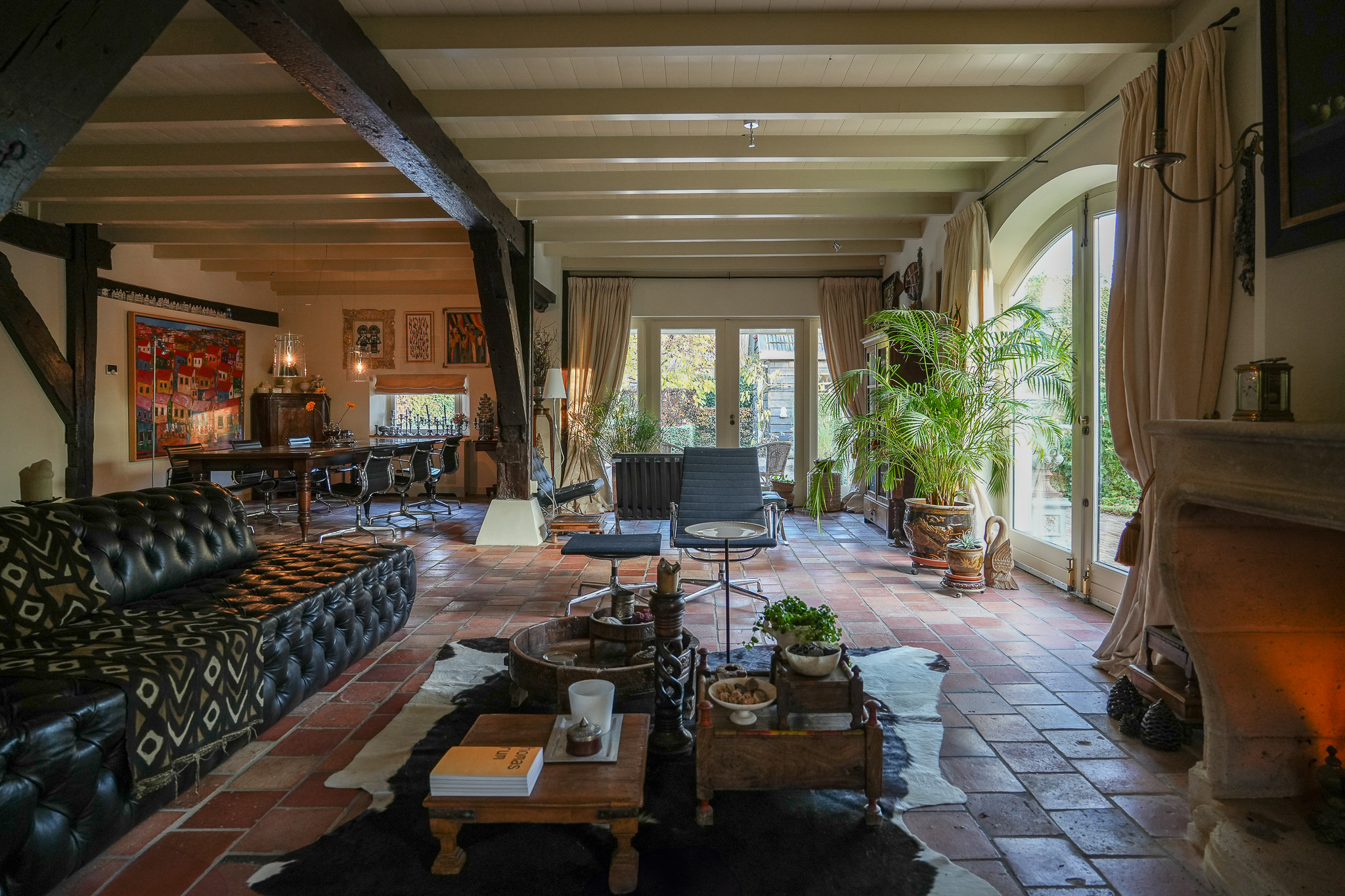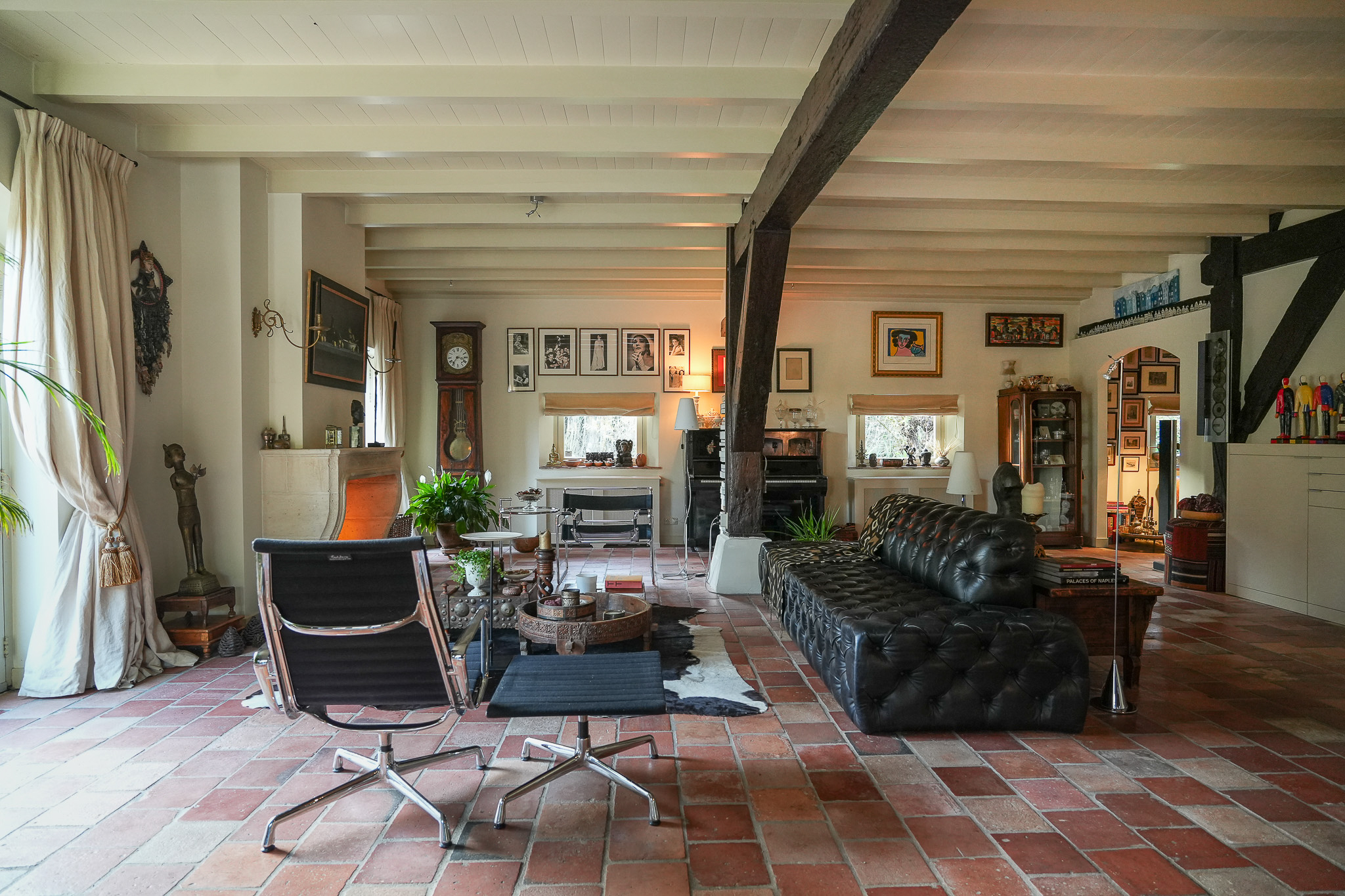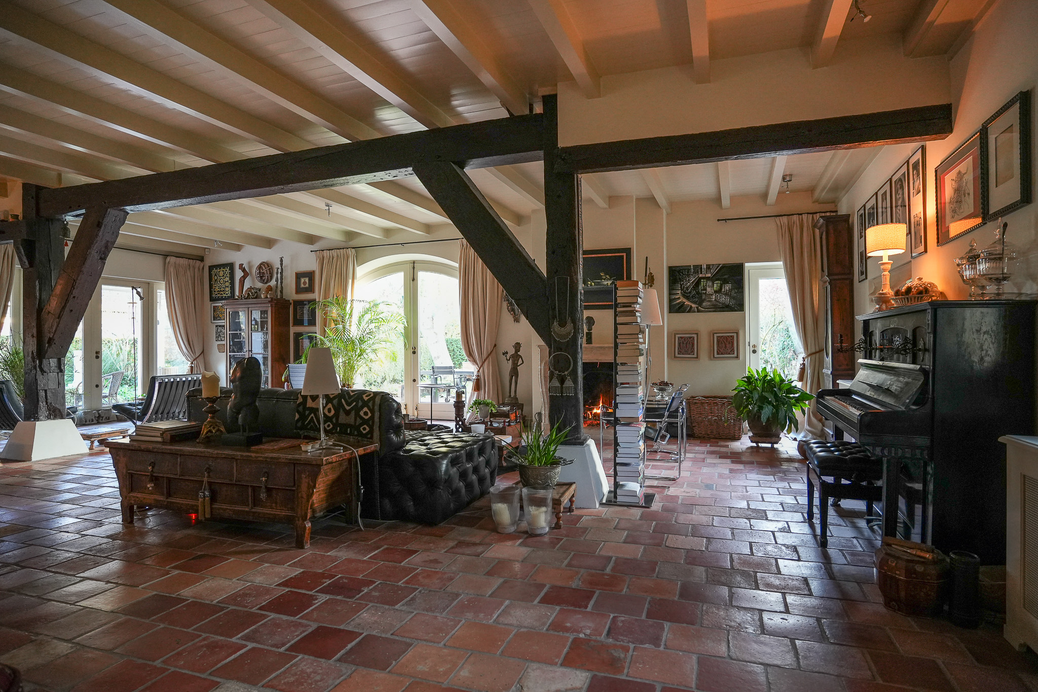 A spacious hall opens to the bright, garden-facing living room in the former barn, a cosy country kitchen with access to the wine cellar, and a central corridor with an adjacent bedroom with open fireplace, dressing room, the first bathroom, and a study overlooking the garden — all on the ground floor.