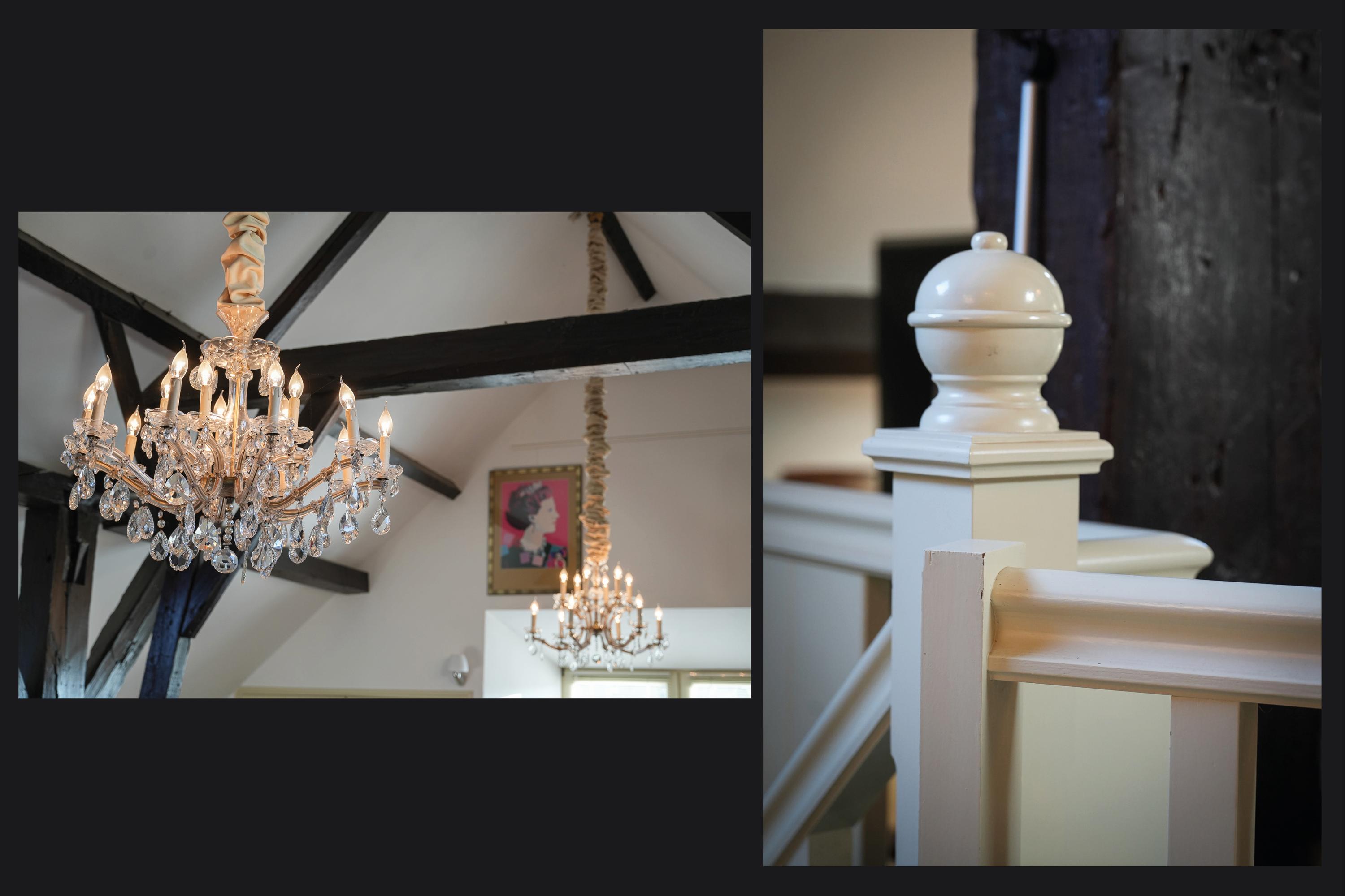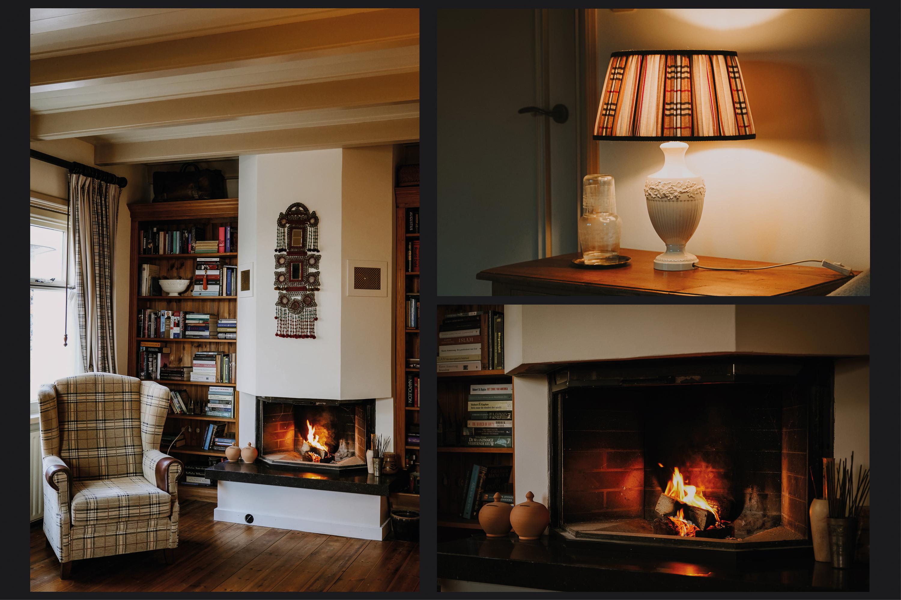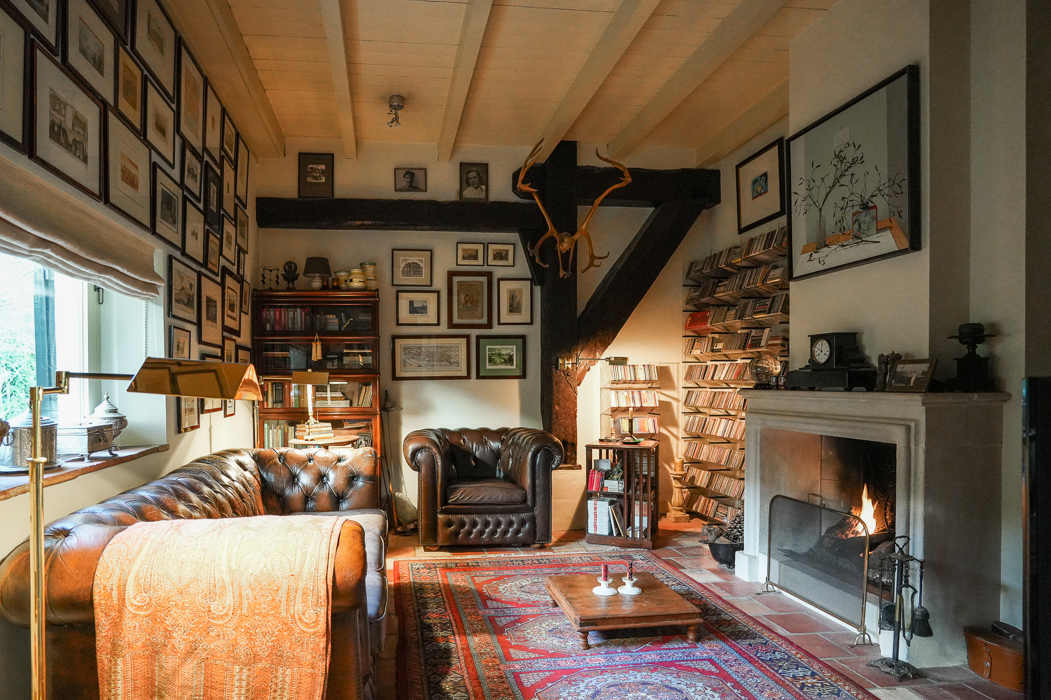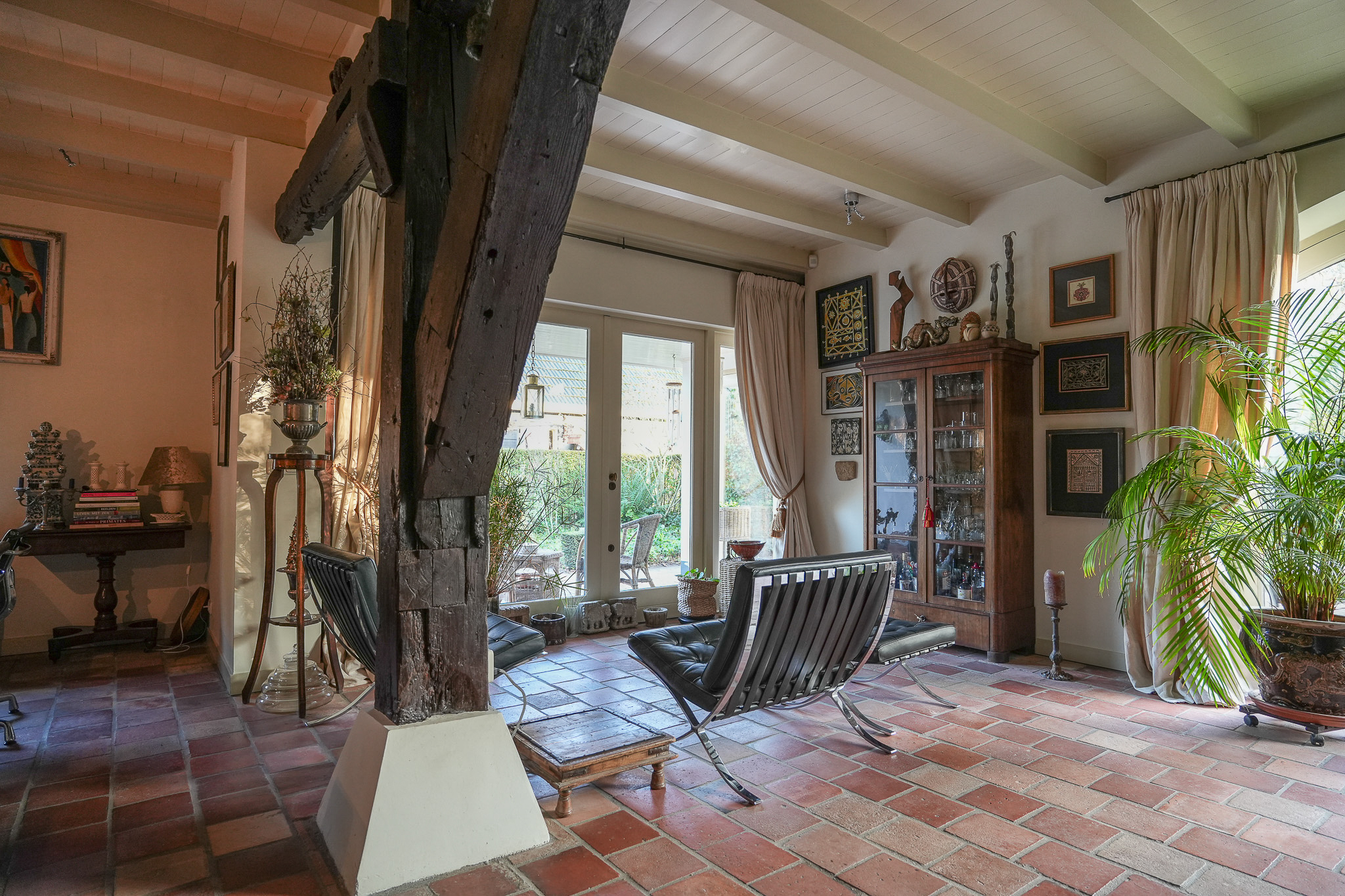 The entrance on the driveway side leads into a generous hallway with cloakroom and toilet. A glazed door opens into the former barn, now a spacious living room. The impressive sandstone fireplace with open hearth, the timber trusses and a floor laid with antique red tilestones create a warm and inviting atmosphere. The floor here — as in the hall — benefits from underfloor heating.
