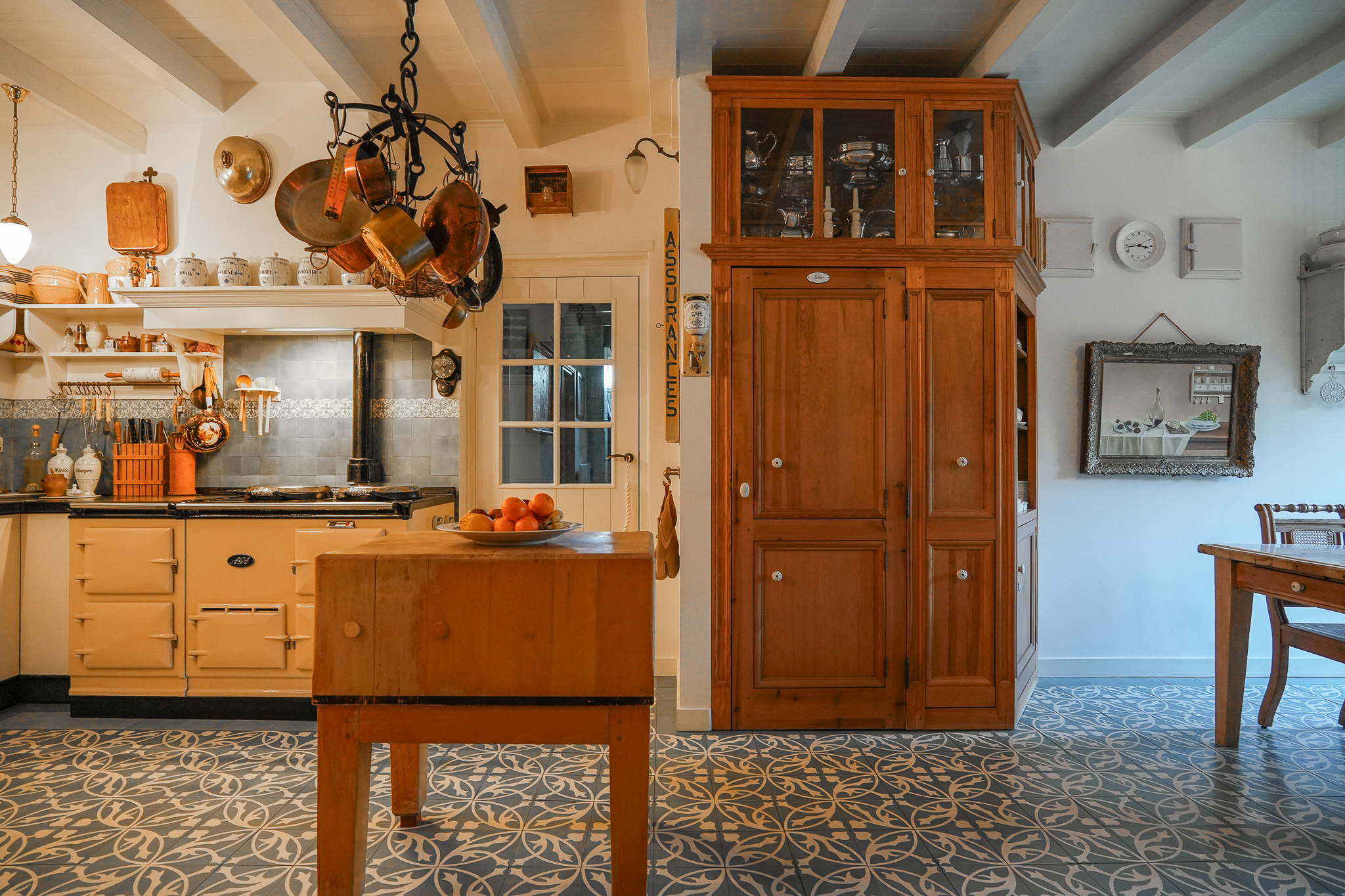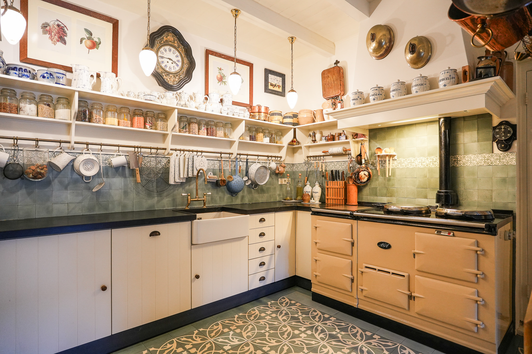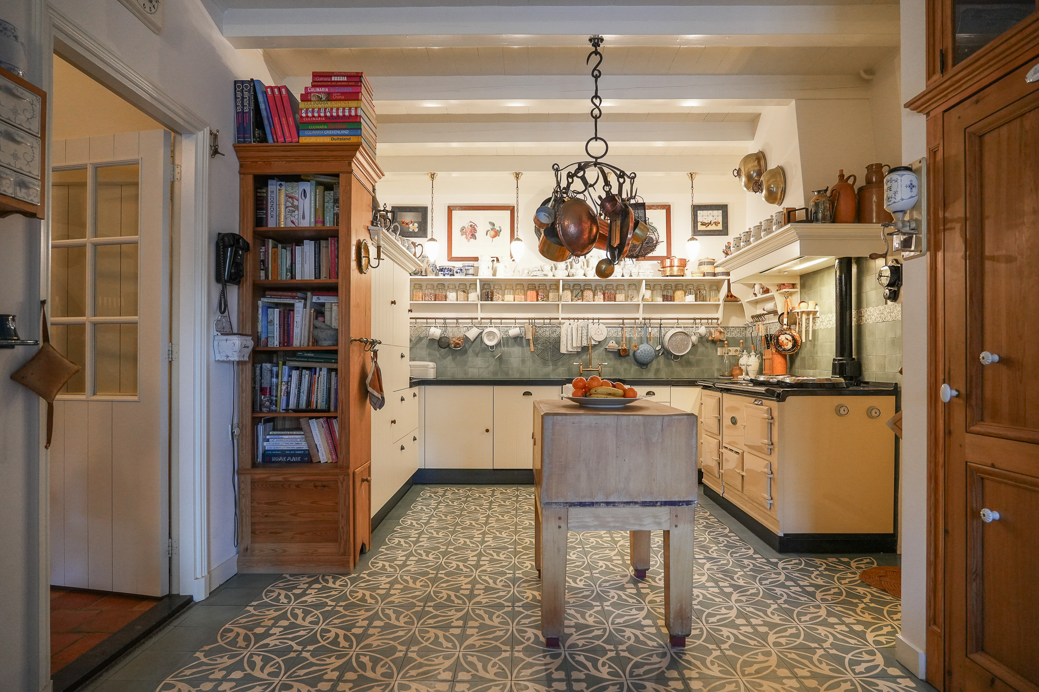 The kitchen forms the heart of the home and offers access to the side garden through double doors. Its classic ambiance is enhanced by the four-oven Aga cooker (equipped with a clock thermostat for energy efficiency), the natural stone worktop with porcelain sink, brass tap and Portuguese floor tiles.
