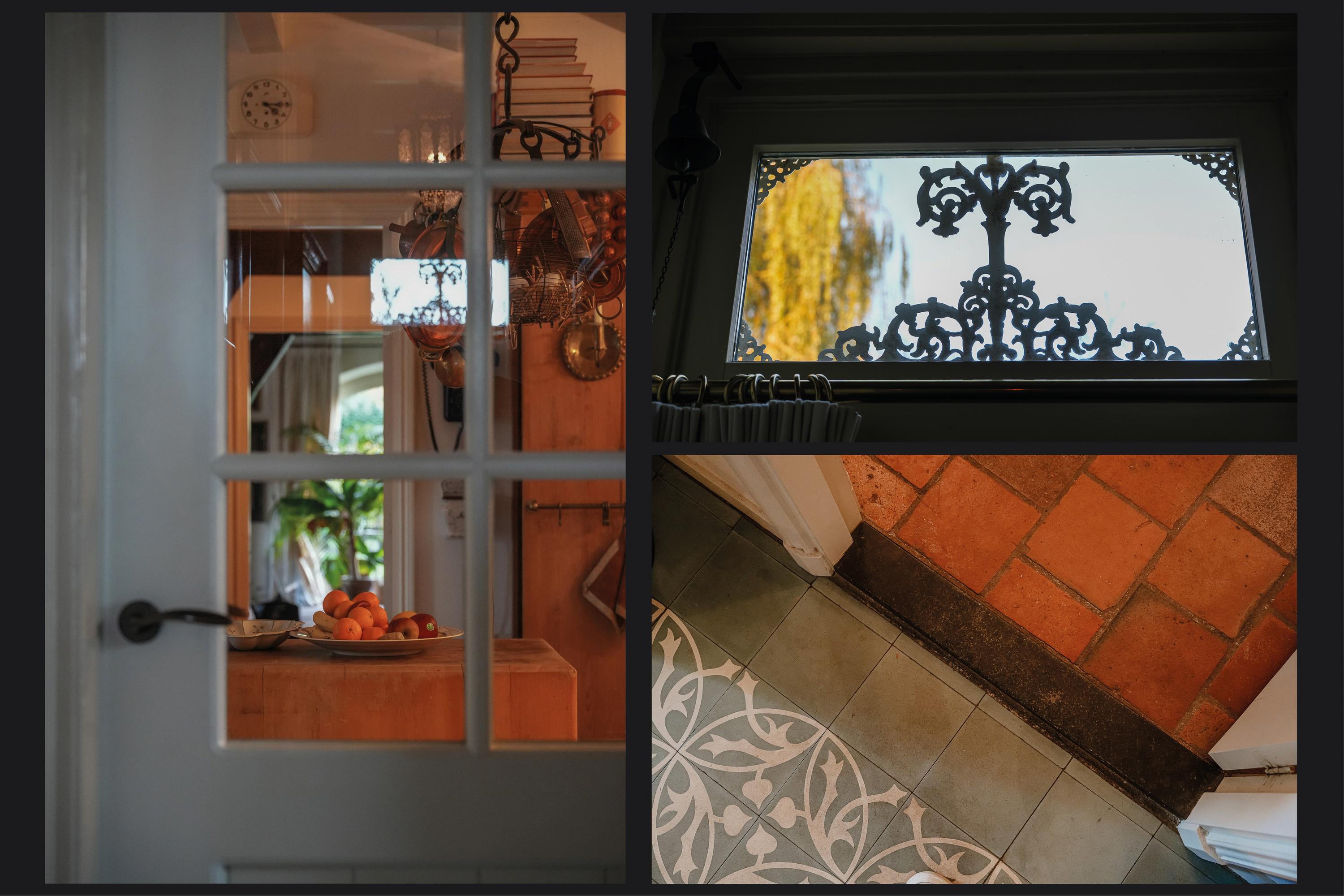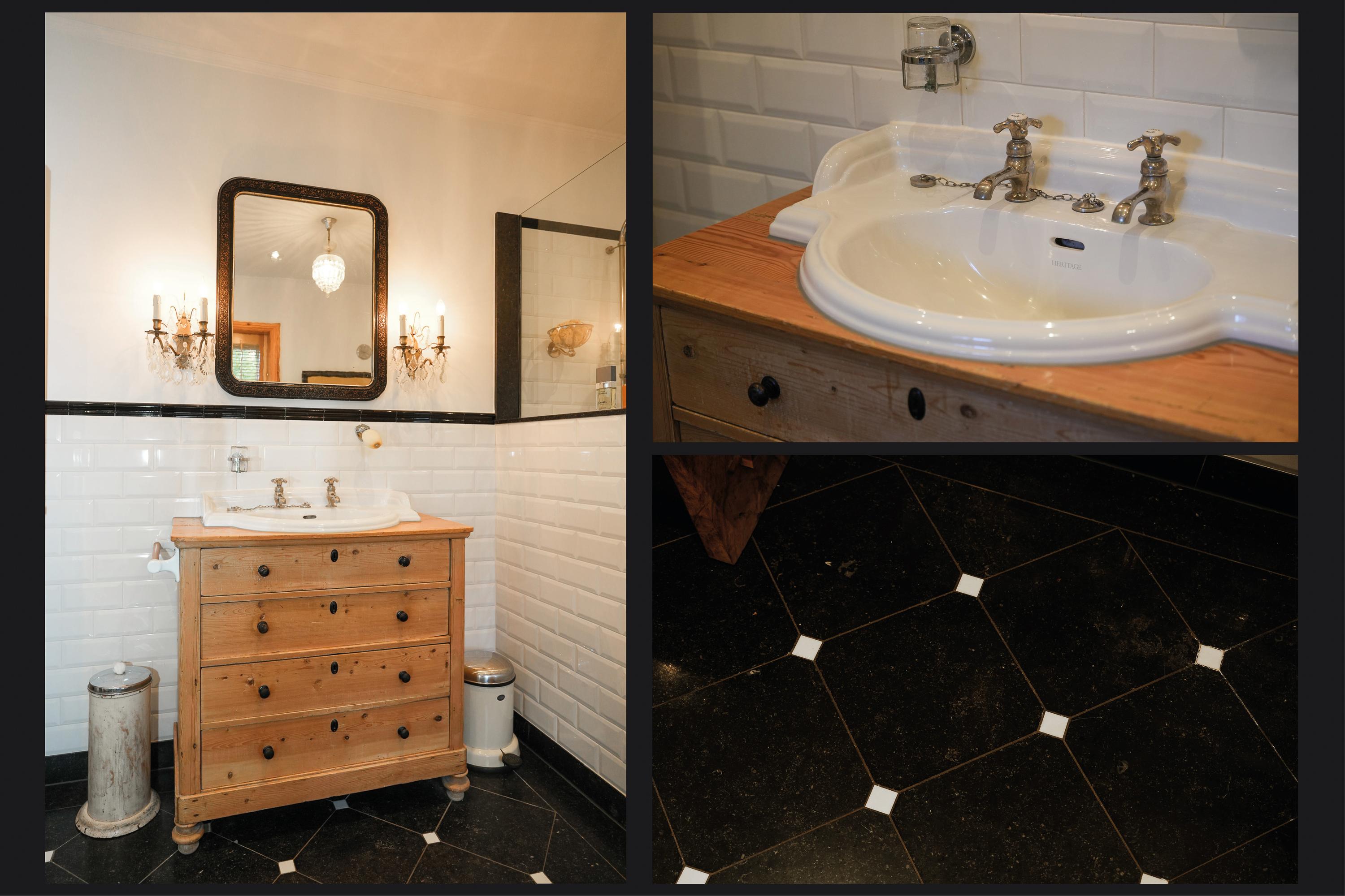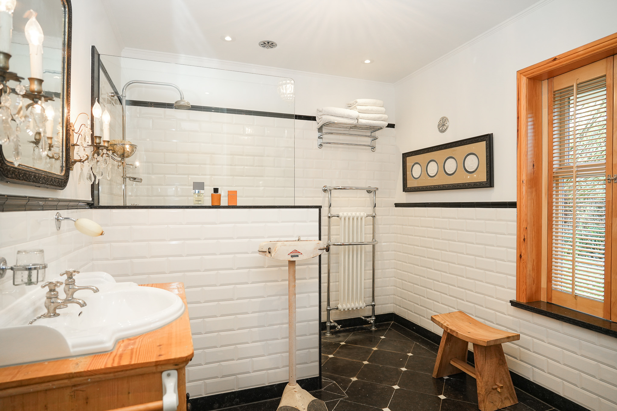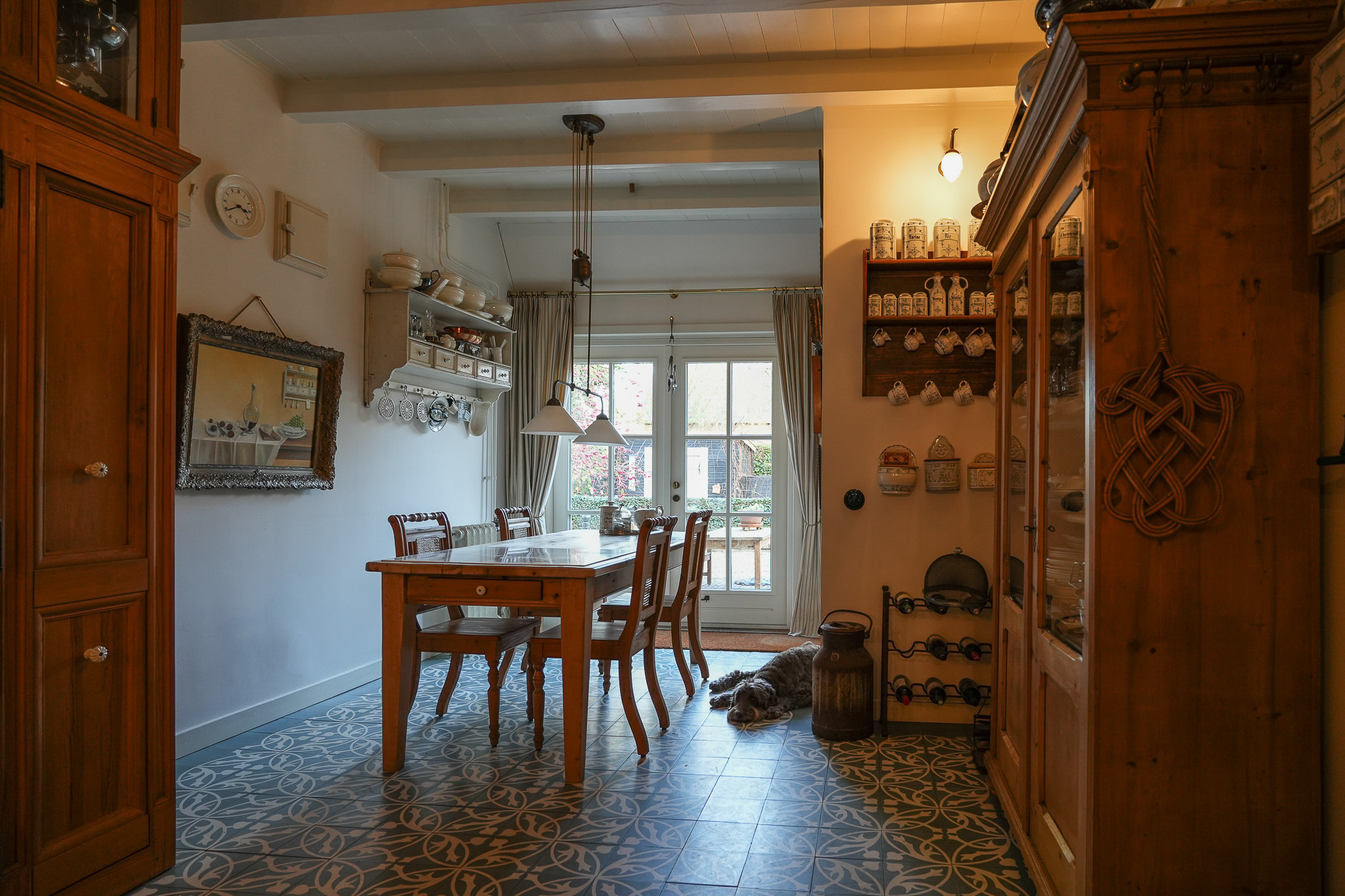 The kitchen forms the heart of the home and offers access to the side garden through double doors. Its classic ambiance is enhanced by the four-oven Aga cooker (equipped with a clock thermostat for energy efficiency), the natural stone worktop with porcelain sink, brass tap and Portuguese floor tiles.