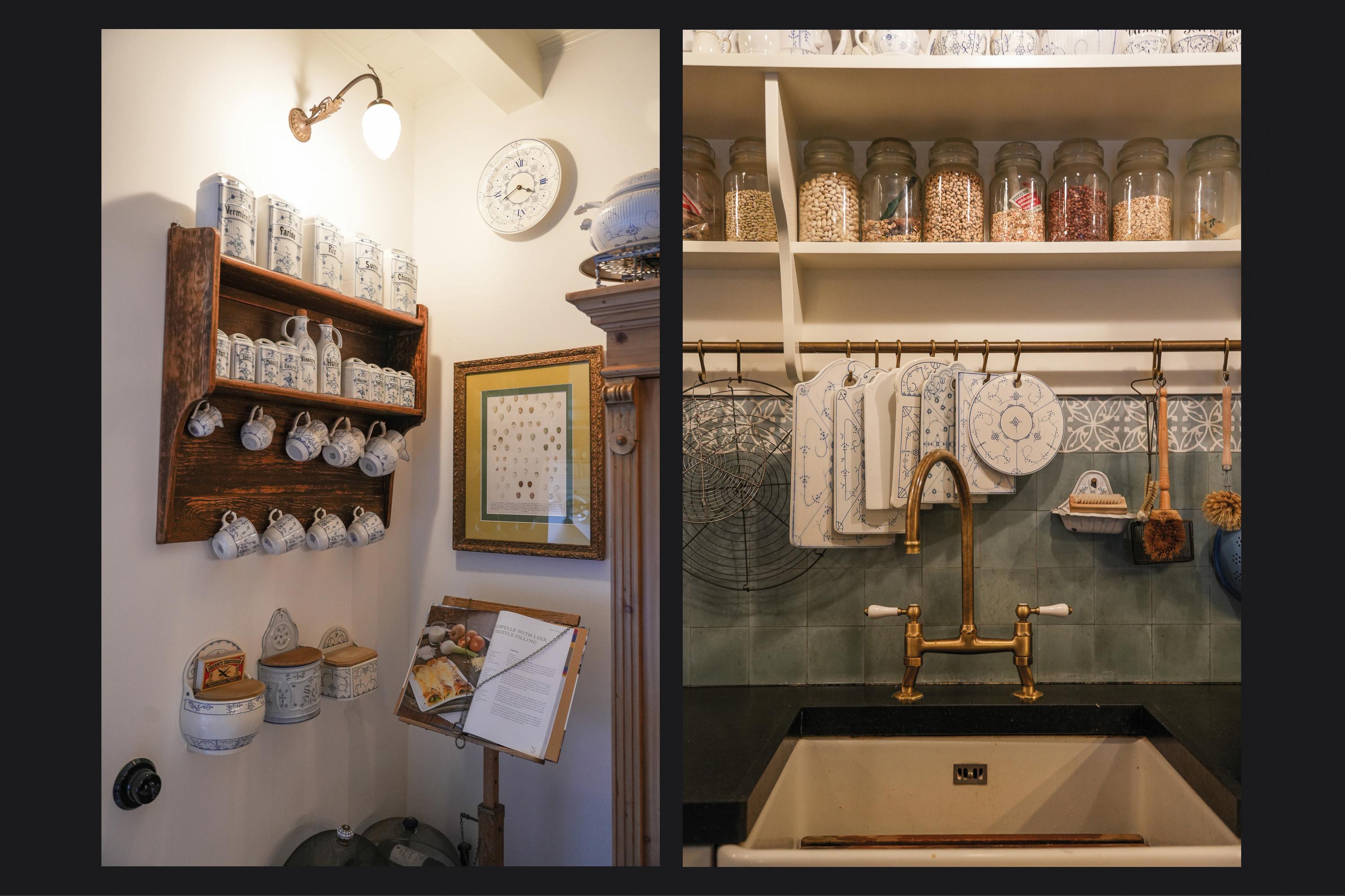 The kitchen includes several hand-crafted built-in bookcases, one of which conceals the entrance to the wine cellar.