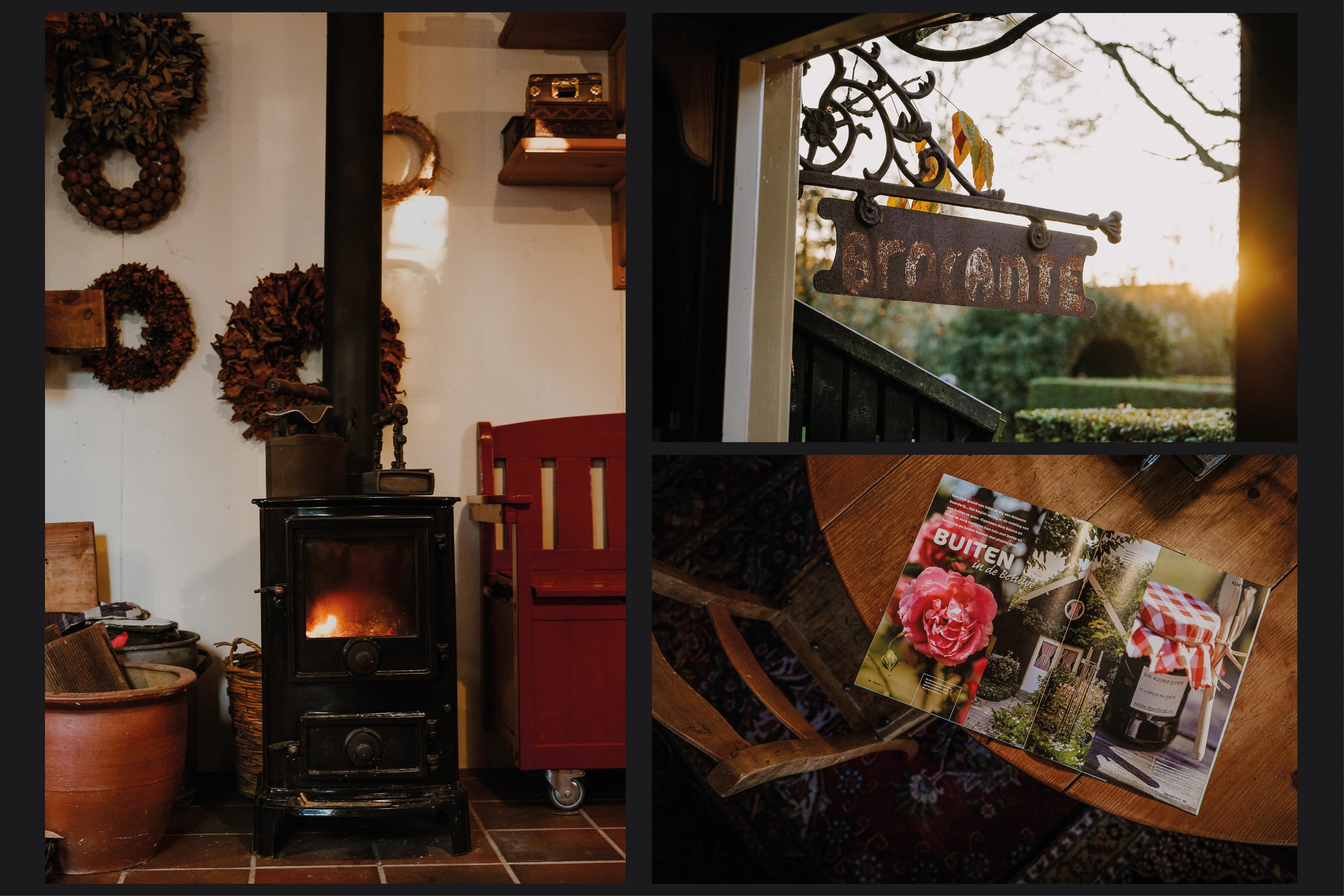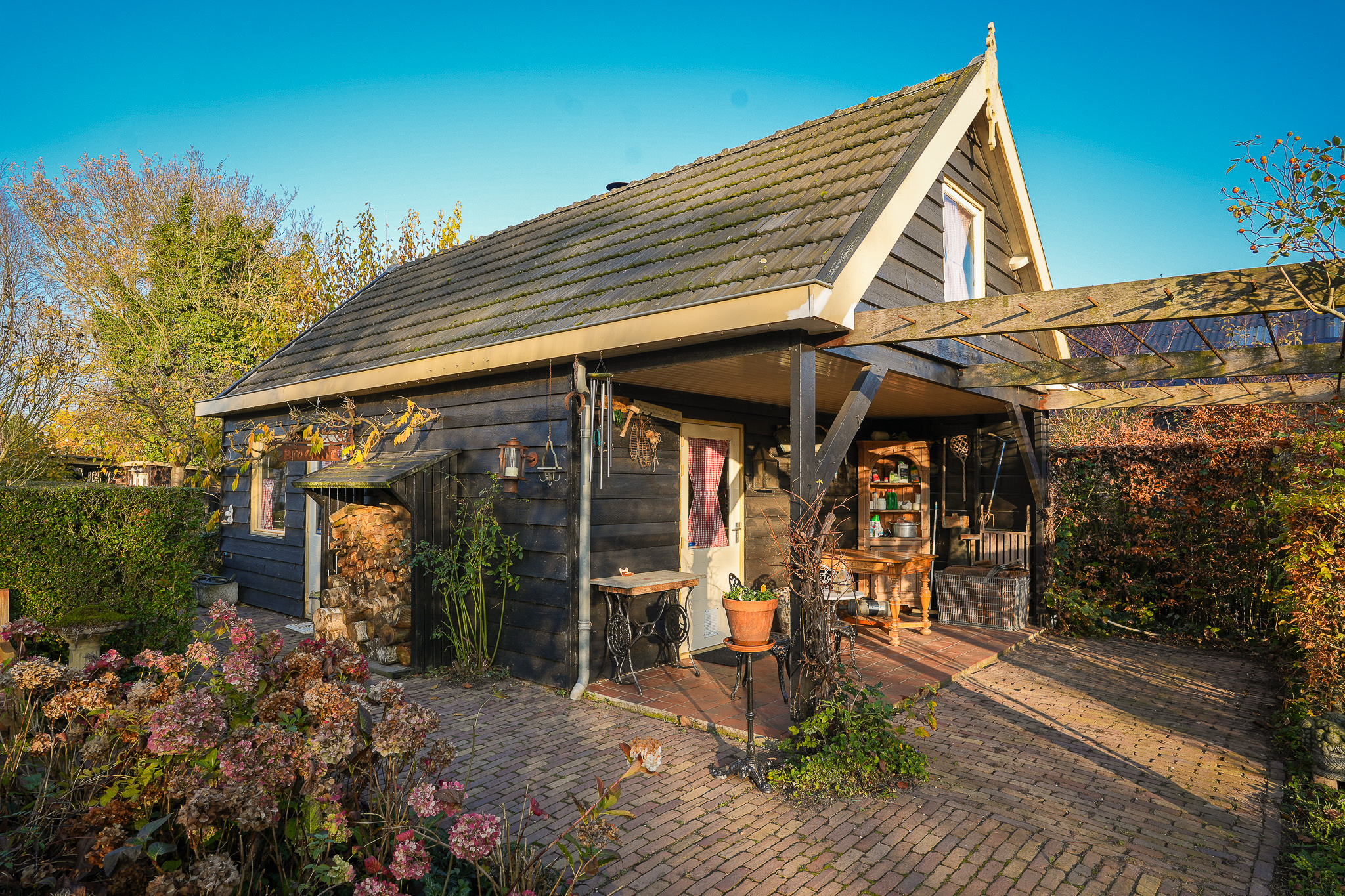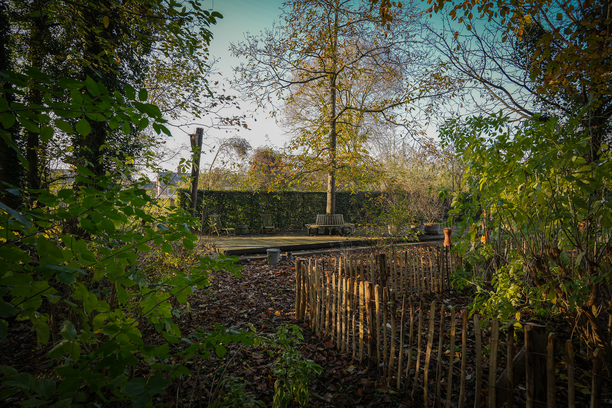 At the back of the garden stands an insulated outbuilding with wood-burning stove and kitchenette. The owners have used this space for selling brocante items. The outbuilding features French doors opening onto a 10 m² covered terrace — ideal for guests, teenagers, an atelier or a quiet workspace.