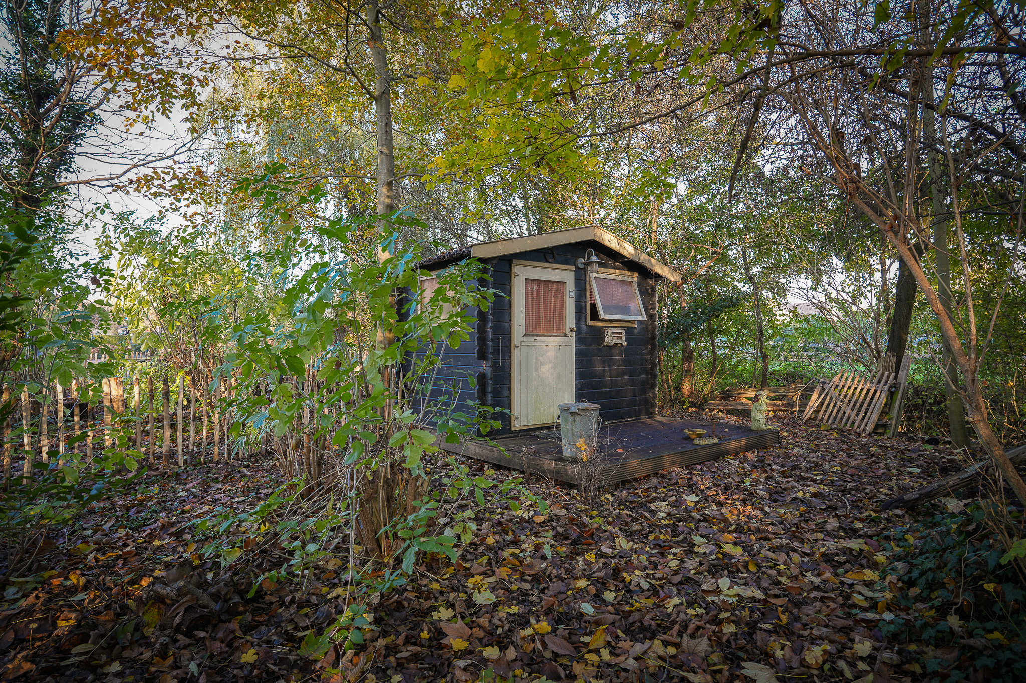 The outbuilding may be significantly enlarged with the appropriate permit. Beyond it, the south-facing plot extends into the private woodland. At its entrance are an animal shelter with outdoor run, a large decked terrace and a wildlife pond. Altogether, it forms a lush, park-like enclave inhabited by many bird species and other wildlife. Hedgehogs, blackbirds, thrushes, finches, robins, nuthatches, woodpeckers, hares and pheasants are frequent visitors. Nesting boxes for birds, butterflies and bats are dotted throughout the area and are used abundantly each year.
