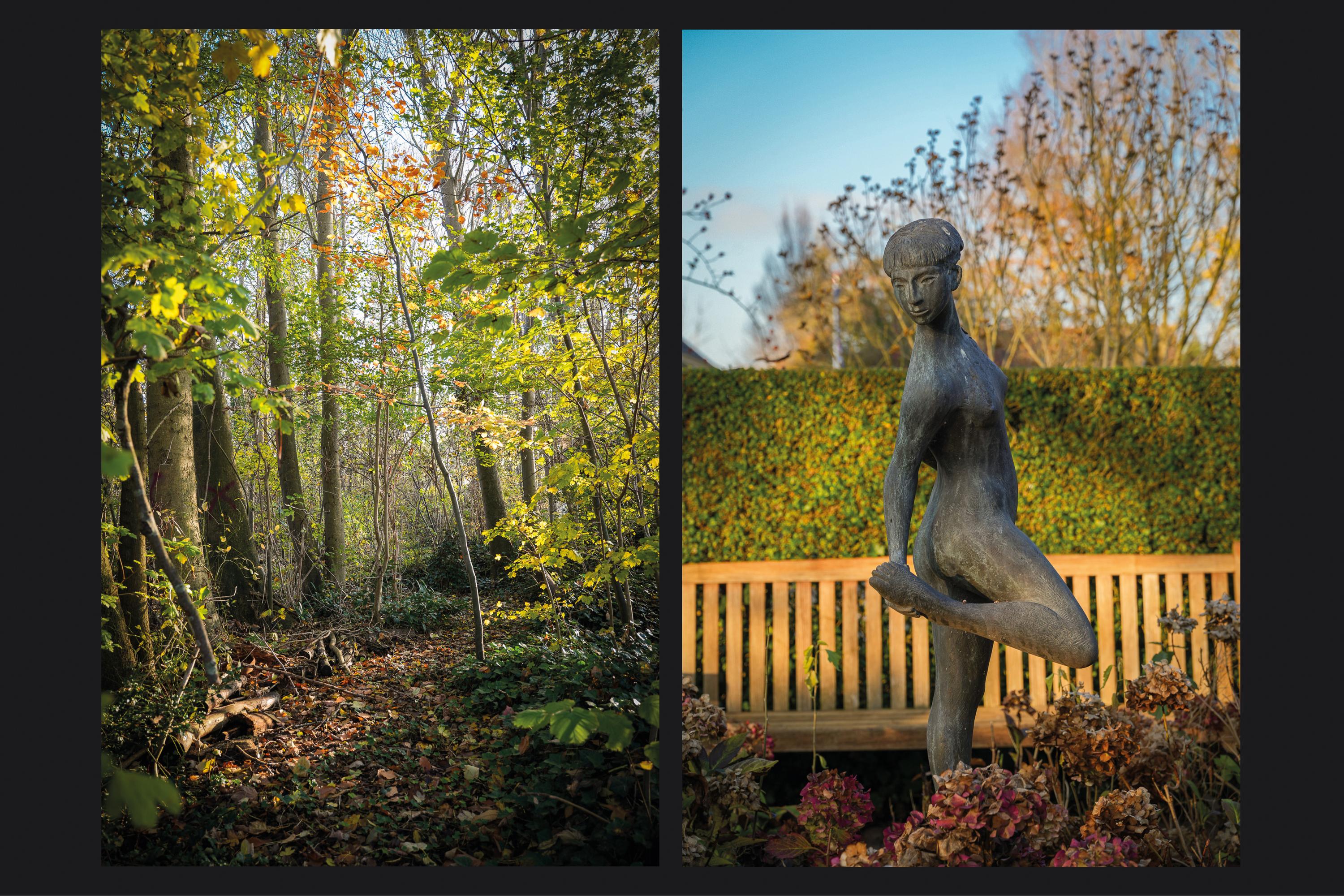 French doors open onto the terrace and the garden, which stretches more than 100 metres into the private woodland at the rear.