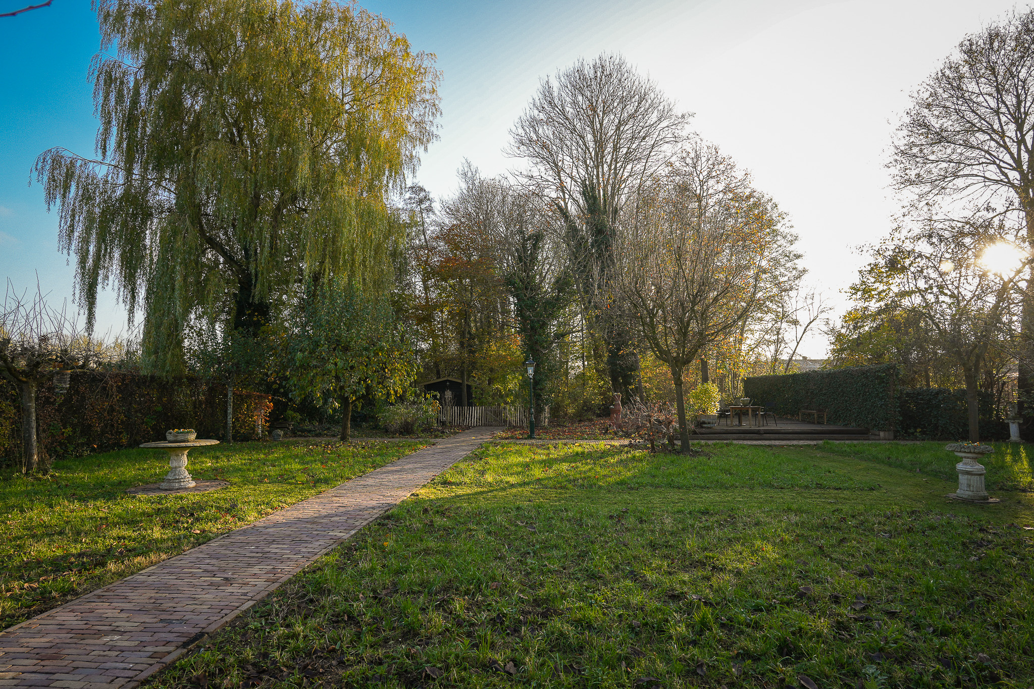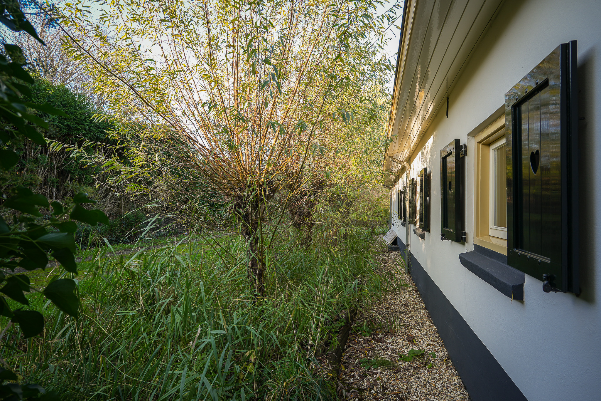 The nearly 5,000 m² plot — including a low-maintenance flower garden — is a true haven for birds and insects. The grounds are bordered by pollard willows, while an old plum tree and a characteristic weeping willow grace the front garden. To the left of the farmhouse is a driveway for several cars, with space for two vehicles beneath the carport.