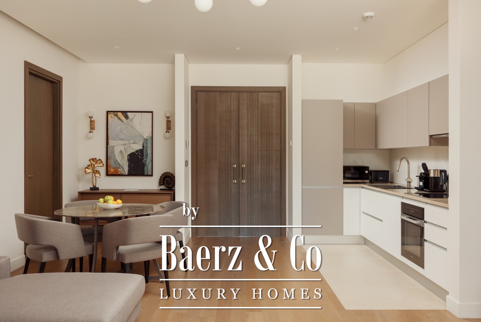 Inside, the layout flows from a hallway into a living room with integrated kitchen and dining, leading to a private bedroom, a full bathroom and an additional guest toilet. Meticulously furnished and move-in ready, the residence extends refined comfort while offering access to pools, beaches and sports courts within the complex. Maintenance services are available, underscoring an effortless pace of life.