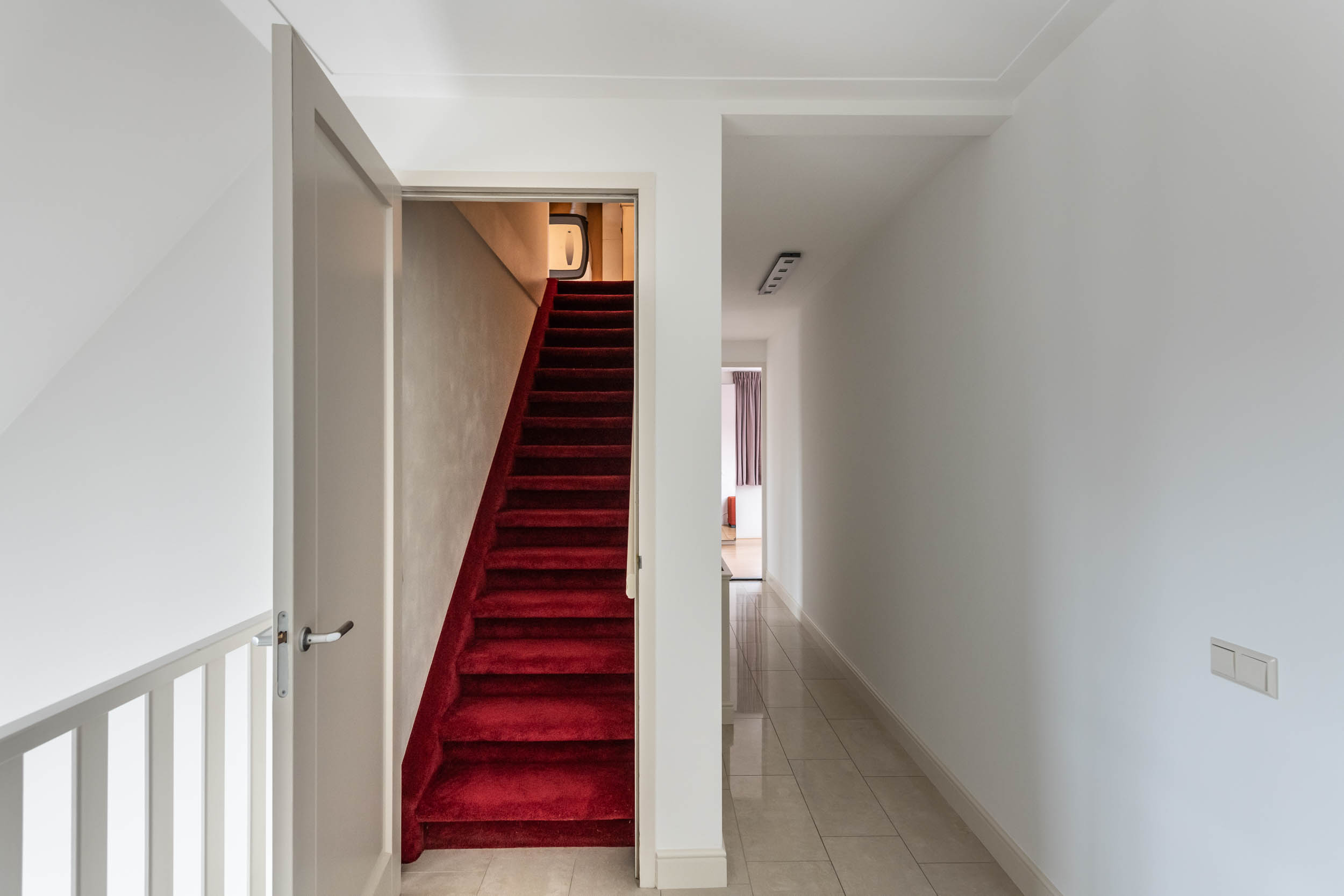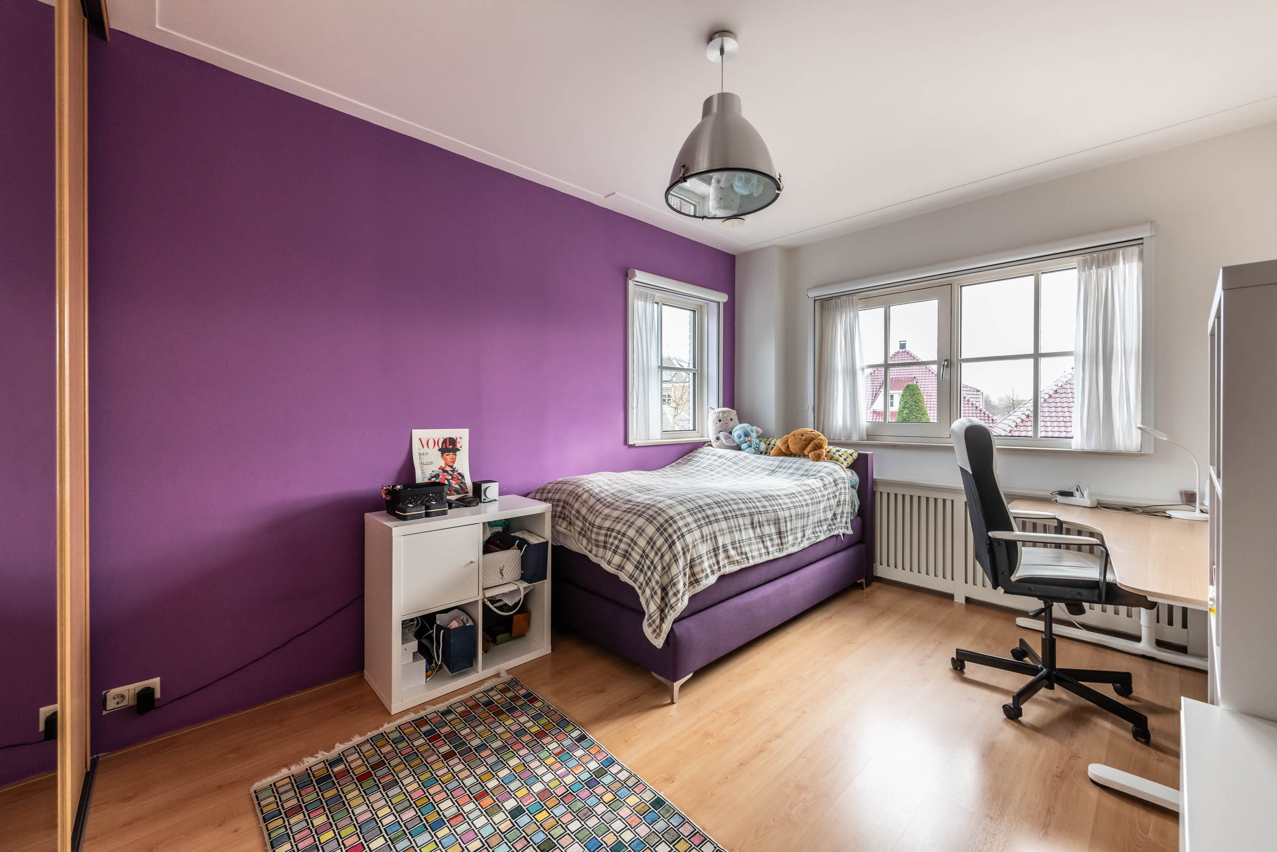 Inside, rooms are generously scaled, filled with light through large windows, and appointed for functional elegance: a SieMatic kitchen with cooking island, a living room warmed by a gas fireplace and built-in storage, and a utility room accessible from both kitchen and garage. The first floor includes four bright bedrooms, access to a roof terrace, and two sophisticated bathrooms—one with a sauna, the other with contemporary amenities. The attic provides versatile additional space and a private bedroom. Multiple international and English-language schools are nearby, and everyday needs are attended to with an installed alarm system, charging station for electric cars, and modern central heating.