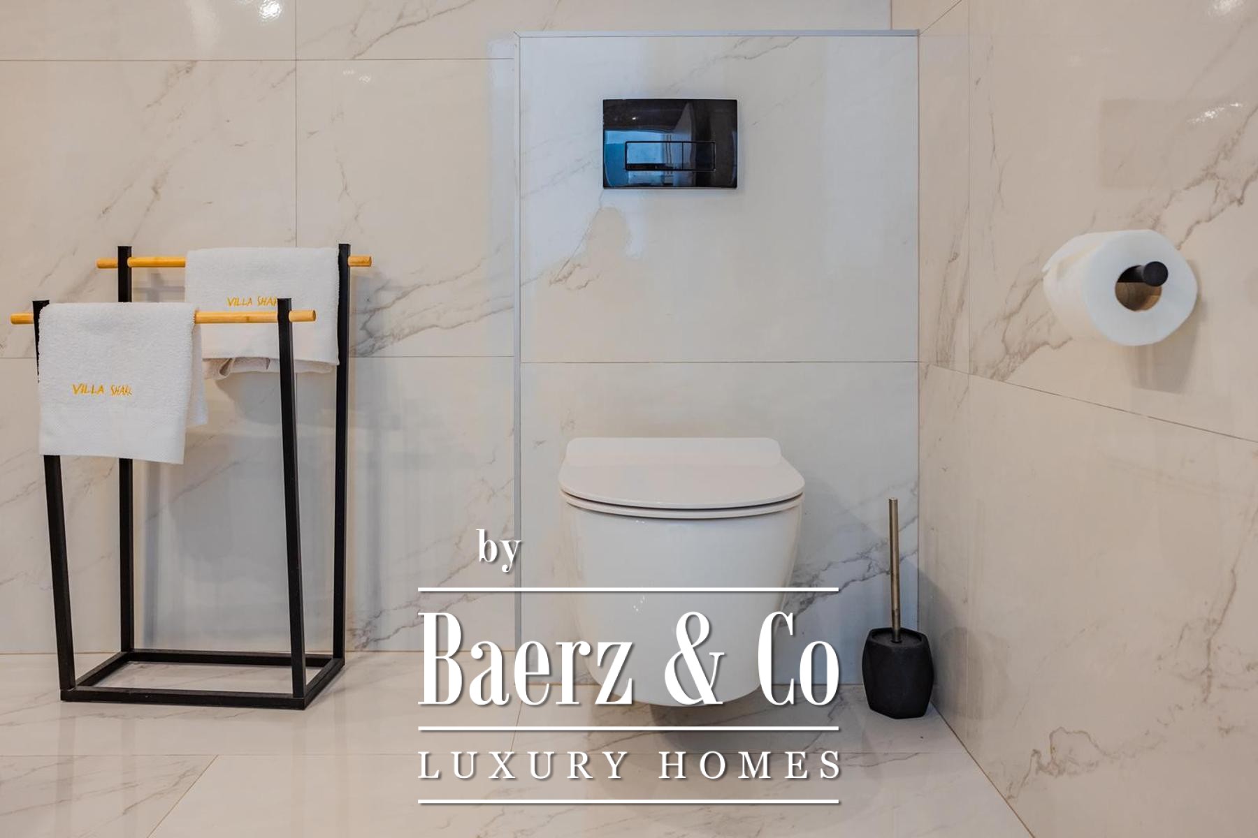 Set on a 531 m² plot, the villa spans three levels connected by an internal staircase and a lift, offering approximately 250 m² of refined living space. The ground floor introduces a children's bedroom, a bathroom, and a master suite with an en suite bathroom, anchored by an open kitchen, dining, and spacious living area. The living room flows onto a landscaped garden terrace crafted for respite and entertainment, featuring a swimming pool, sundeck with deck chairs, a covered lounge, bar, barbecue, and a children's playground.