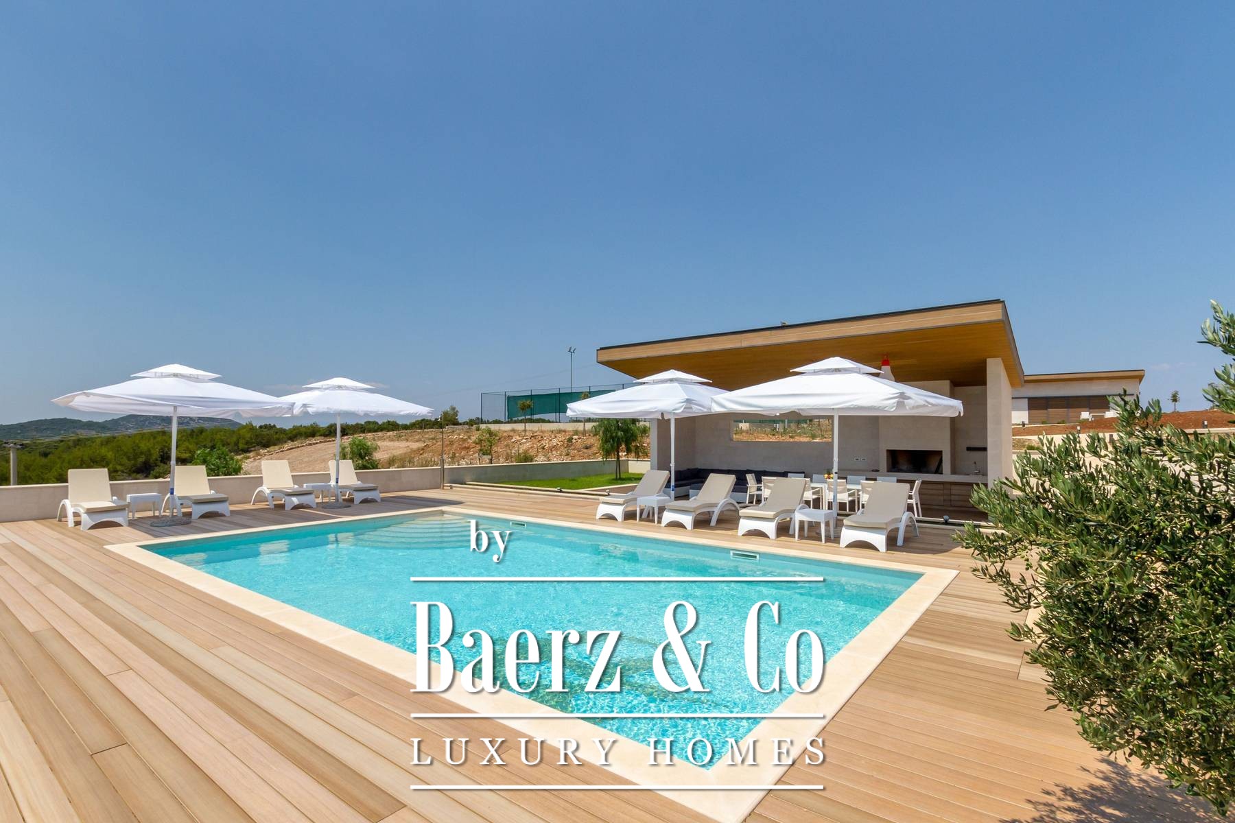 This amazing villa was built in 2014 and is located in a secluded location in the village of Zastražišće on the island of Hvar. It is positioned on a plot of 33,409 m2, while the total land area is 148,083 m2. In addition to complete peace, a view of the sea and untouched nature, it also offers an outdoor pool, tennis court, barbecue, hot tub, wine cellar, sauna and gym - in short, everything you could want for complete rest and enjoyment.The ground floor of the building consists of a living room, a kitchen with a dining room,