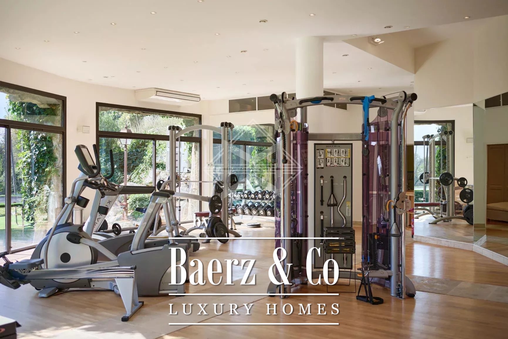 Outside, a free-form infinity pool blends seamlessly into the beautifully landscaped Mediterranean garden, complemented by a large fitness room with a climbing wall and relaxation area, pétanque court, a tennis court and three enclosed garages, all set on a 16,709 sqm plot.