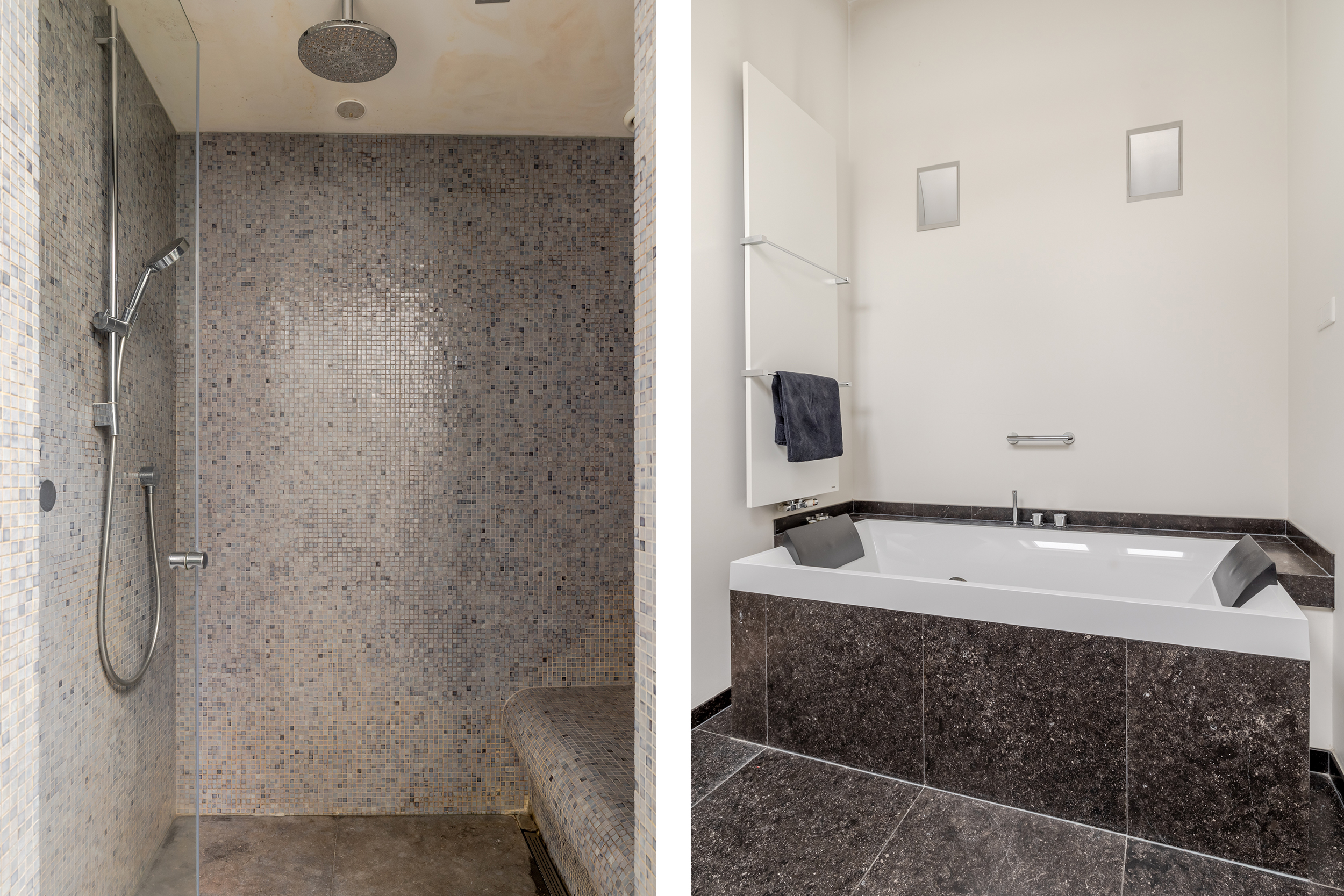 Luxury bathroom (approx. 3.85 x 2.95 m) featuring a bathtub, vanity unit, a large walk-in shower (partially finished in natural stone) with both rain and hand showers, and a designer radiator.