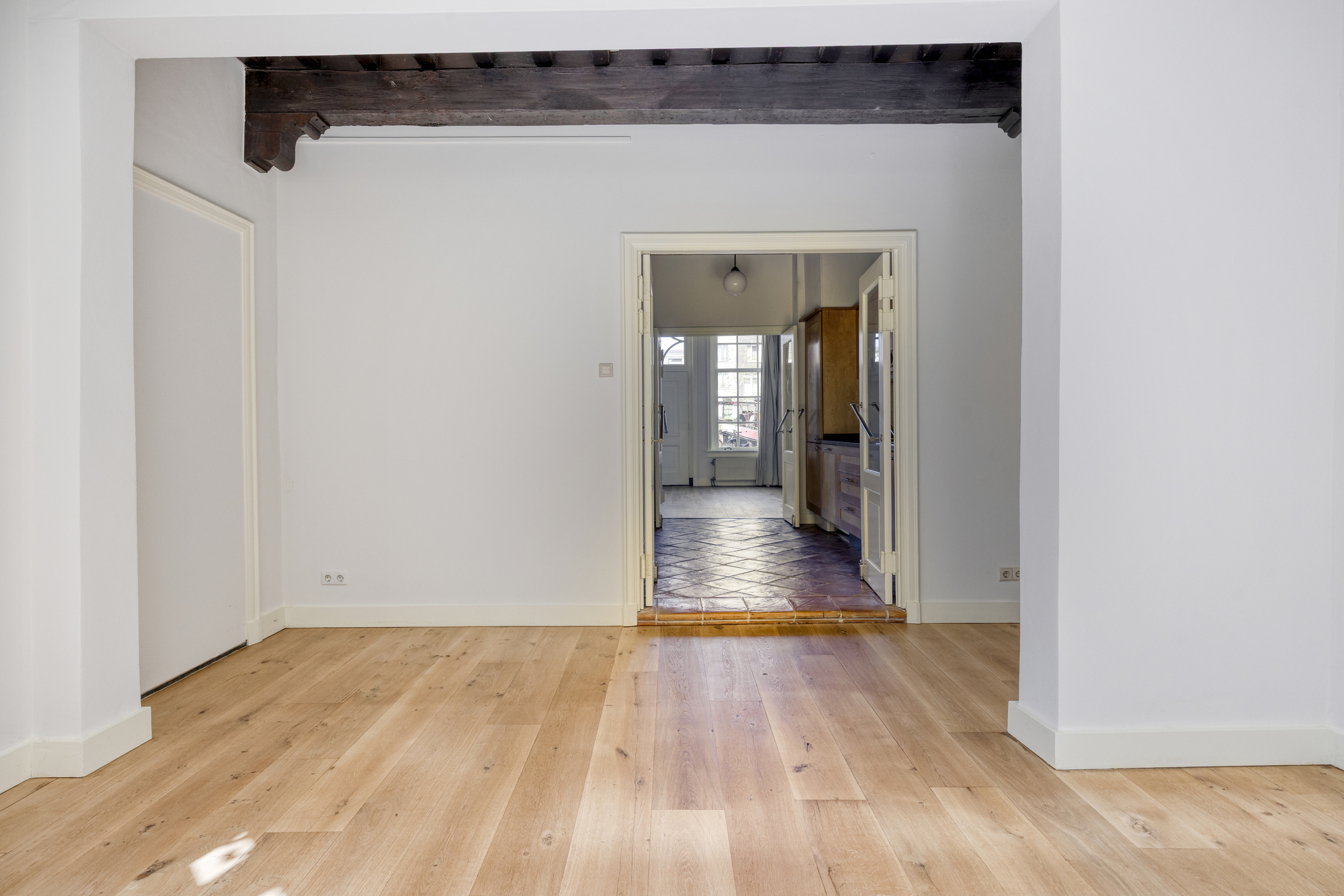 Kamer voorzijde met authentieke details en tuinkamer met openslaande deuren en binnendoor naar nr. 11. Keuken met inbouwapparatuur en badkamer met ligbad. wastafel en wc.