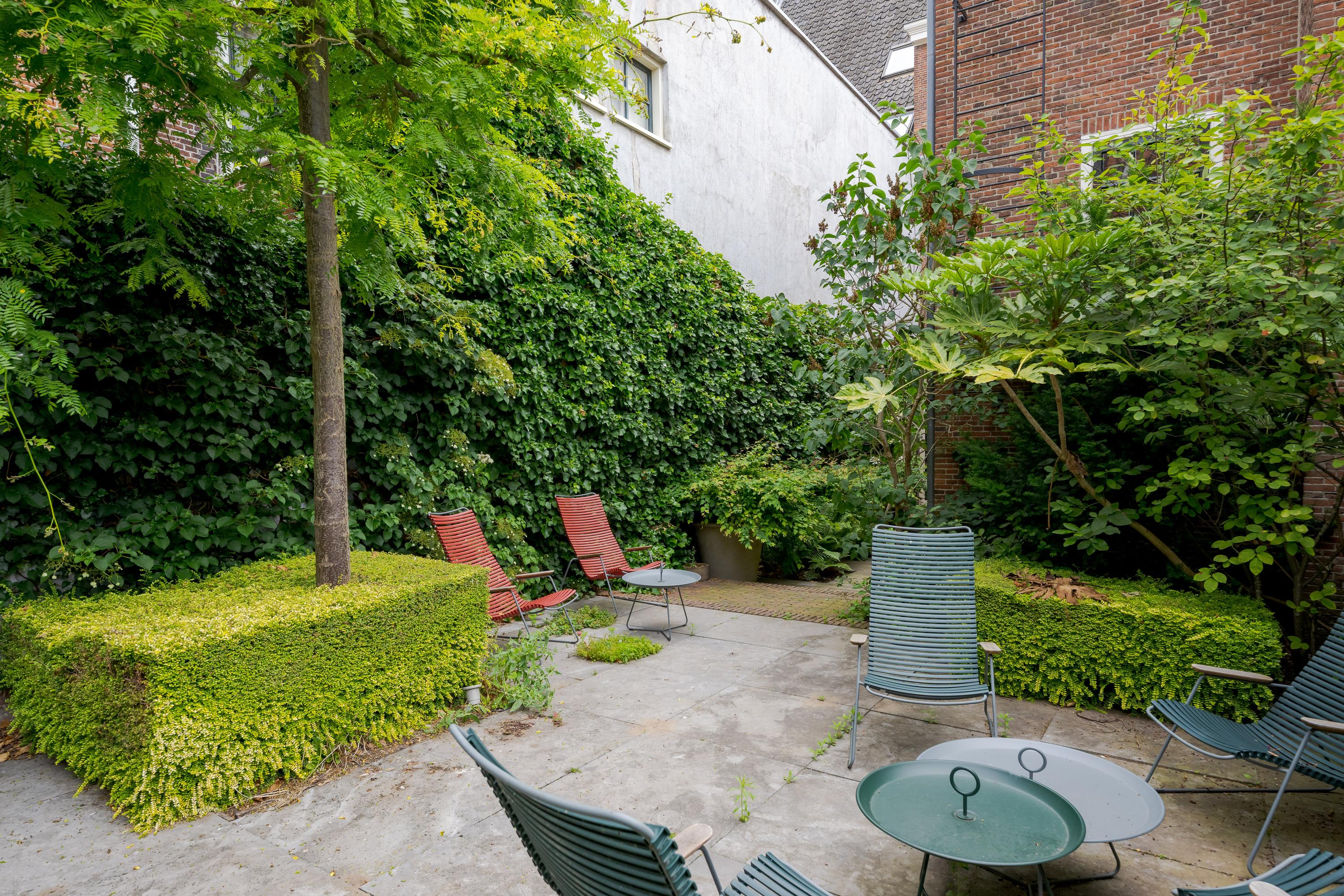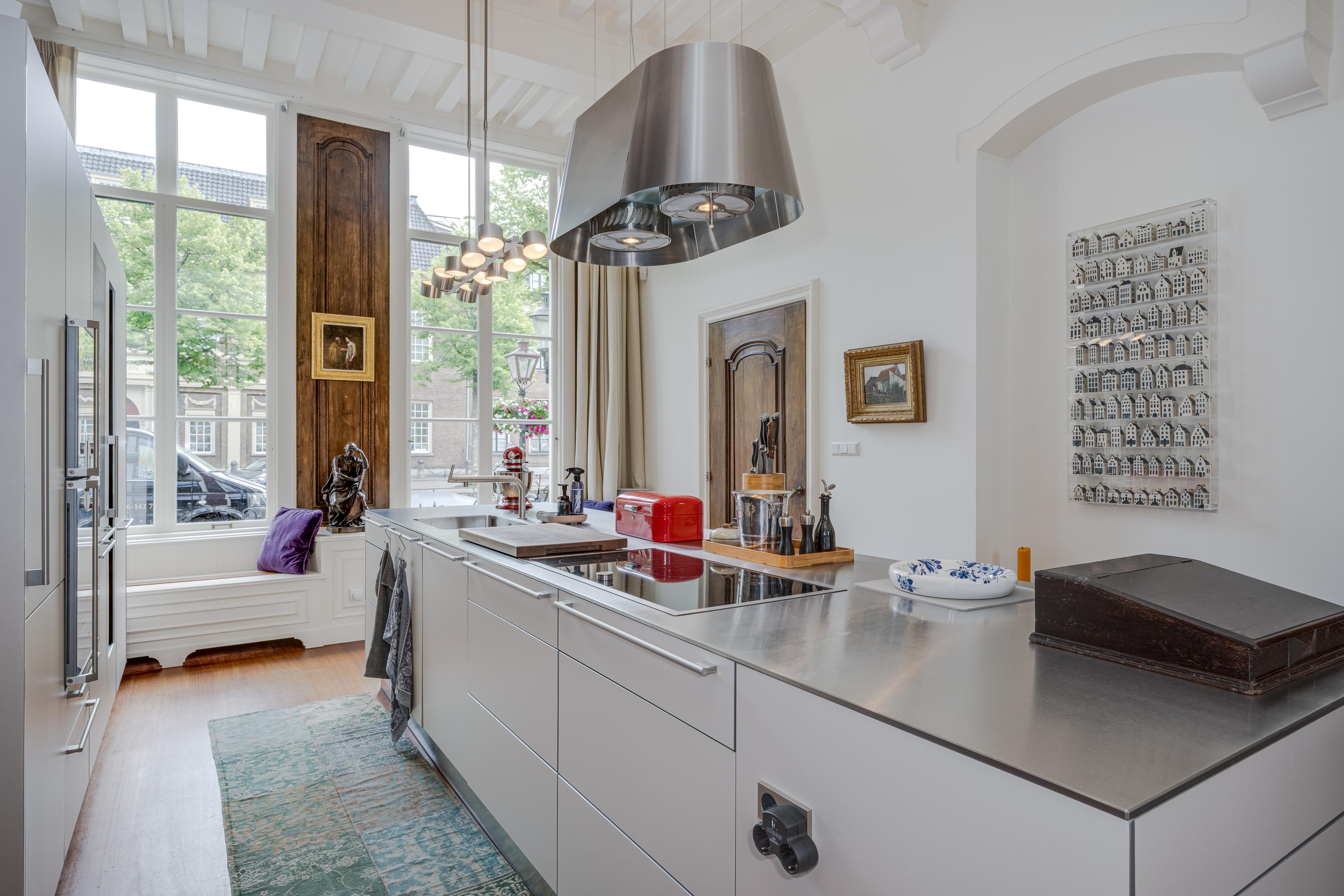 Upon entry, spacious and luminous interiors invite calm; beamed ceilings, Delft Blue tilework, and a remarkable staircase create an authentic sense of place. A Bulthaup kitchen flows to the west-facing city garden, mature and quietly secluded. The first and upper floors bring six rooms suited to family life, work, or refuge, with three bathrooms throughout. At the rear, a private terrace connects the master suite with the sky above, while the living spaces draw in canal views and urban rhythm.