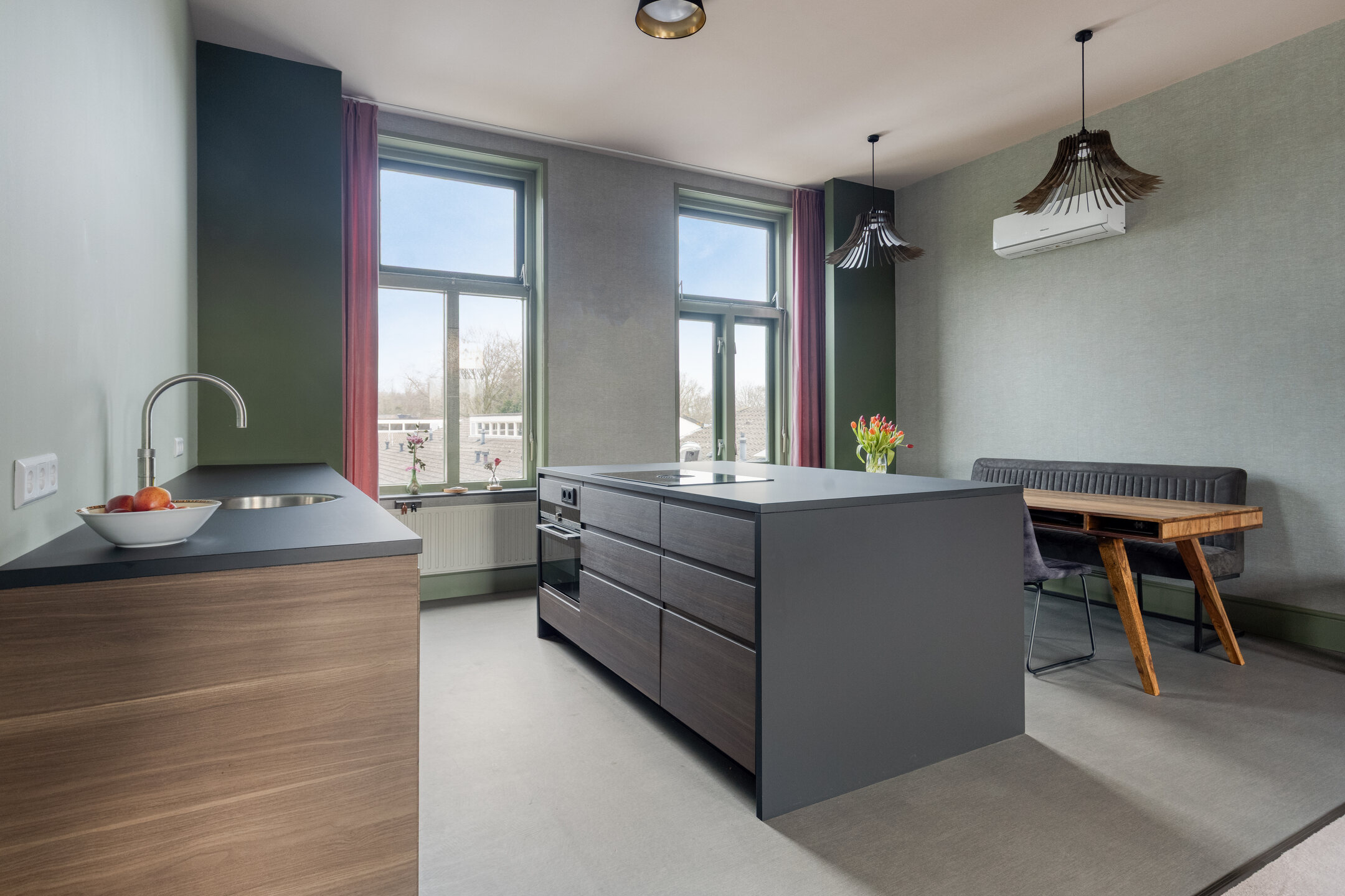 Open kitchen with fitted units, cooking island and bar area, composite worktop with sink, built-in induction hob with integrated extraction system, refrigerator drawer, combination oven/microwave, and dishwasher; plastered walls, vinyl flooring, plastered ceiling; steps and door to attic space
