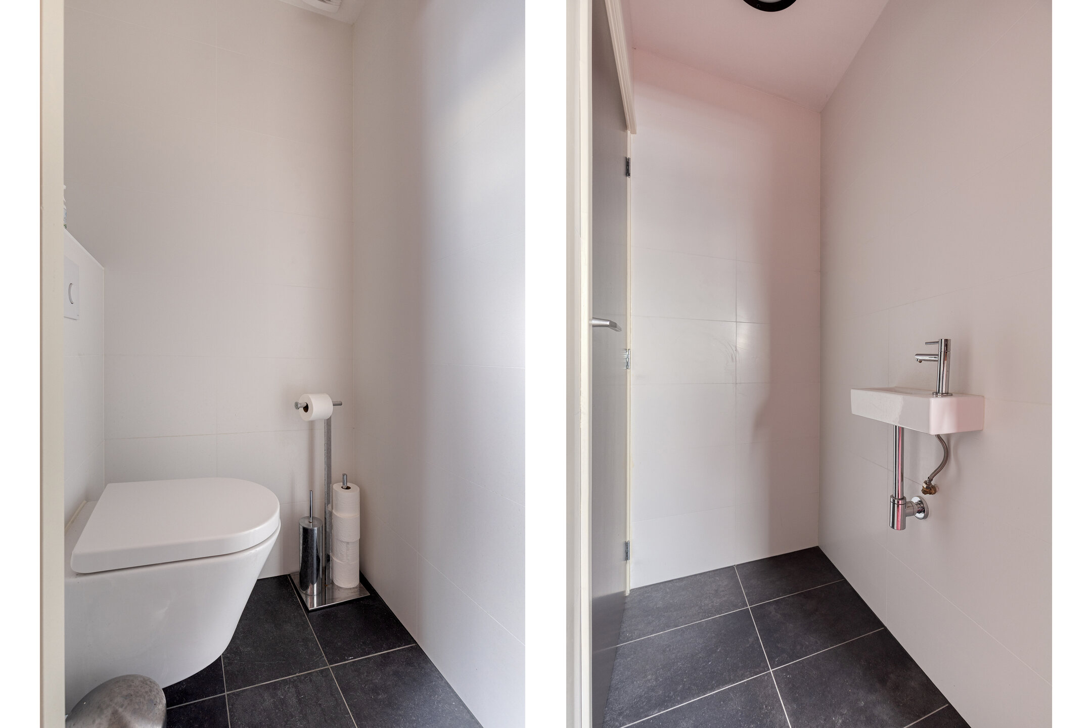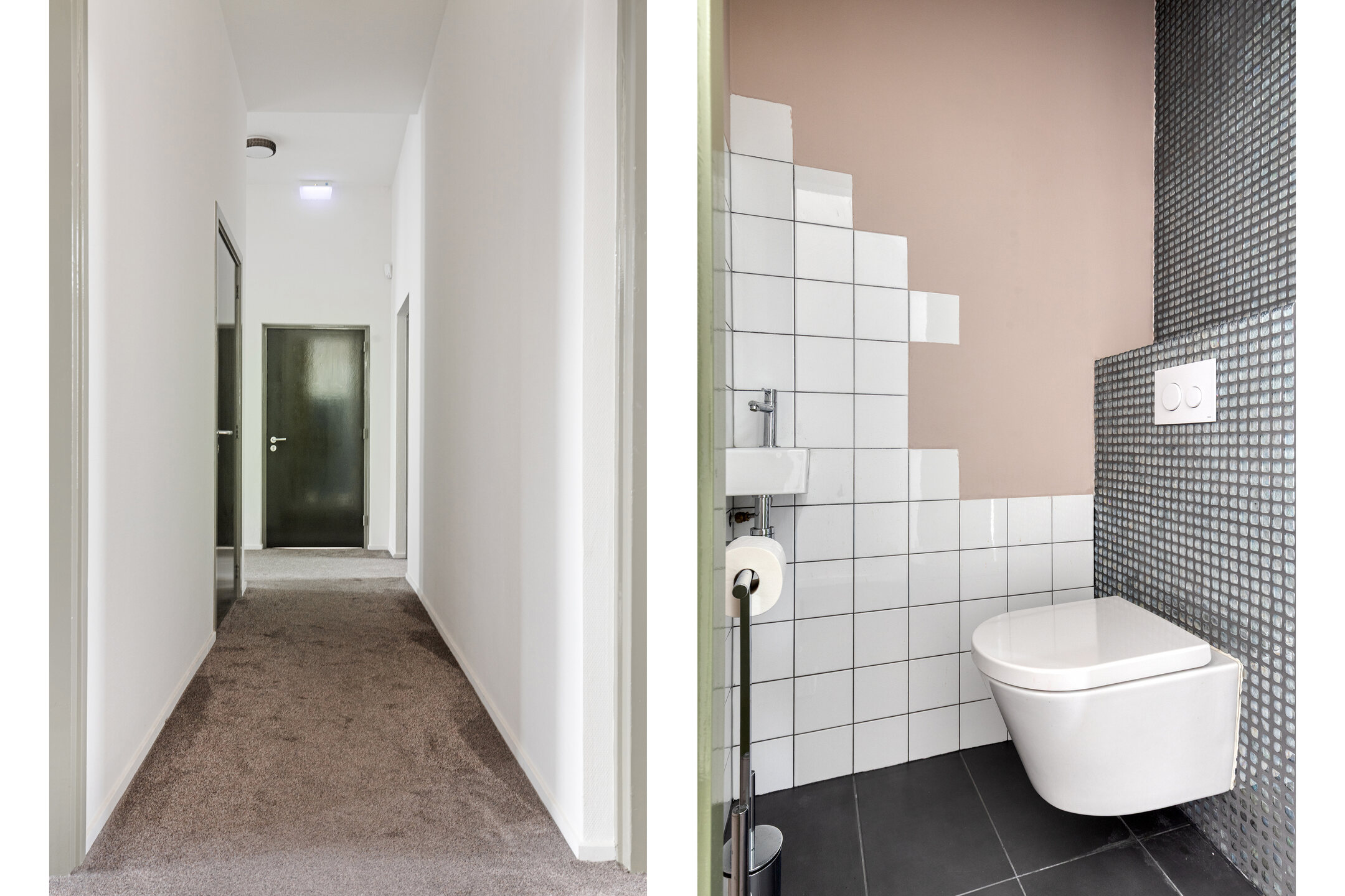 Separate tiled toilet with wall-mounted unit