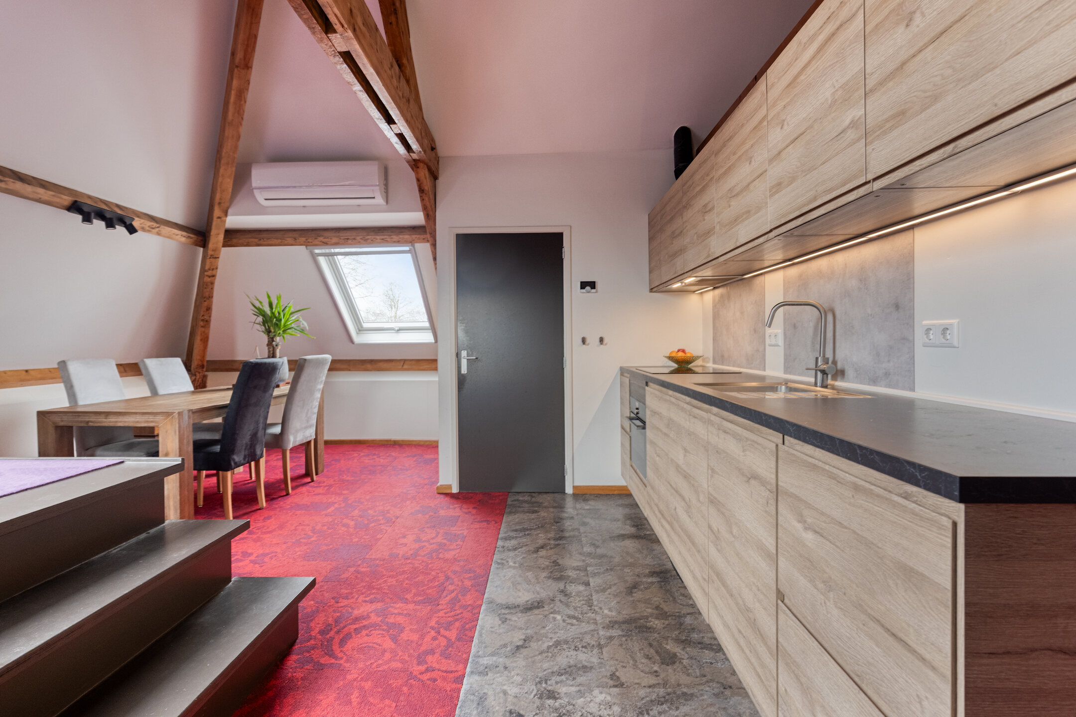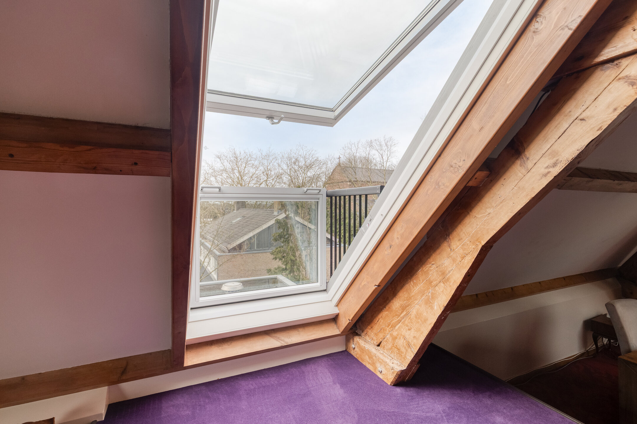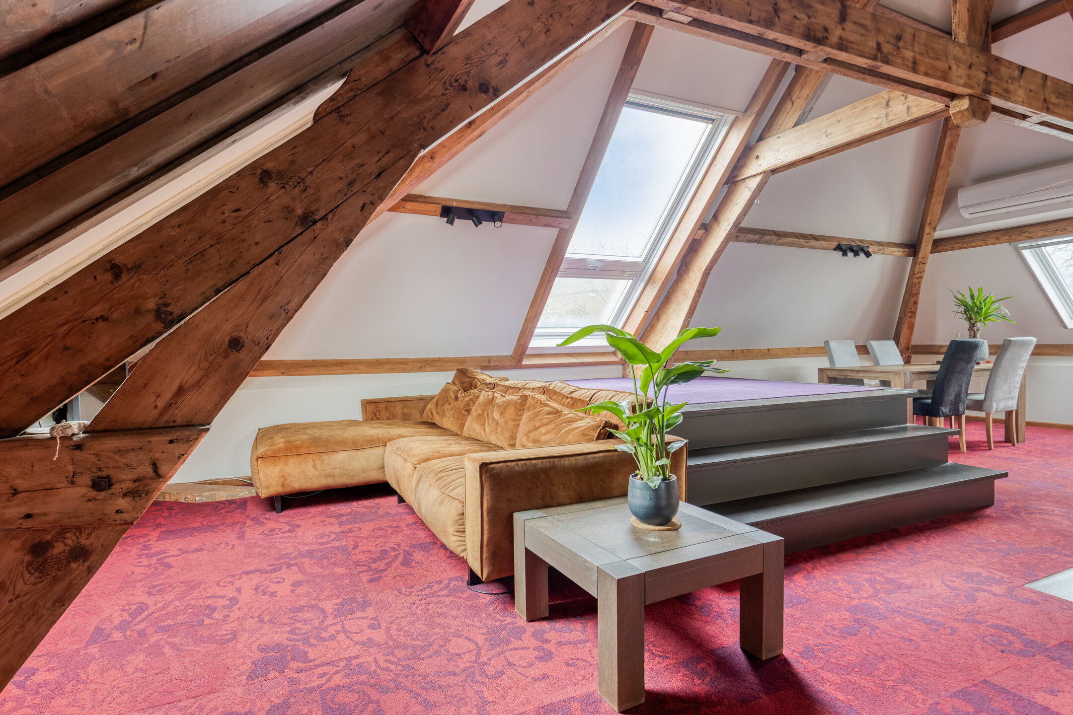 Living room with Velux skylights including blackout blinds and insect screens, air conditioning, and a Velux balcony window; plastered walls, carpeted floor, visible roof structure