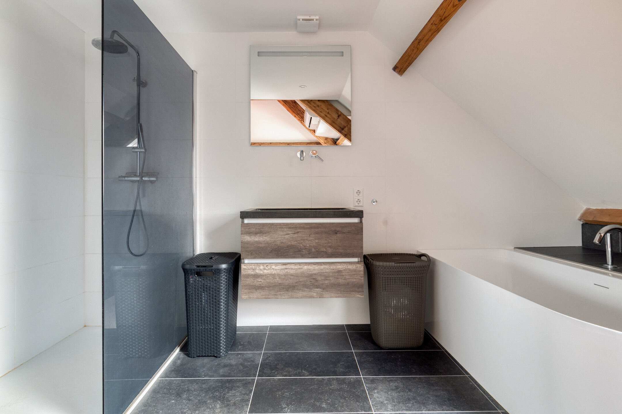 Tiled en-suite bathroom with walk-in shower, bathtub, and vanity unit