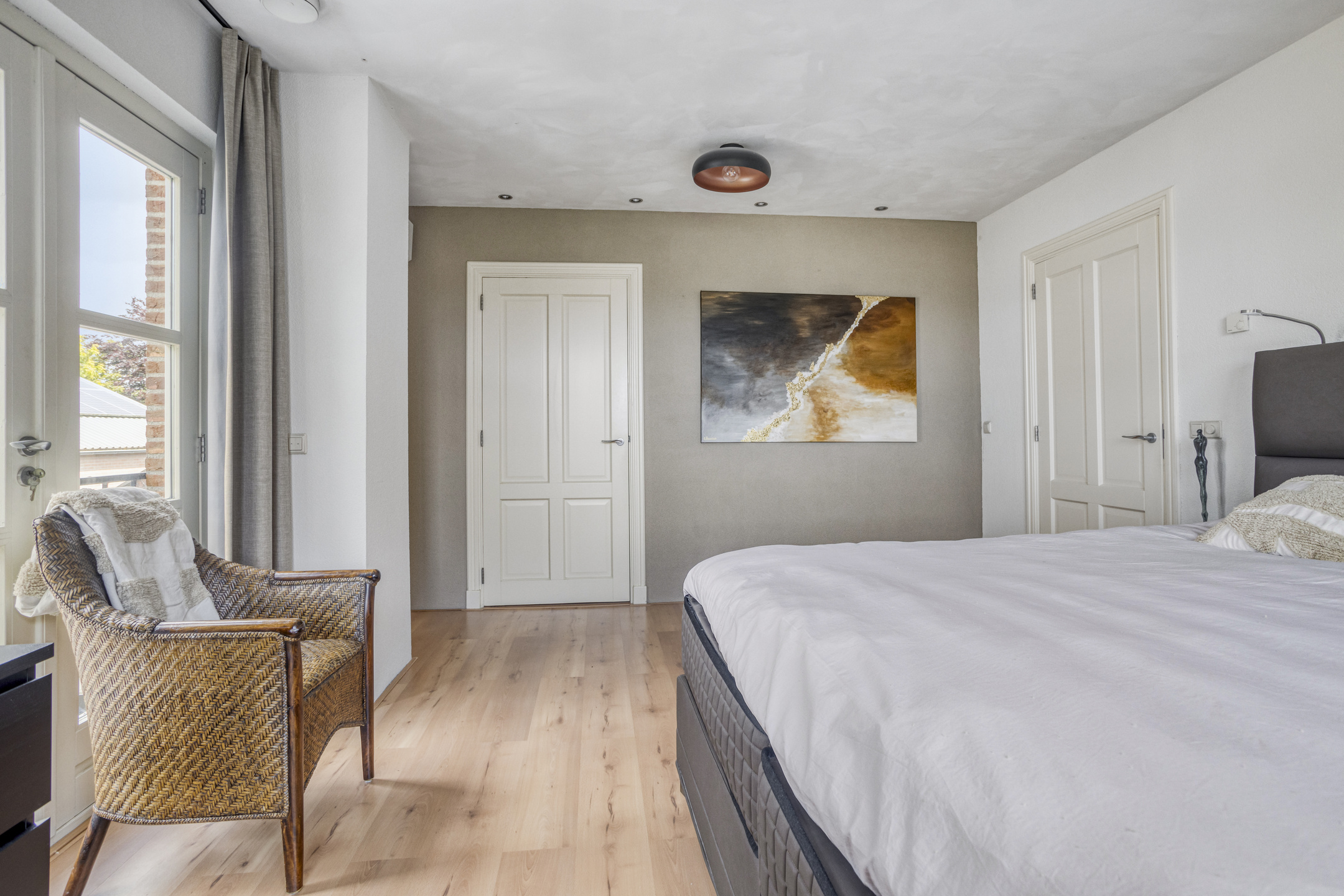 hoofdslaapkamer (ca. 28,5 m²) met een loggiabalkon, airco-installatie en een inloopkast, wandafwerking sierpleister, vloer afgewerkt met laminaat, schuurwerk plafond;