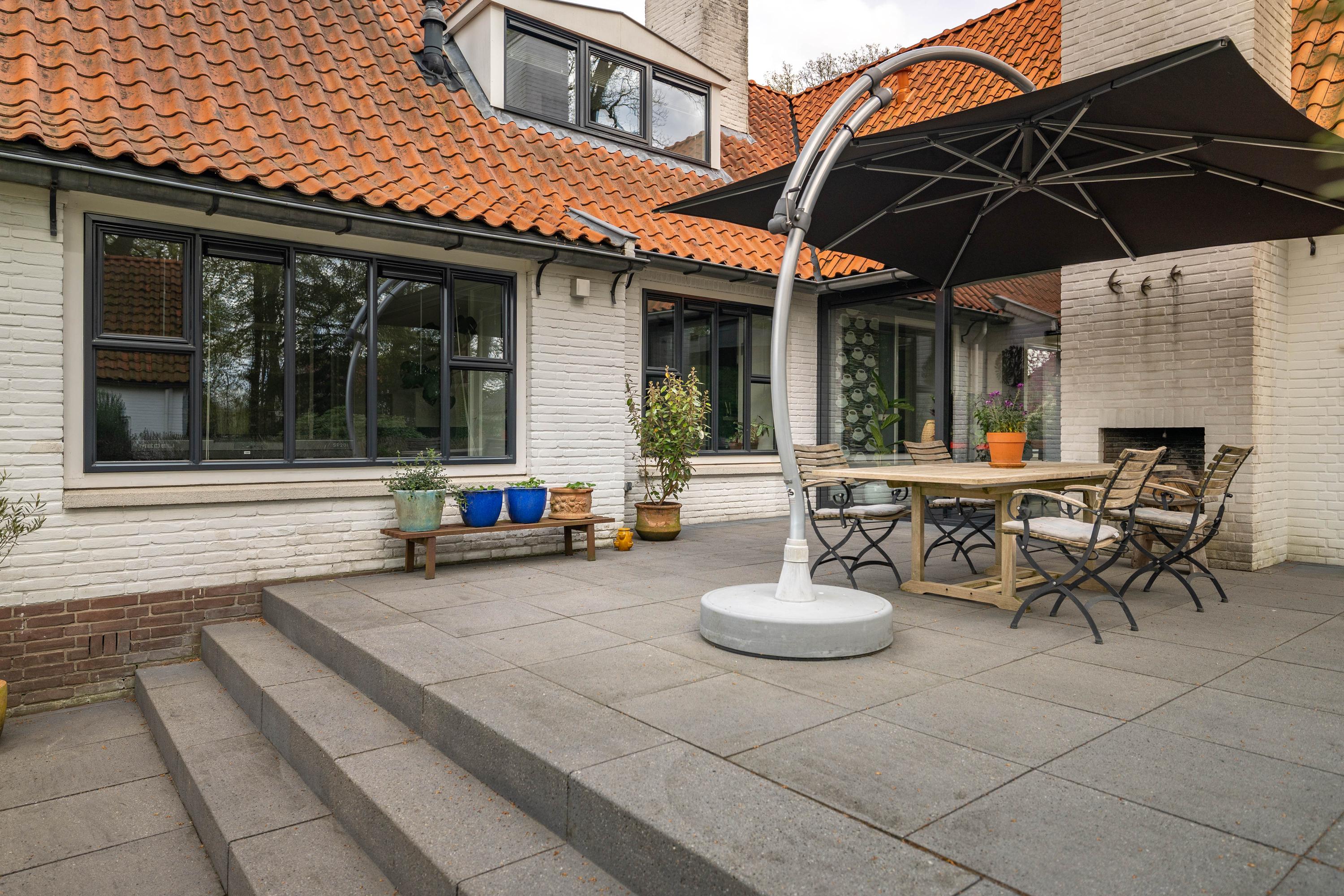 At the rear of the house lies a wonderful garden with expansive lawns, large laurel hedges, beautifully landscaped borders and attractive terraces. One terrace behind the kitchen features a charming outdoor fireplace, providing a delightful setting for long summer evenings with family and friends. There is also a cosy veranda with a large terrace and ample space for a lounge set.