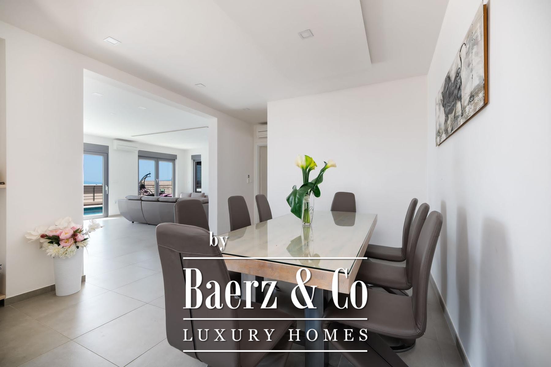 Villa Makarska occupies an elevated position, delivering panoramic views across the sea and the historic town below. This villa in Makarska stretches across 450 m² of living space, integrated into a 448 m² plot that articulates a clear connection between interior and exterior living. The south-facing orientation ensures constant natural light in every principal room, enriching daily life with views that shift from dawn to evening.